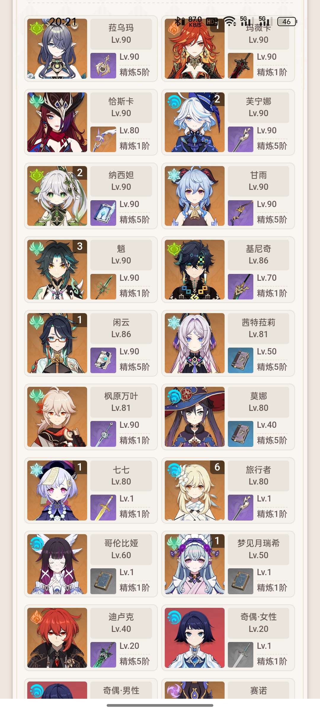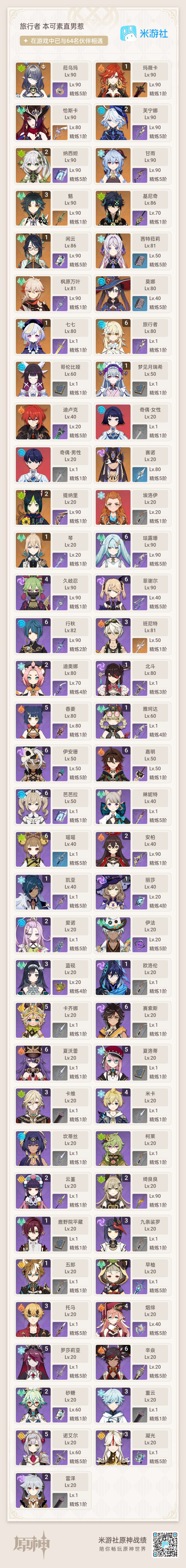 3+1魈,2命水神,2命草神,1命火神,1命闲云,少女哥伦比亚,菈乌玛,茜特菈莉,基尼奇,万叶等角色