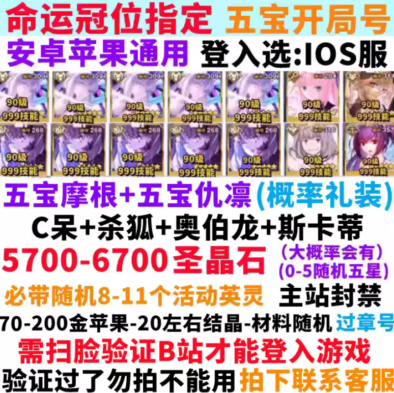 哔哩哔哩/taptap/苹果官方/ 账号已发的为主 个别需要自行切换下服务器登陆 有部分记得领取还有任务需要领取 每个账号都随机自带SR从者 账号内 总圣石[包括自带圣石和呼符]呼符 (10护符商店自领) 友情点 抽完任务资源领取 以上一共抽数 抽数最高误差不会过俩百抽 个别死绑账号介意勿拍 账号以发的号资源为主 秒发货 秒发货