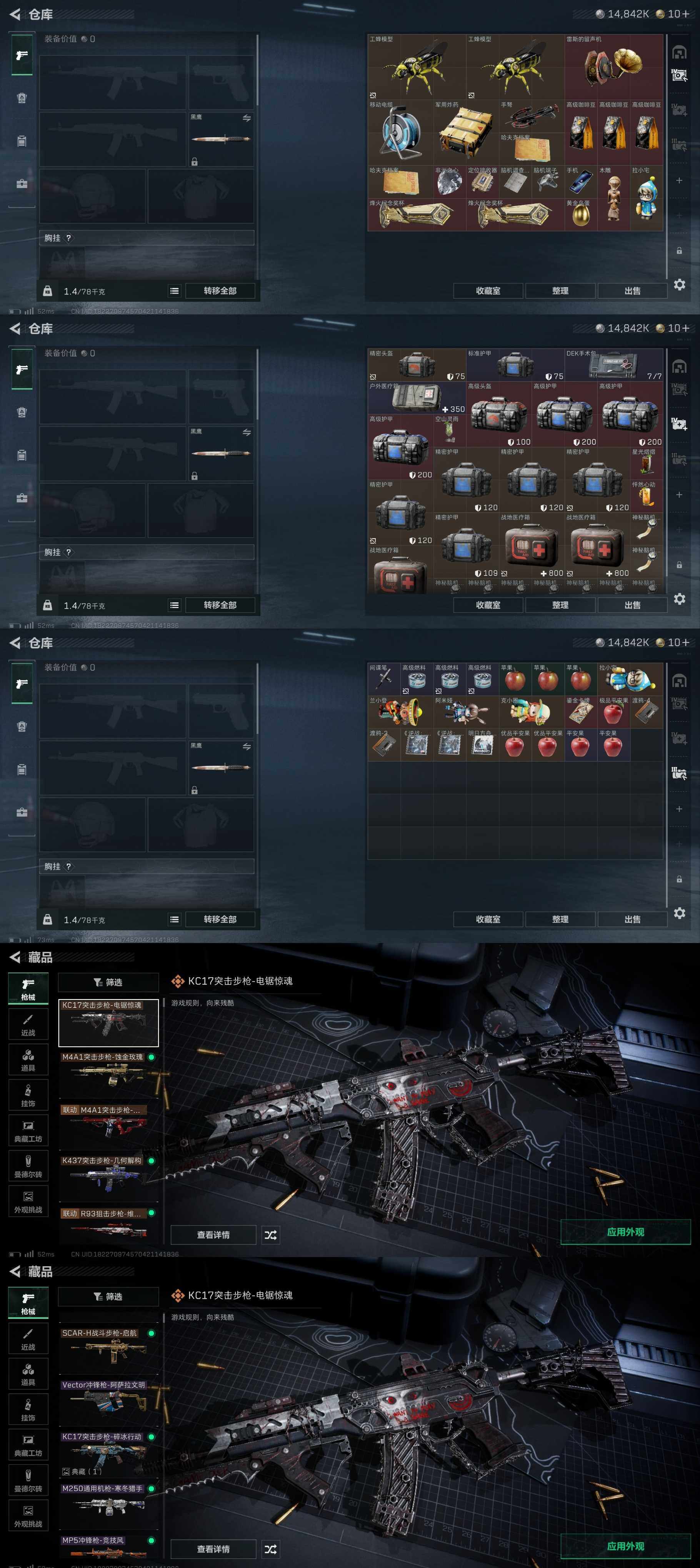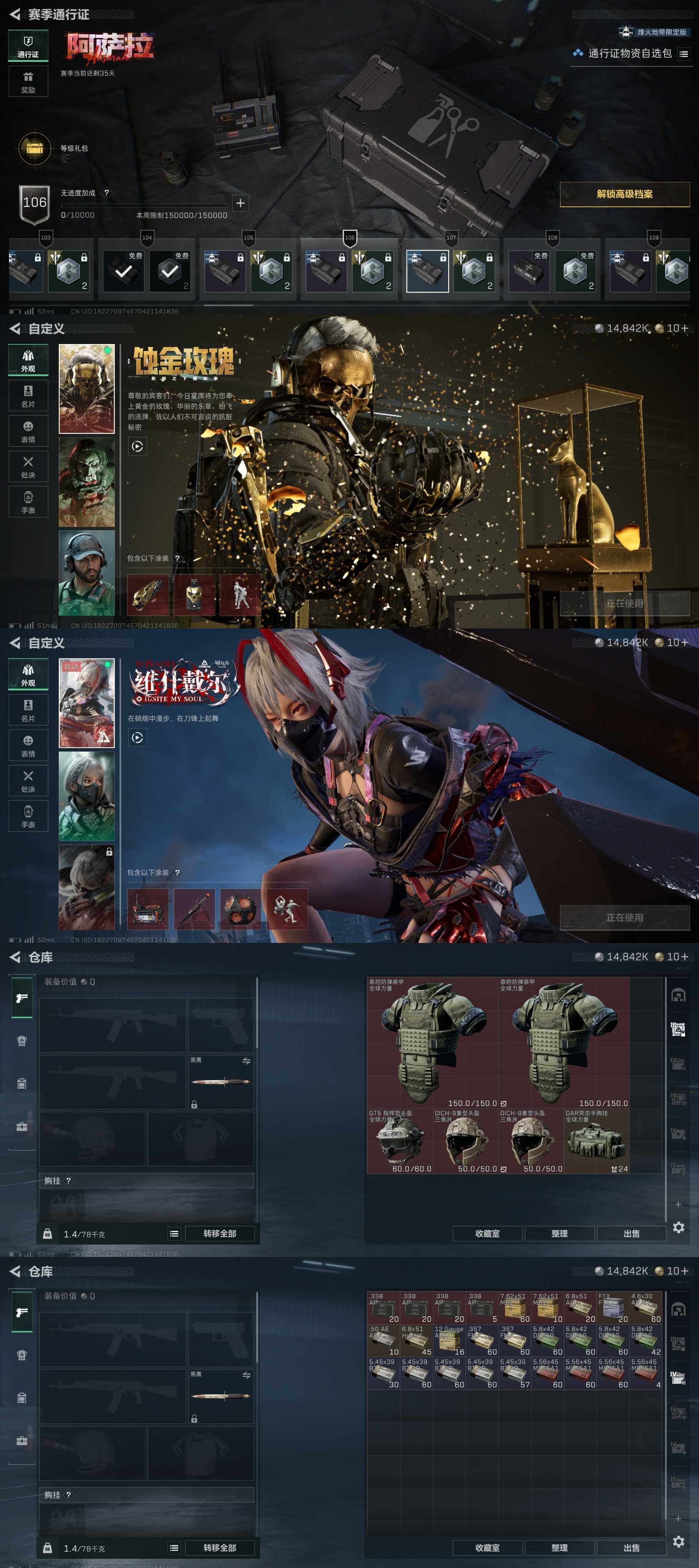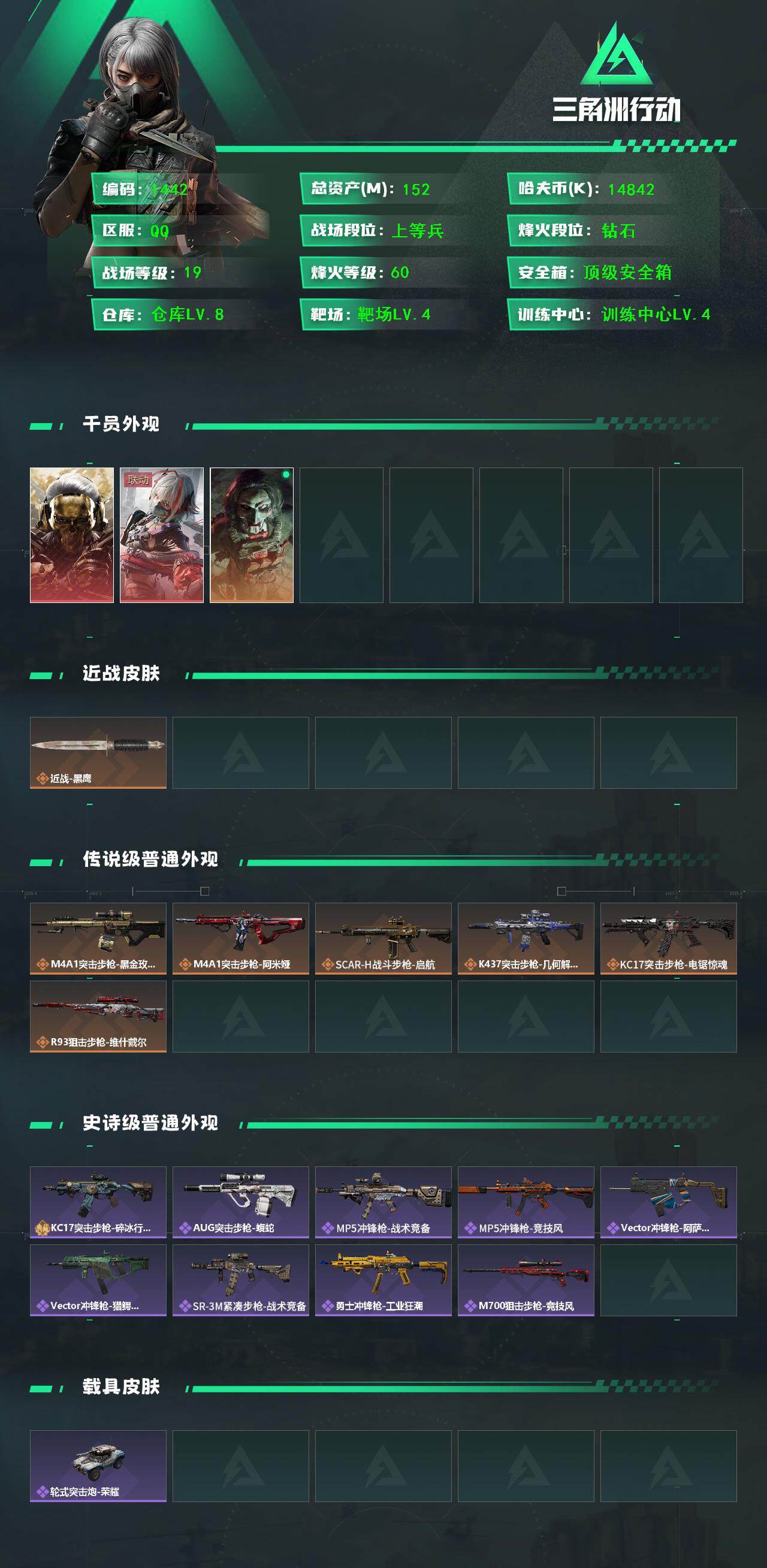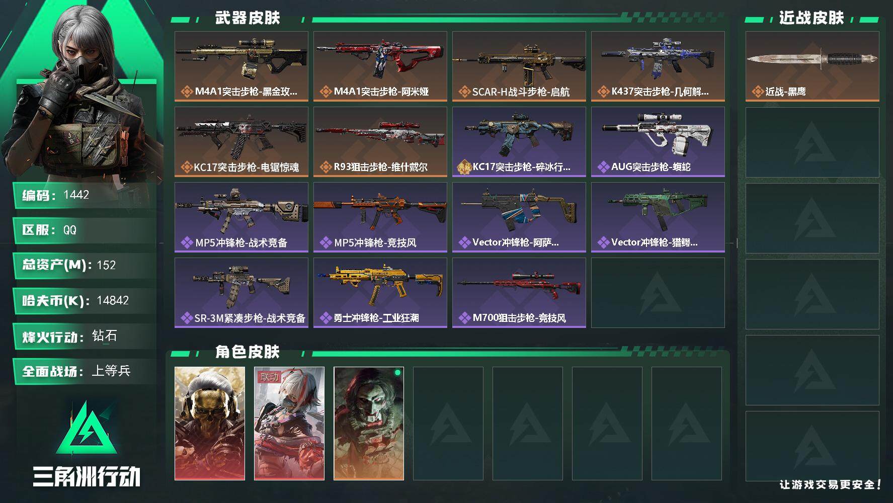 总资产(M):152M/哈夫币(K):14842K/哈夫币(K):14842K/传说枪皮数:6/全面