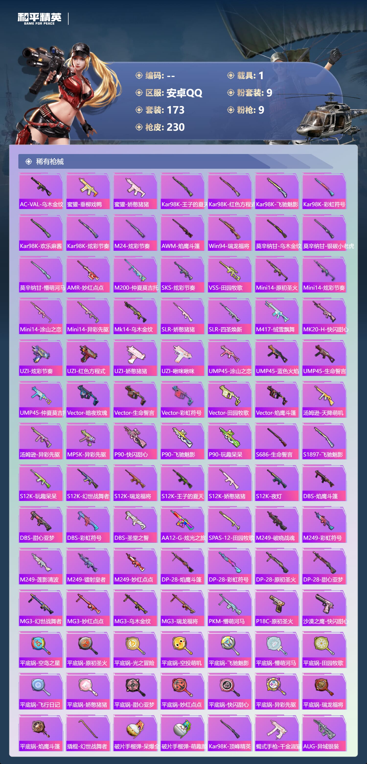a4150/安卓QQ/-17王牌印记-9粉装-9特效枪-1载具-78861热力值-173套装-230