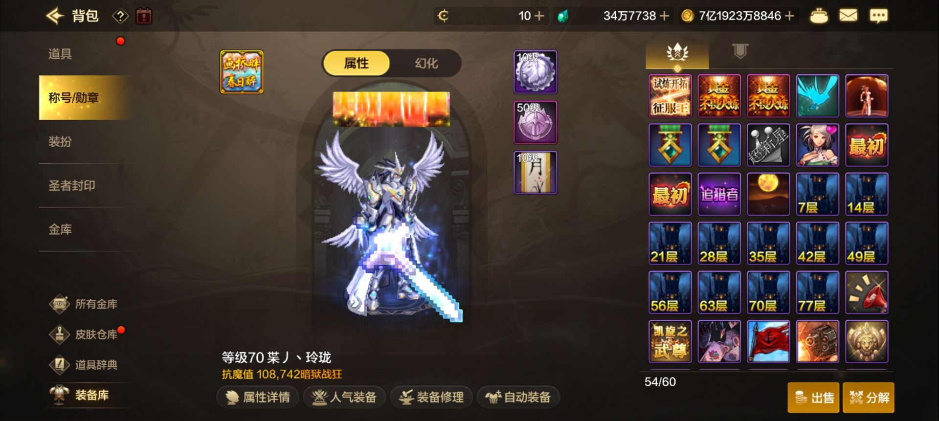 武器全部强化20 时装光环称号都有 红豆都100多 前10角色都是8伤害宠物 仓库账绑红豆200多