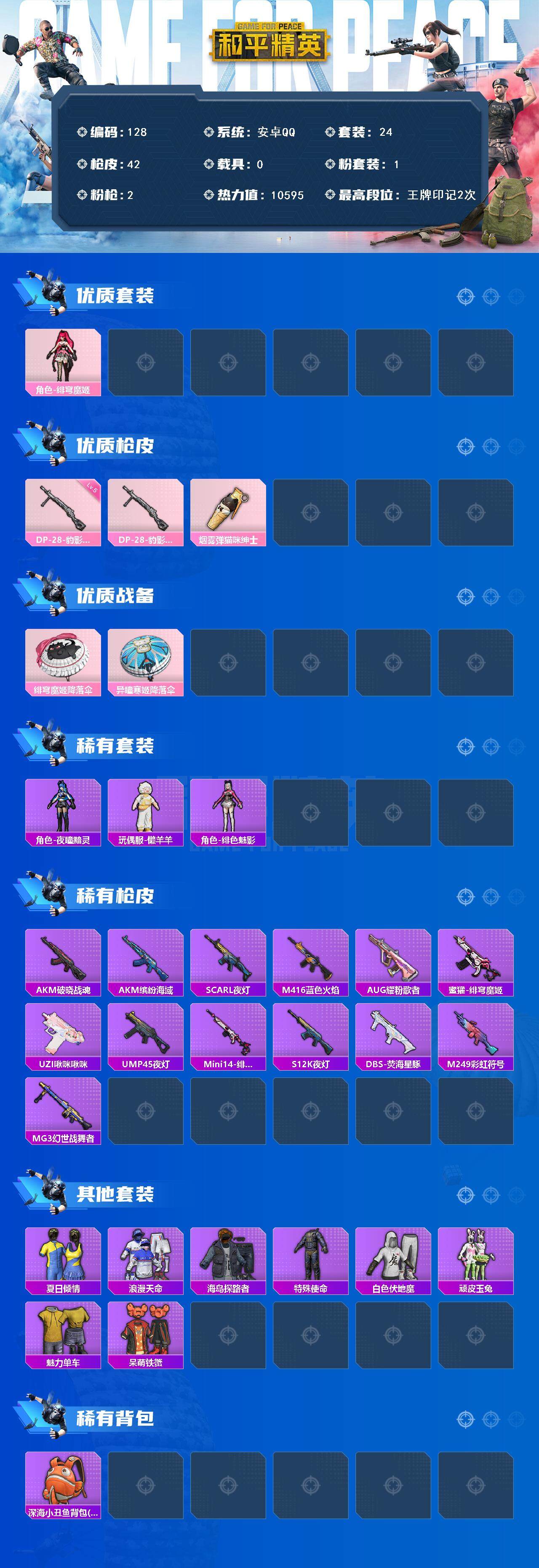 安卓 手Q-1粉装-2特效枪-0载具-1粉色飞行器-10595热力值-2王牌印记-24套装-42枪皮