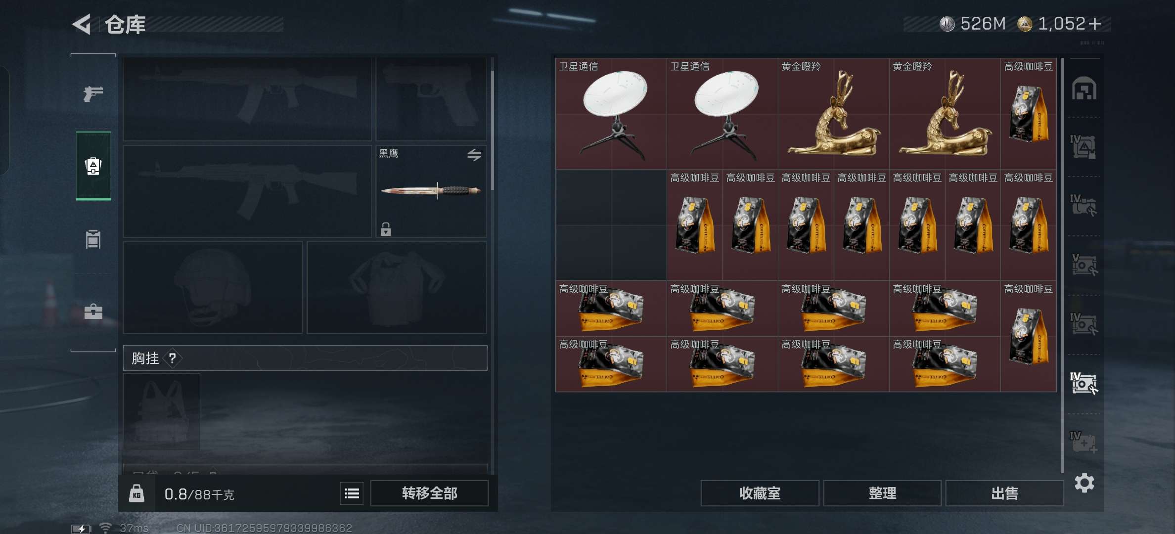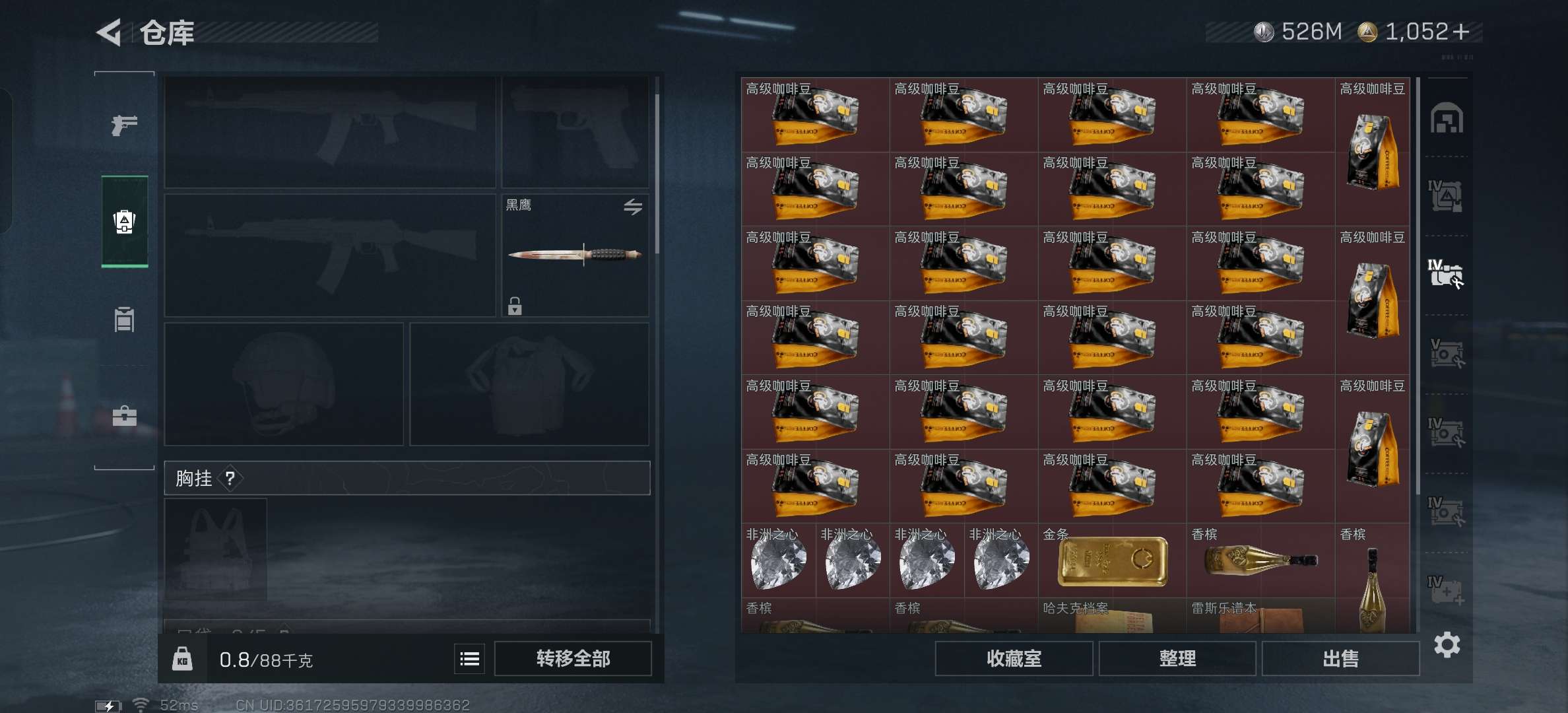 红狼,露娜,峰医,无名金皮。9格保险,4颗非洲之心,44个咖啡豆,还有1052点券。