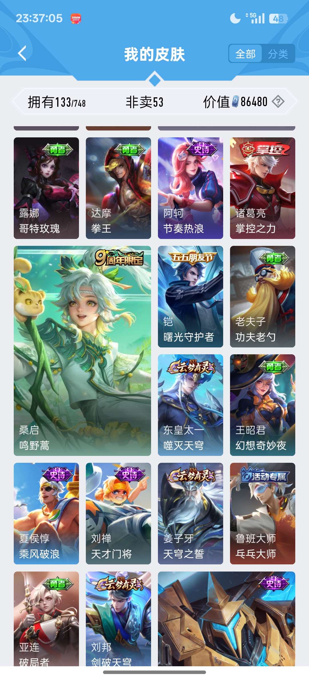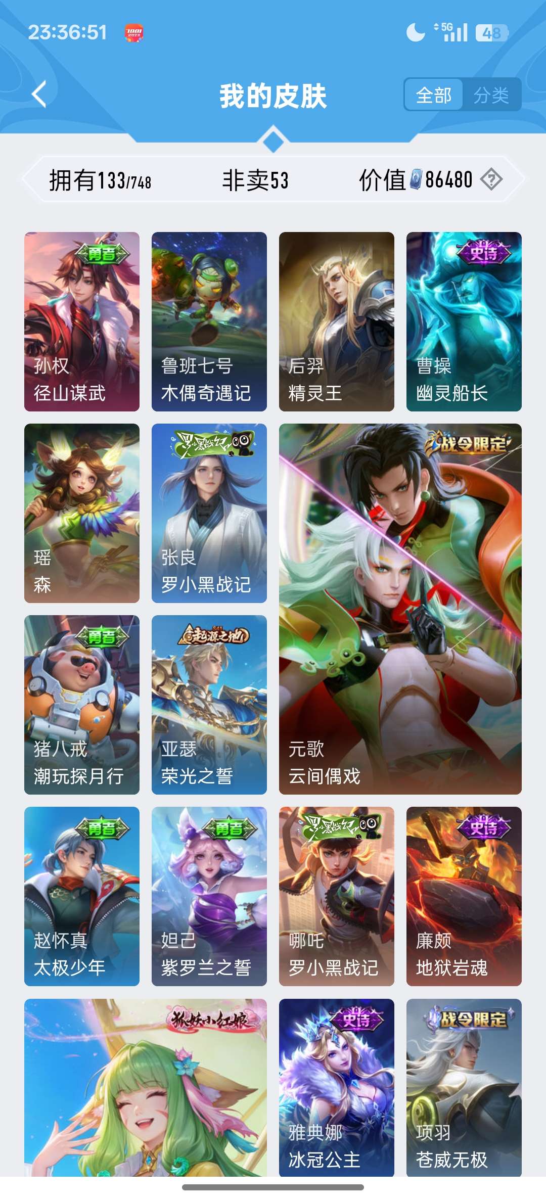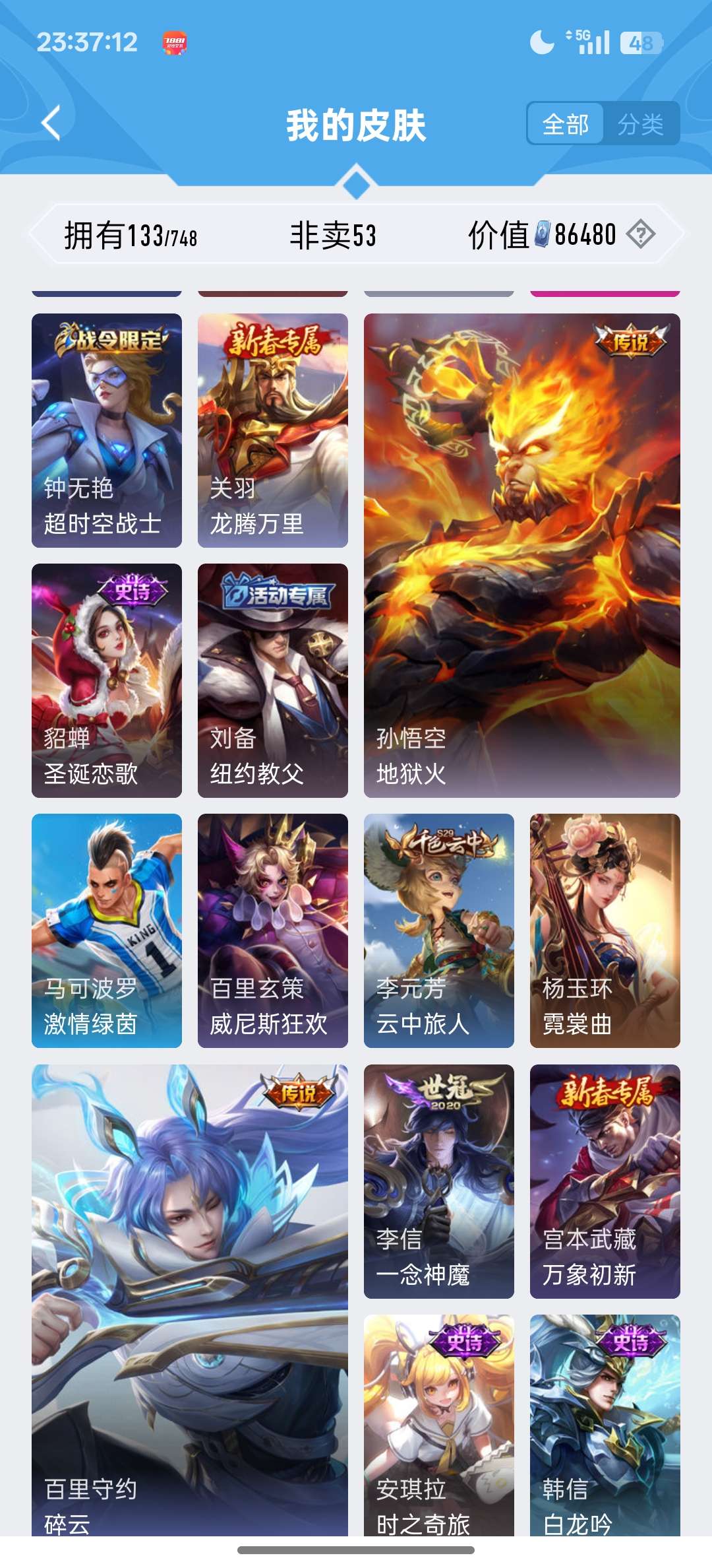 安卓QQ 皮肤133 英雄123 珍品传说2 传说10 其他皮肤44 非凡王者-有暃的珍品传说,v6还差点v7