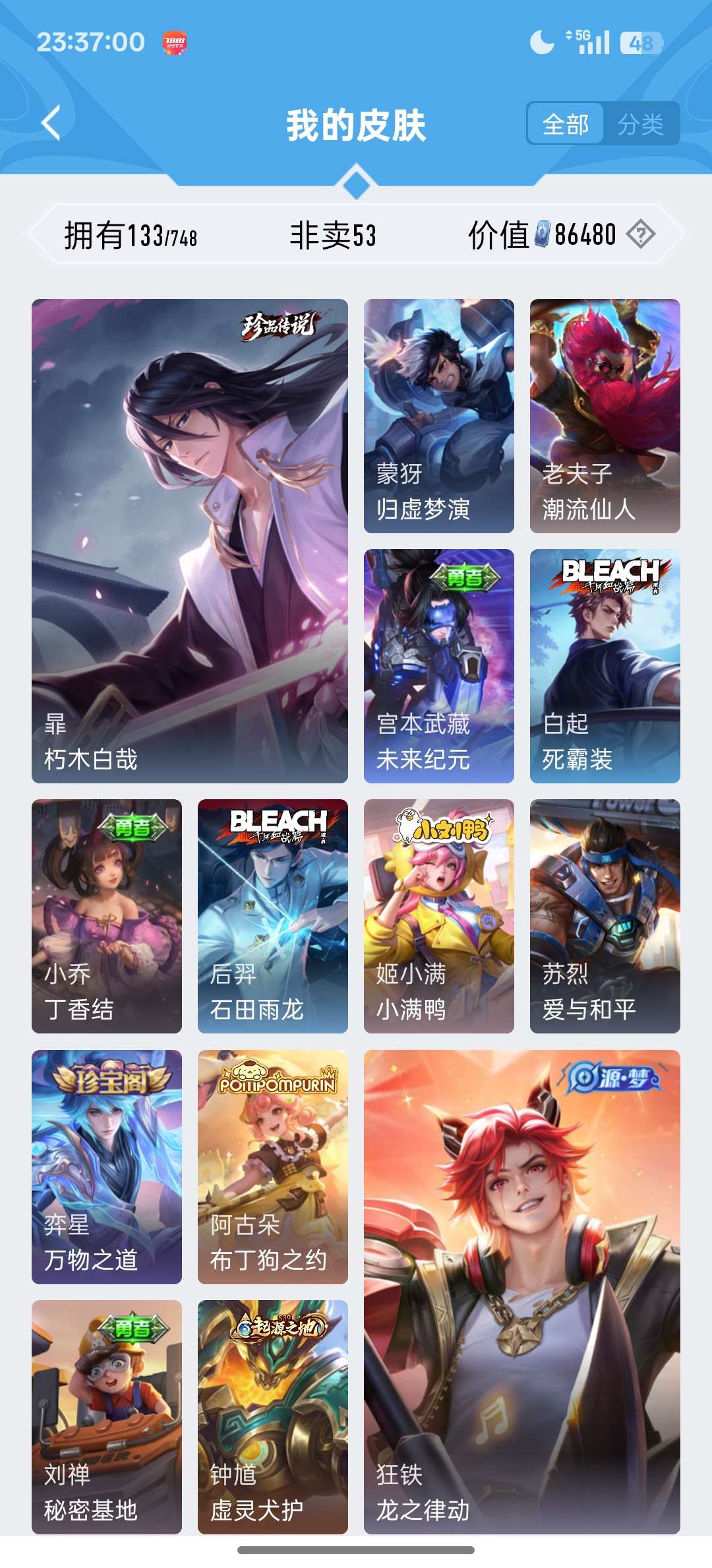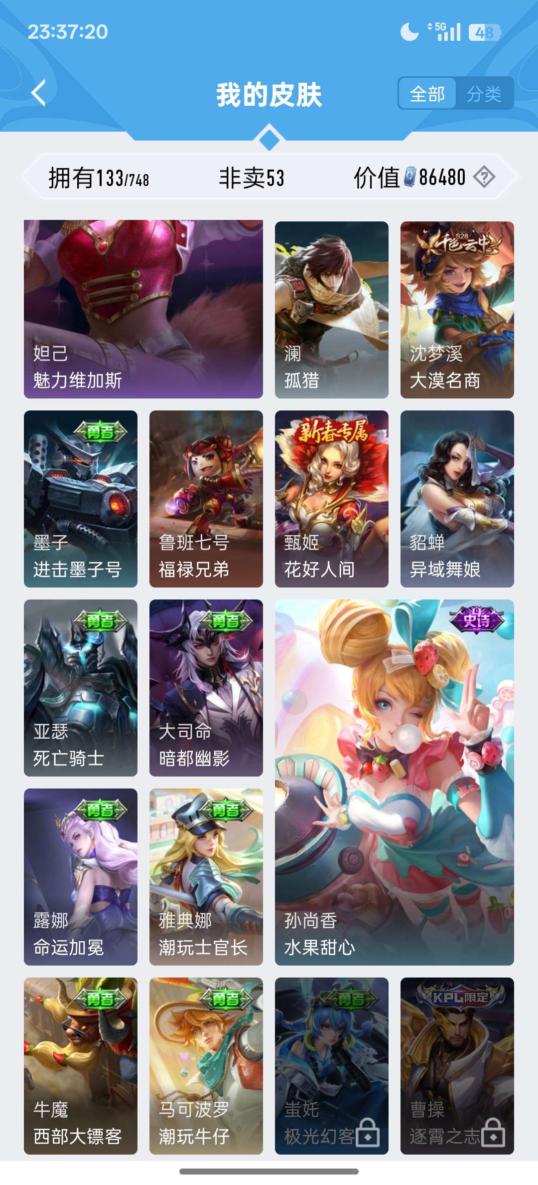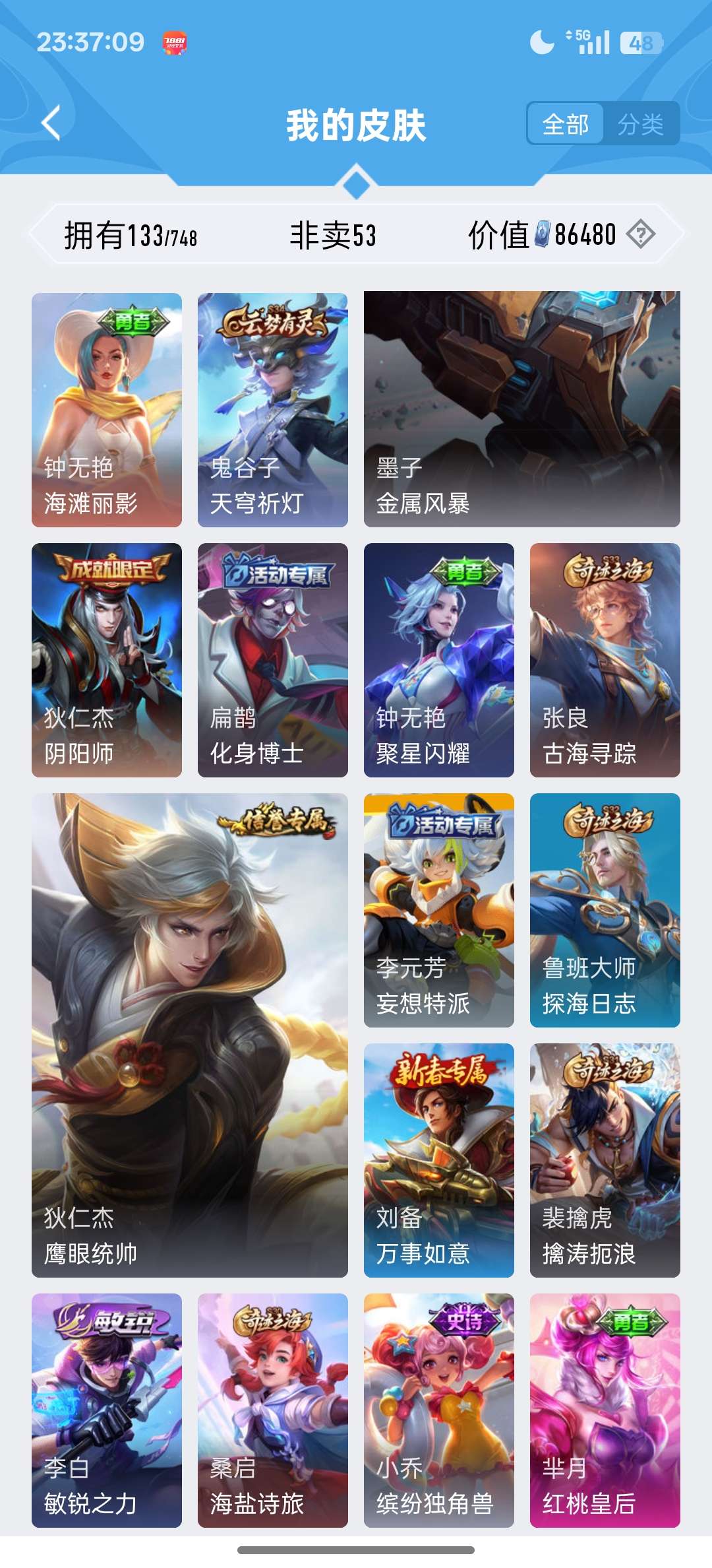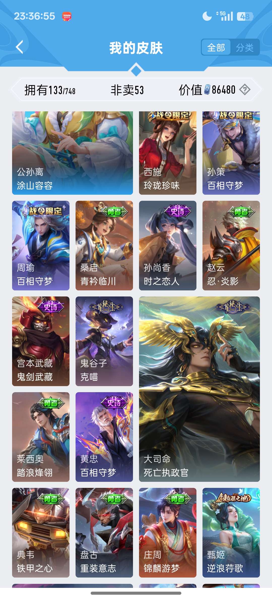 安卓QQ 皮肤133 英雄123 珍品传说2 传说10 其他皮肤44 非凡王者-有暃的珍品传说,v6还差点v7