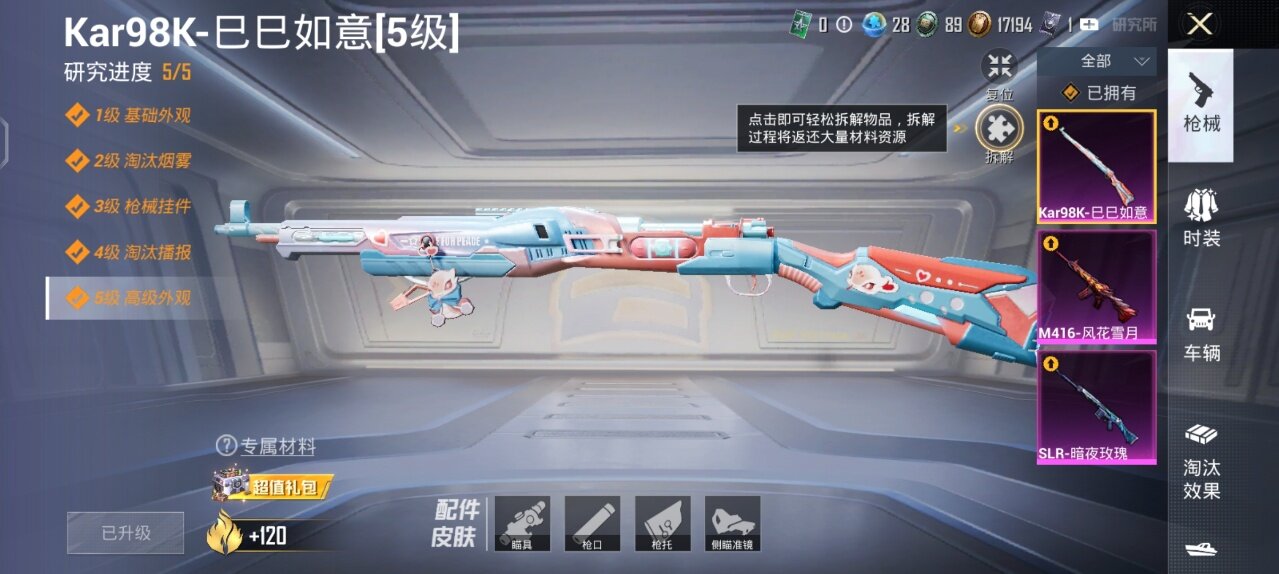【粉色枪皮等级】:M416-风花雪月(七级),Kar98K-巳巳如意(五级),SLR-暗夜玫瑰(五级)