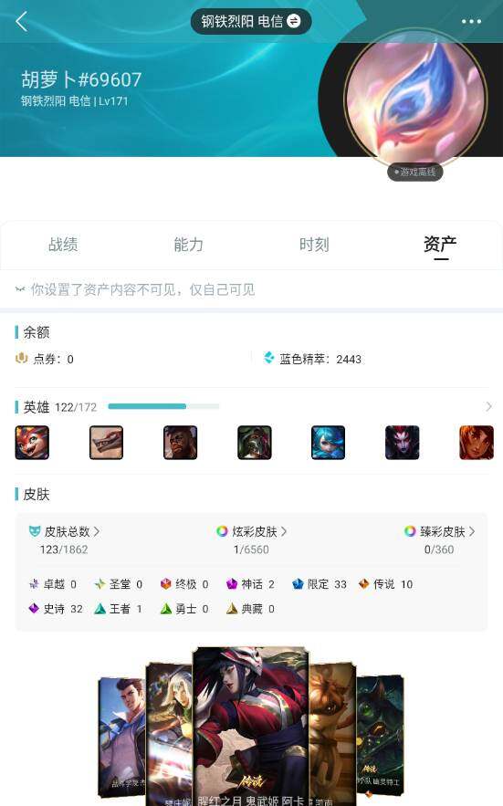 钻石段位-172英雄-67皮肤-49炫彩-0终极-0神话-15限定-6传说-6