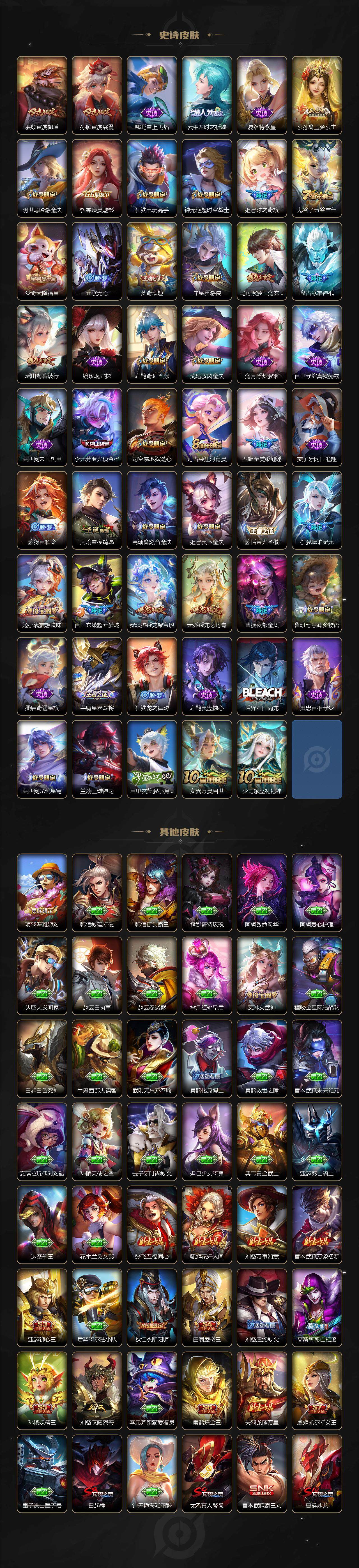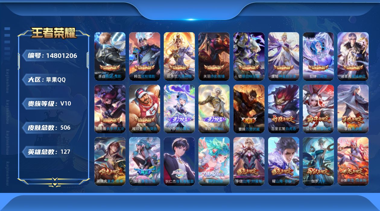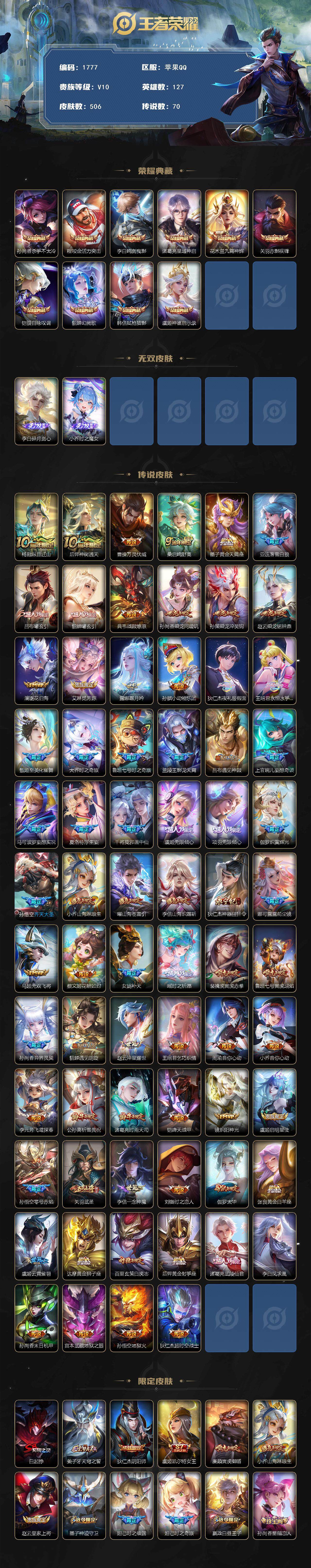 苹果QQ 皮肤506 英雄127 典藏10 无双2 珍品传说1 传说70 其他皮肤208 荣耀王者-