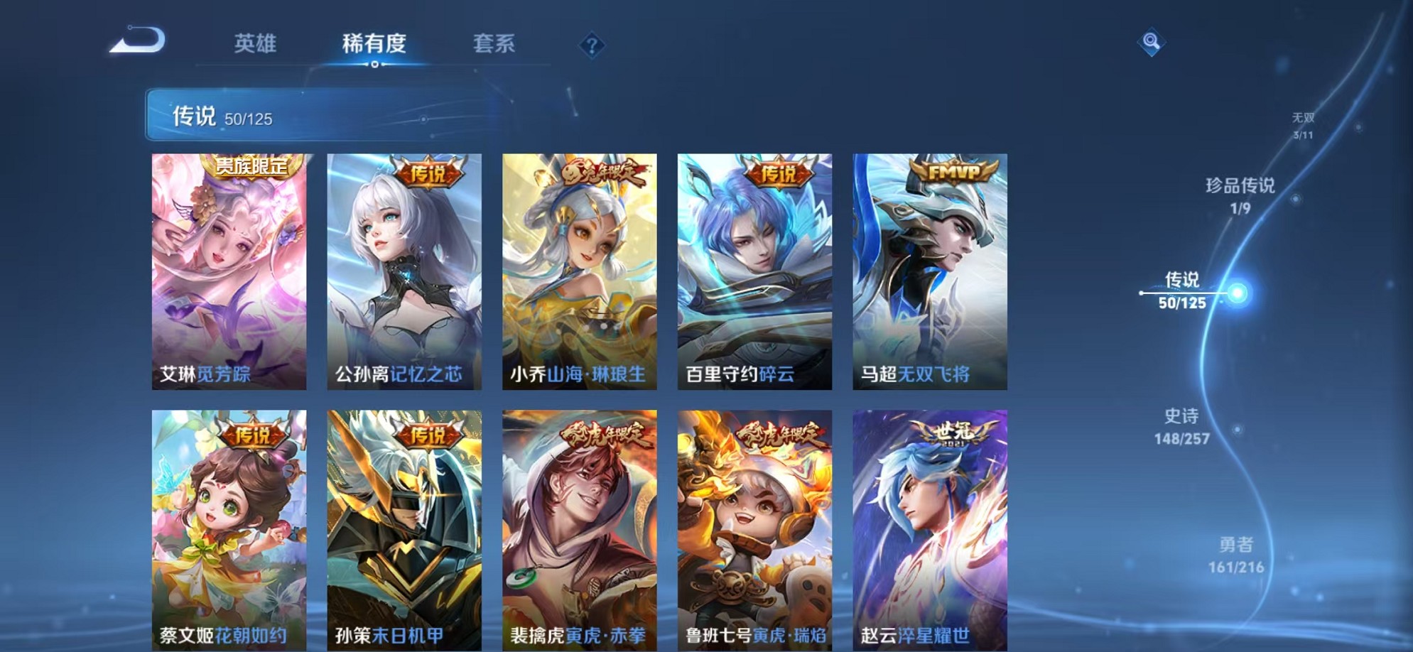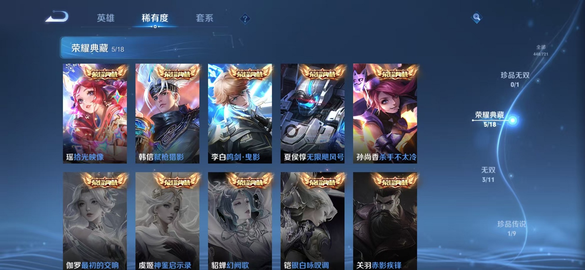 安卓QQ 皮肤448 英雄124 典藏5 无双3 珍品传说2 传说50 其他皮肤184 至尊星耀-