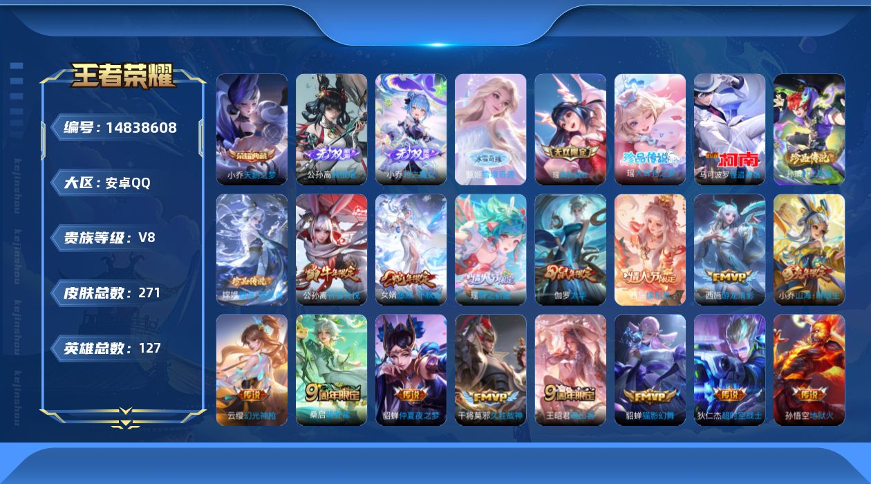 安卓QQ 皮肤271 英雄127 典藏1 无双4 珍品传说3 传说16 其他皮肤94 倔强青铜-