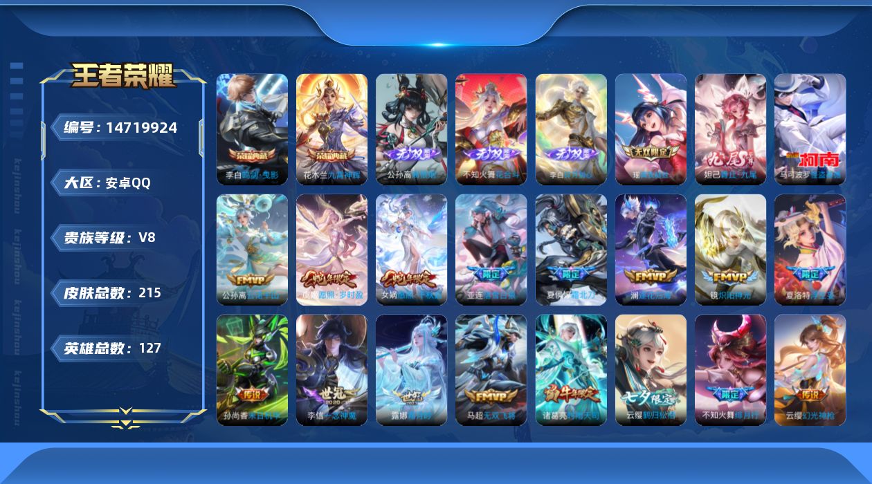 安卓QQ 皮肤215 英雄127 典藏2 无双5 珍品传说1 传说29 其他皮肤74 永恒钻石-