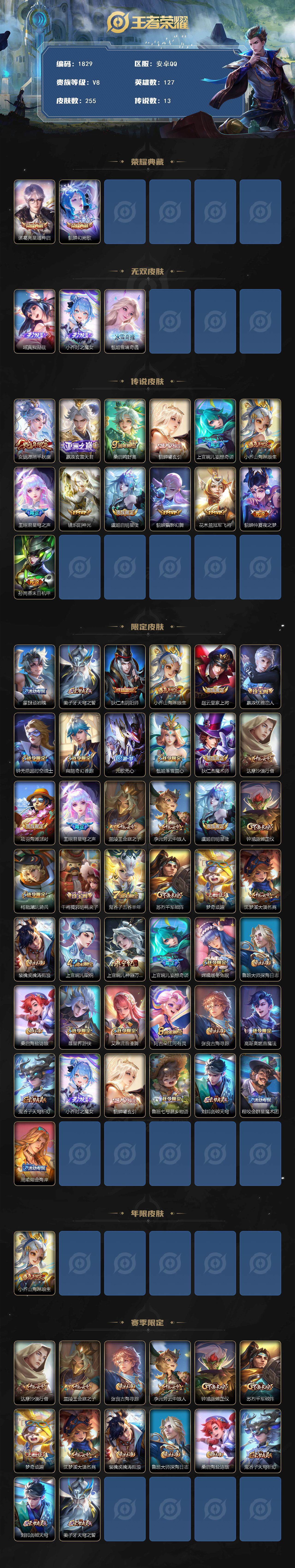 安卓QQ 皮肤255 英雄127 典藏2 无双3 传说13 其他皮肤67 至尊星耀-