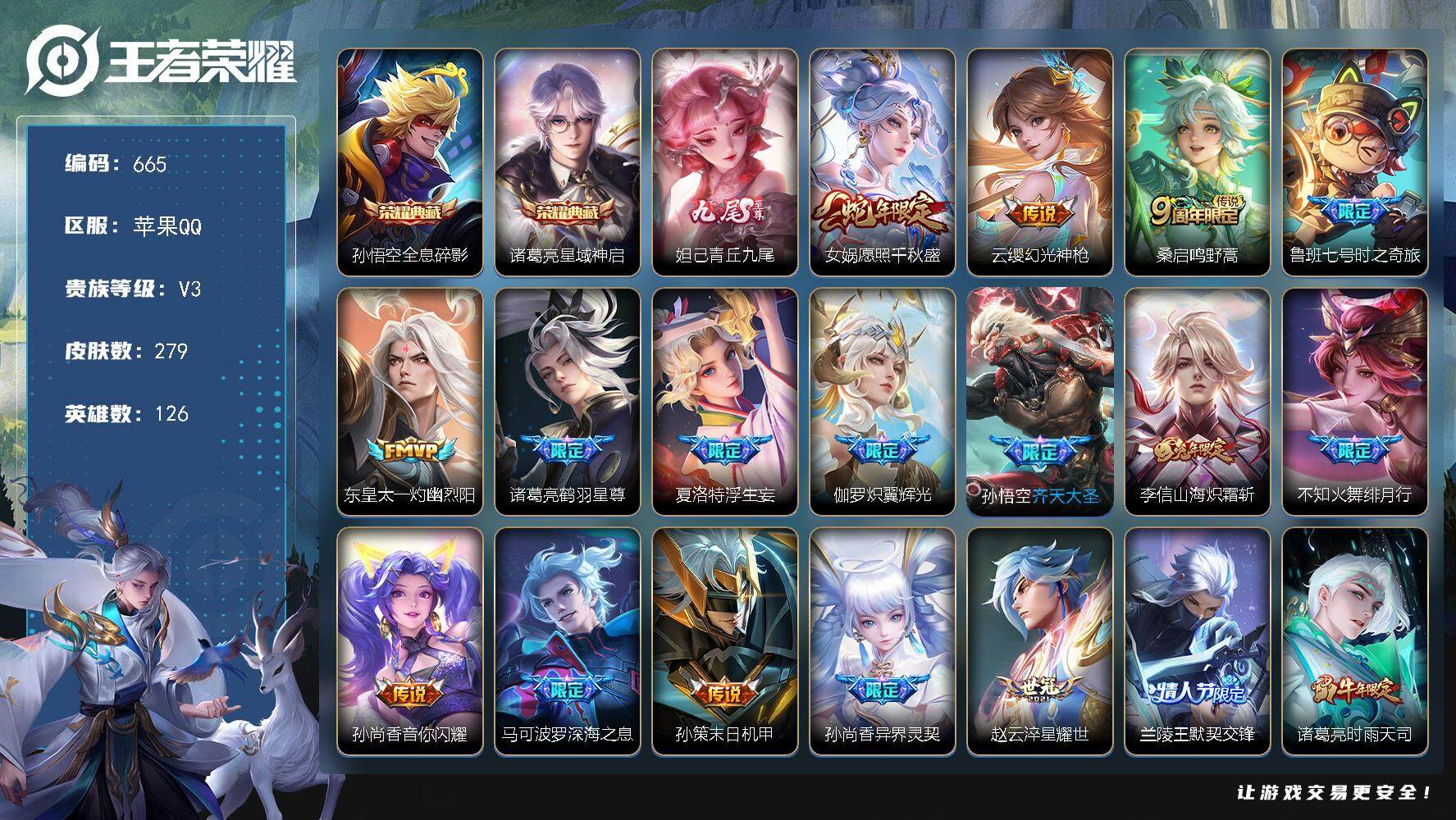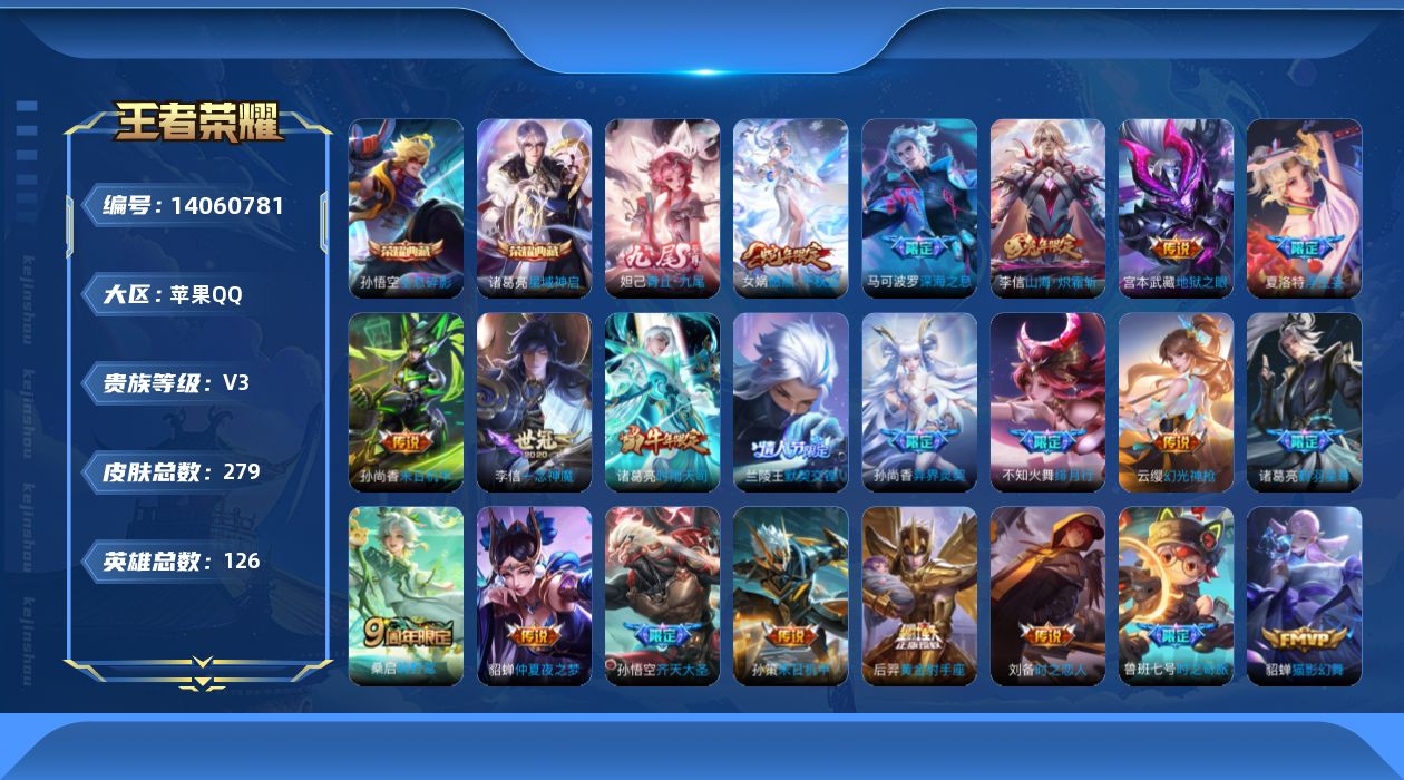 苹果QQ 皮肤279 英雄126 典藏2 无双1 珍品传说1 传说30 其他皮肤105 尊贵铂金-