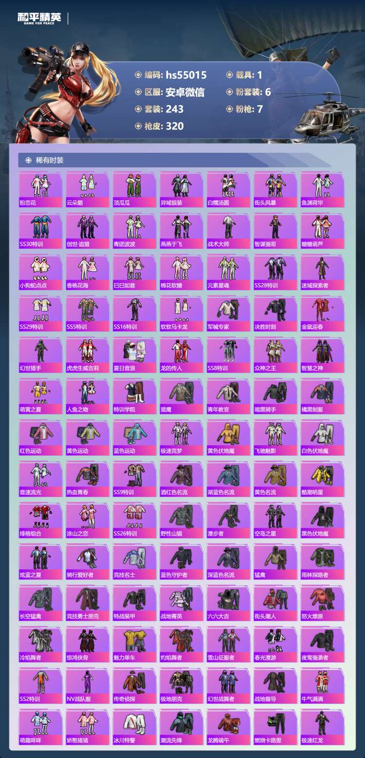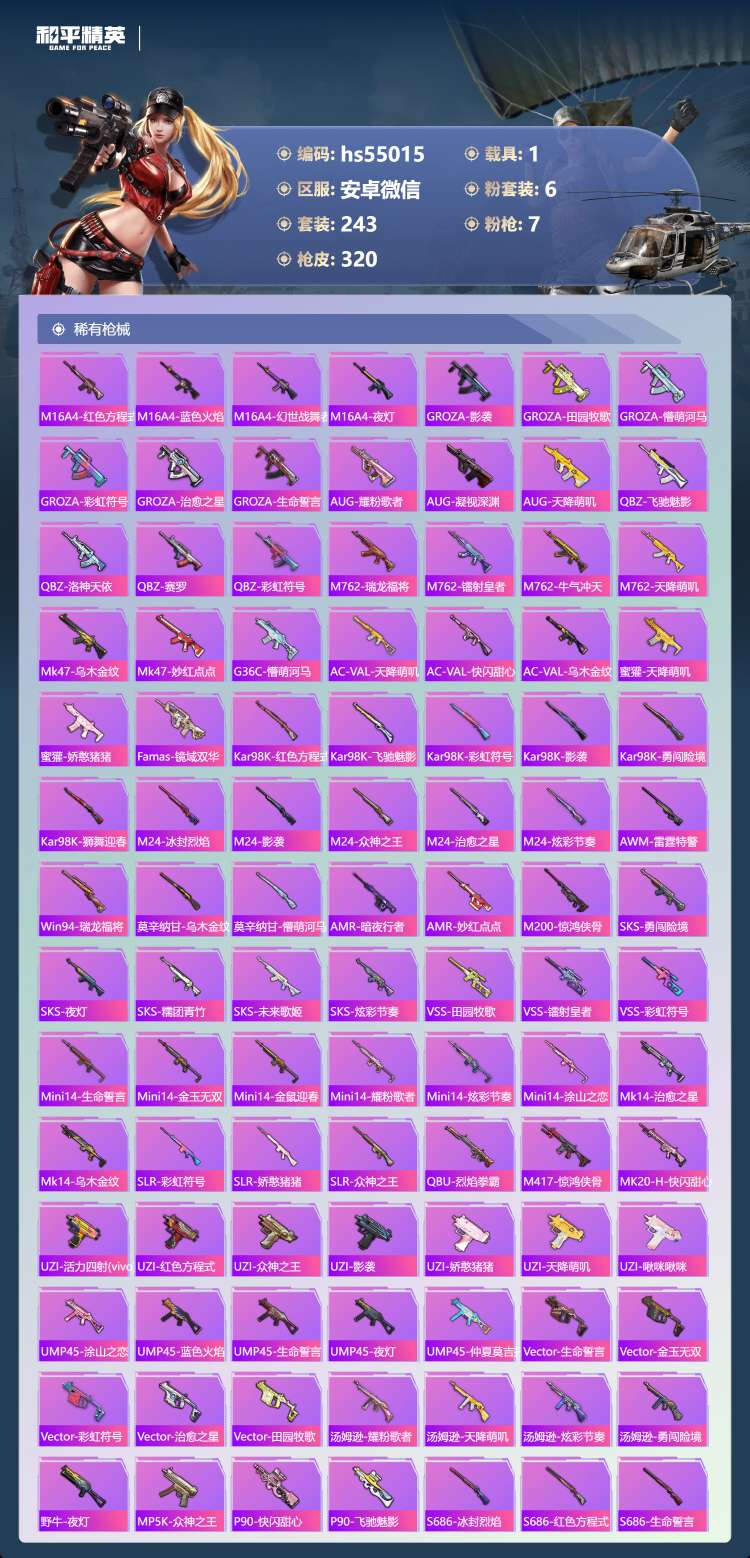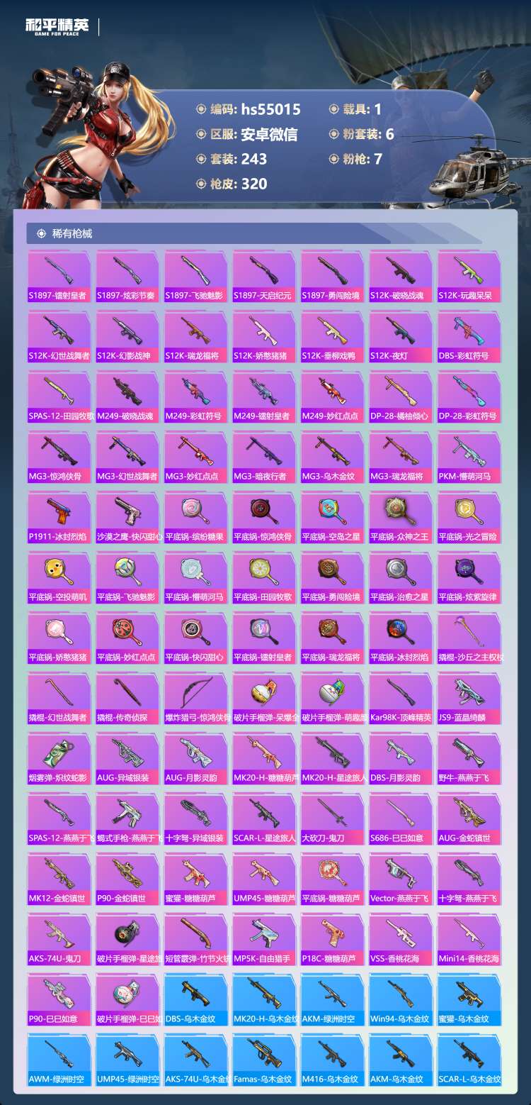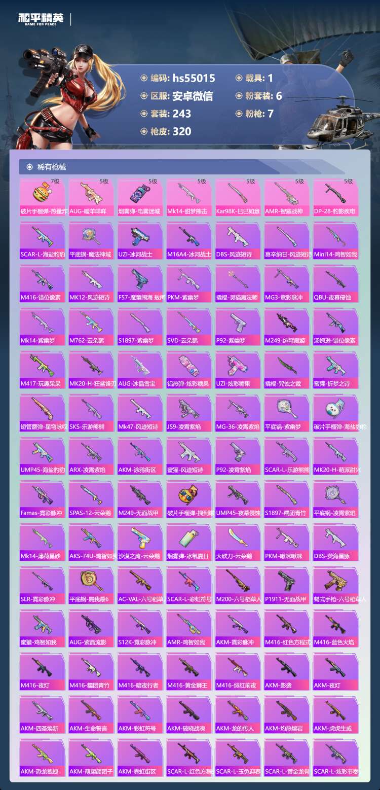 hs55015 安卓微-16王牌印记-有战神框-1红装-6粉装-7特效枪-1载具-96666热力值