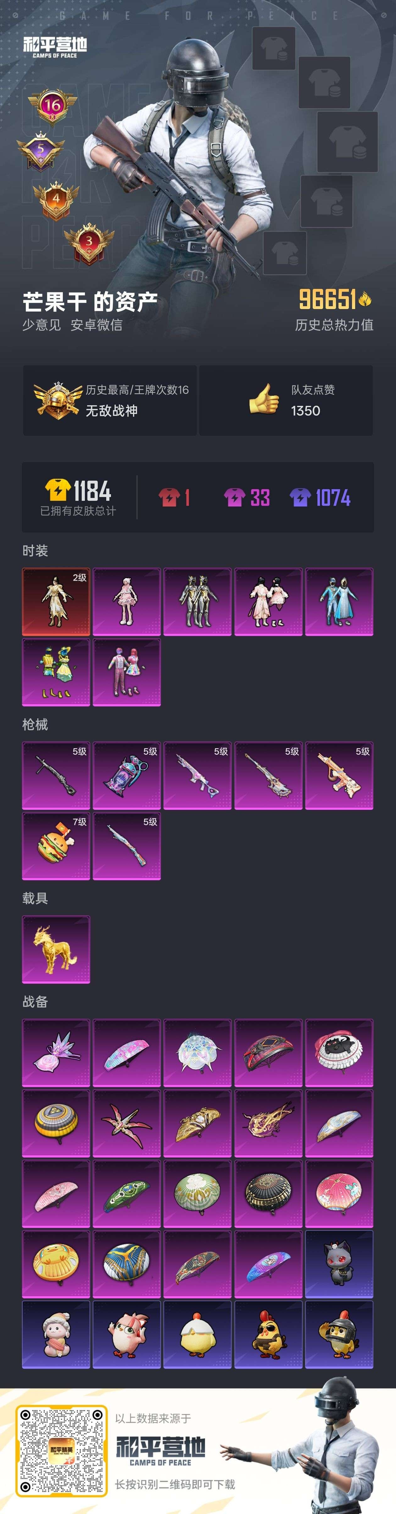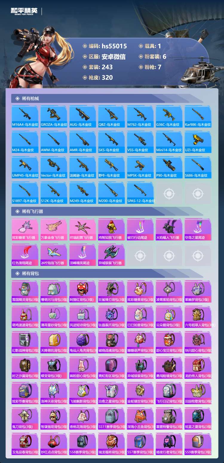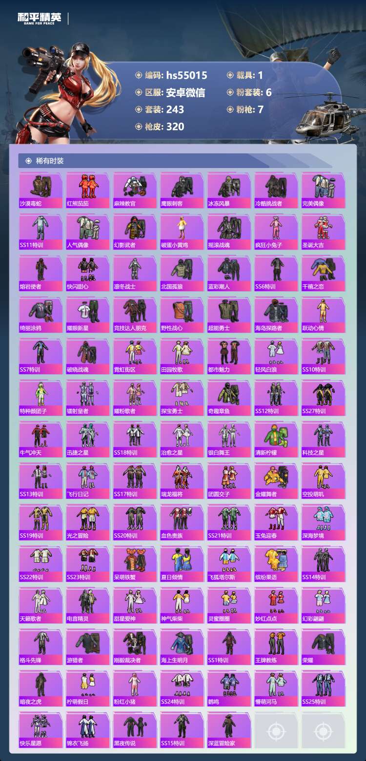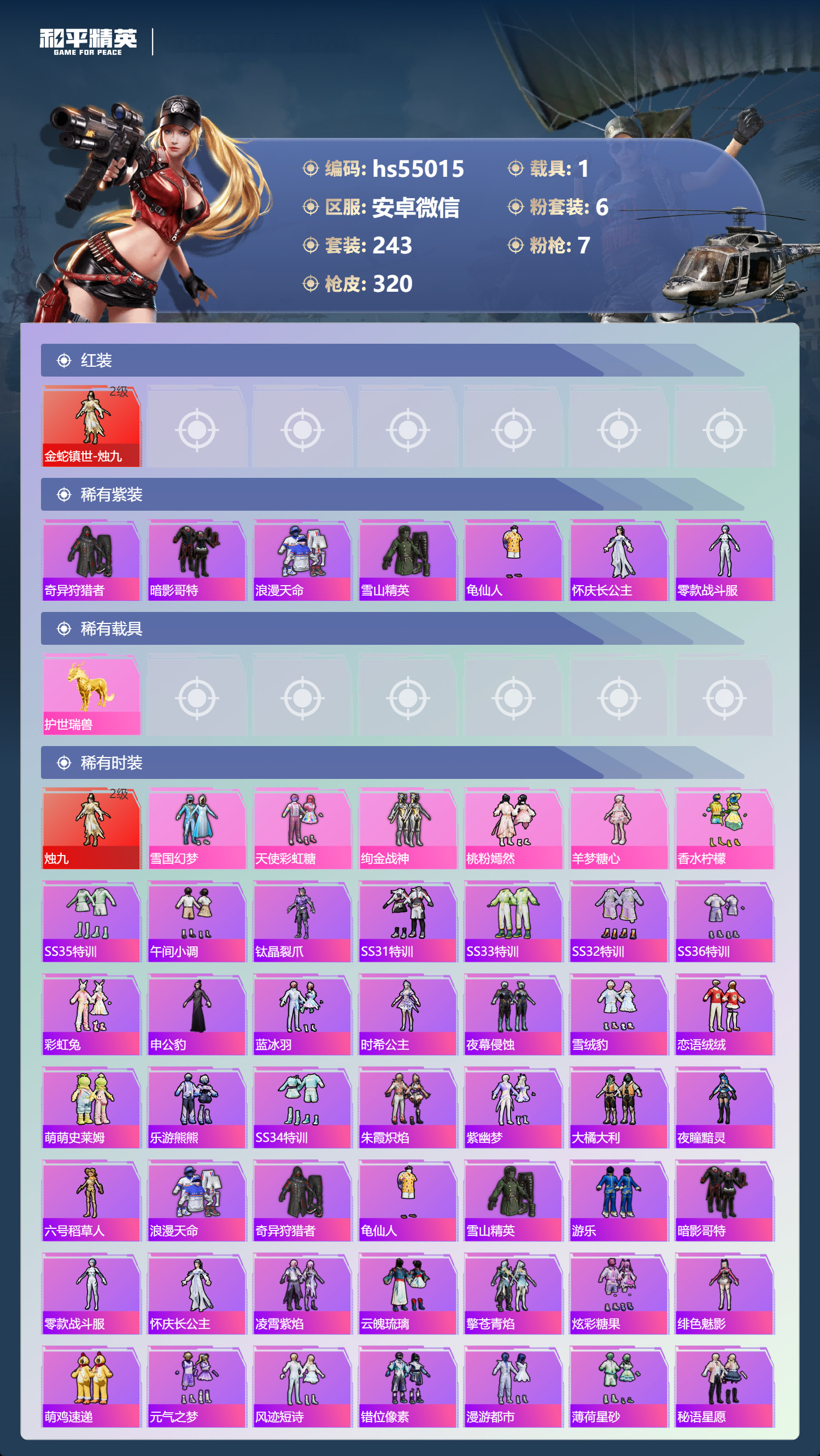 hs55015 安卓微-16王牌印记-有战神框-1红装-6粉装-7特效枪-1载具-96666热力值