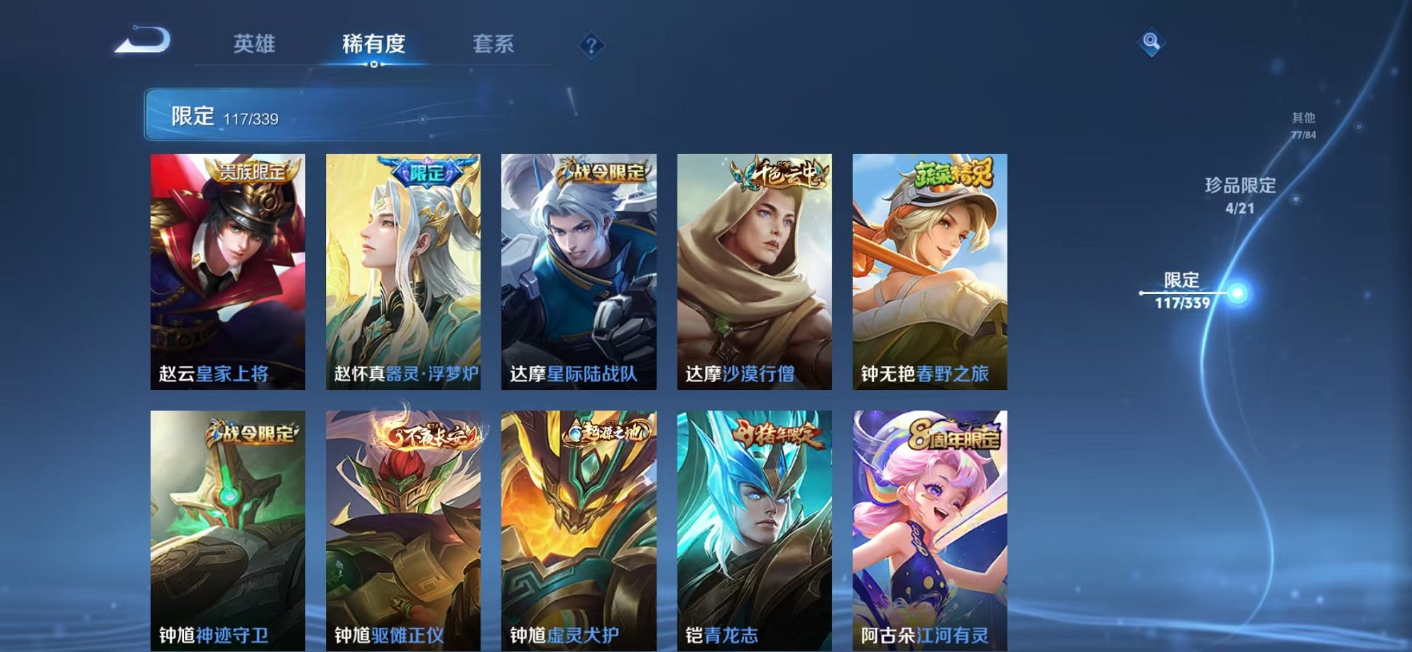 安卓QQ 皮肤349 英雄124 典藏2 无双3 珍品传说1 传说23 其他皮肤128 绝世王者-