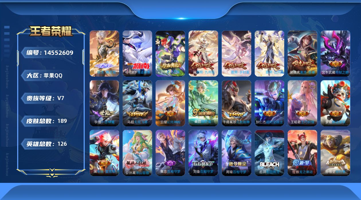 193-[14552609]贵族7-189皮0典藏14传说1无双2珍品传说 苹果手Q24区189皮0典藏14传说1无双2珍品传说V7 营地ID1808577198最强王者【珍品传说皮肤】:时之奇旅,怪盗基德【无双皮肤】:器灵·螭龙剑【优质限定皮肤】:无双飞将【传说皮肤】:地狱之眼,寅虎·赤拳,一念神魔,久胜战神,愿照·九州拓,愿照·山河定,愿照·岁时盈,幻光神枪,乞巧织情,胖达荣荣,鸣野蒿,超时空战士,电玩·雷克斯,无双飞将【史诗皮肤】:星夜王子,李小龙,未来纪元,暗渊魔法,涂山容容,云间偶