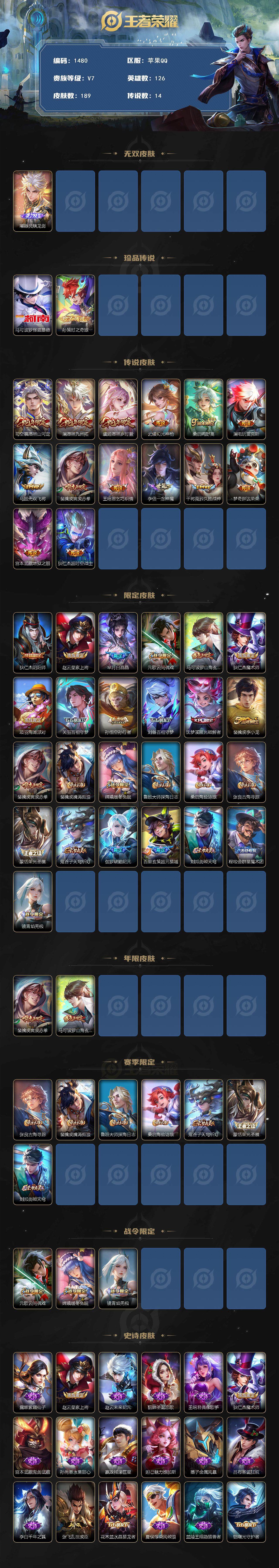 皮肤189 英雄126 荣耀黄金 无双皮肤1 珍品传说1 传说14 其他皮肤53-