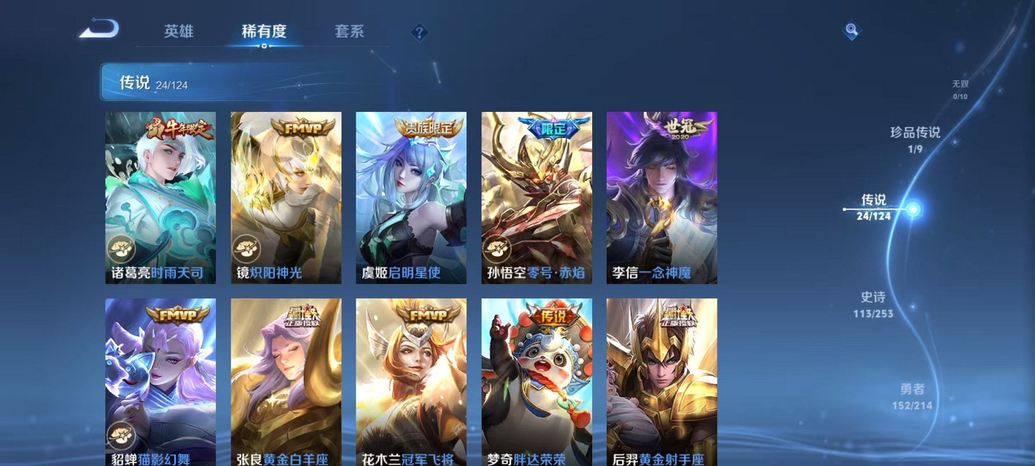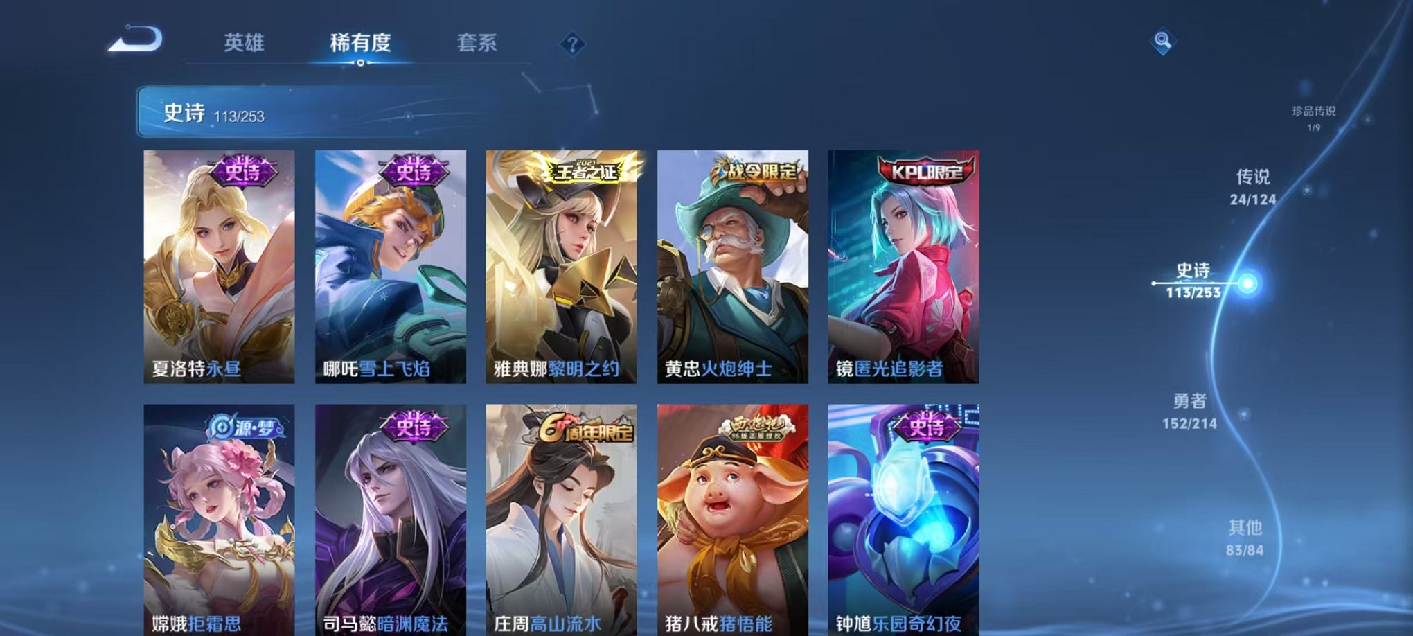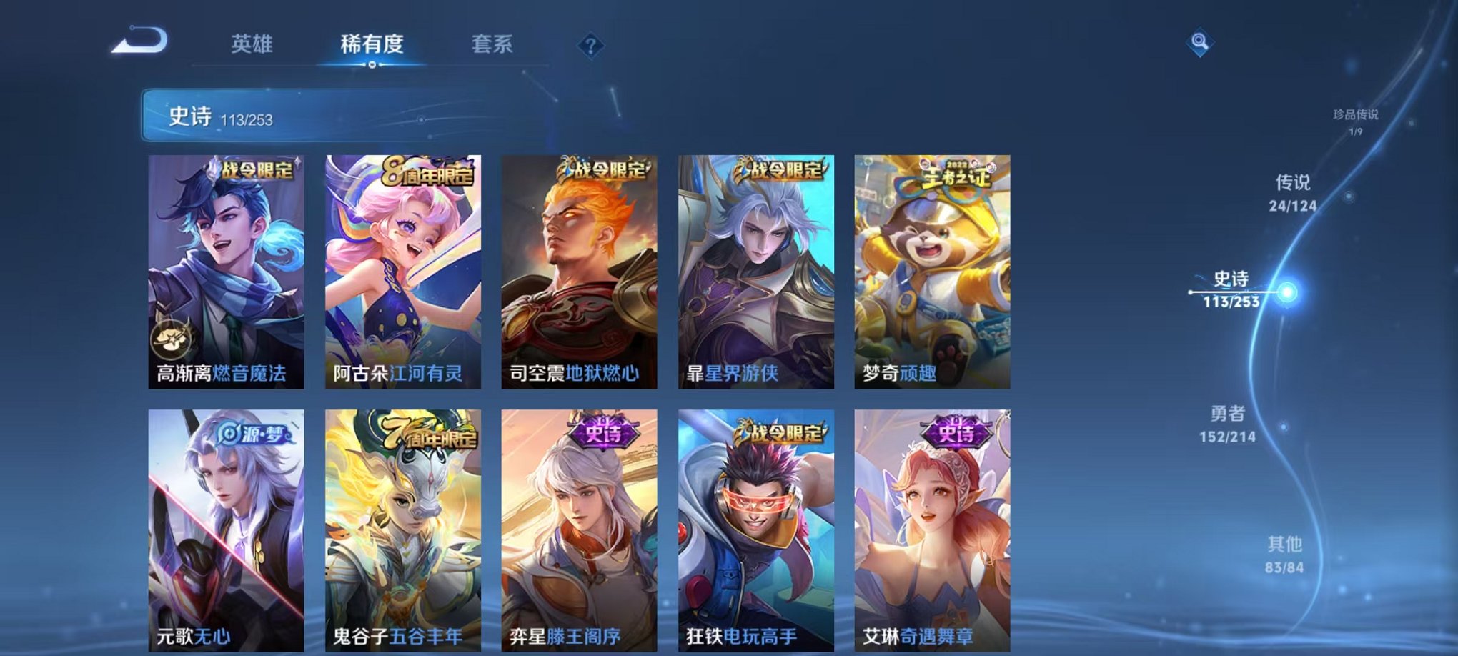 皮肤375 英雄126 永恒钻石 荣耀典藏3 珍品传说1 传说24 其他皮肤155-
