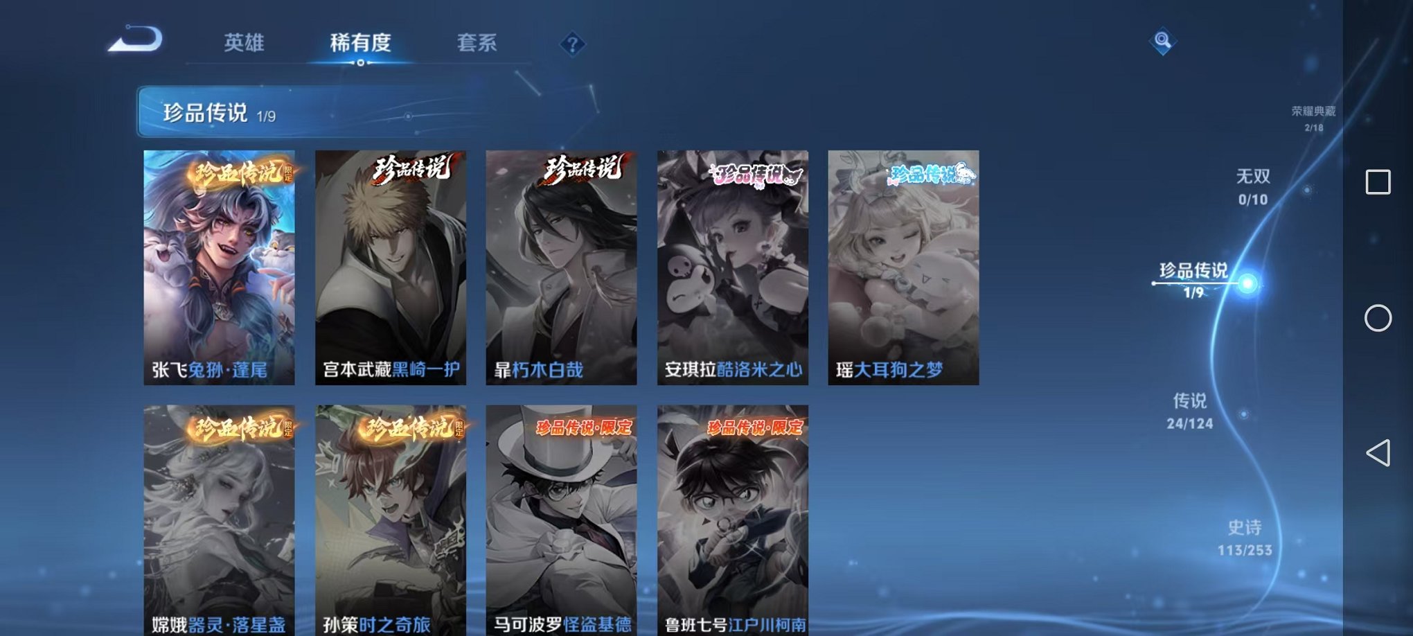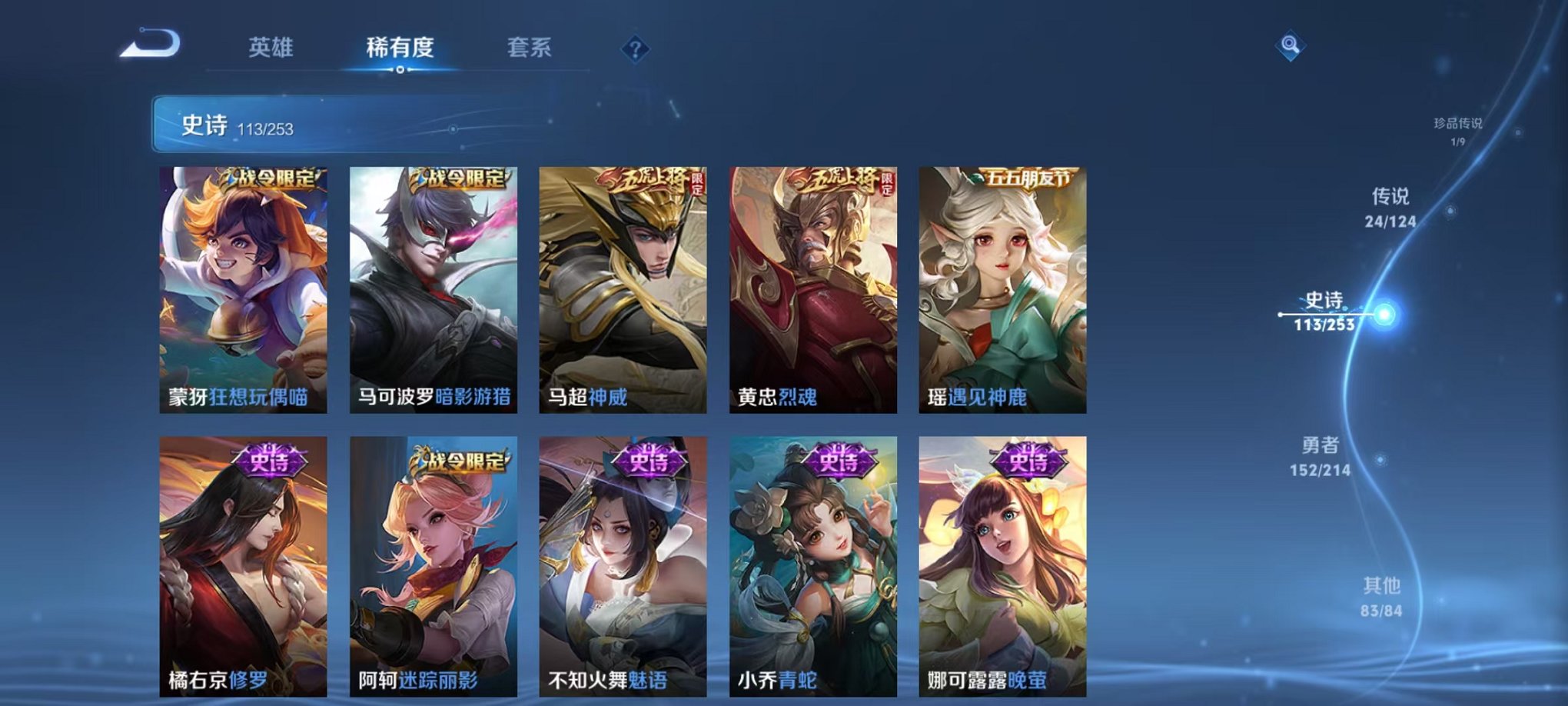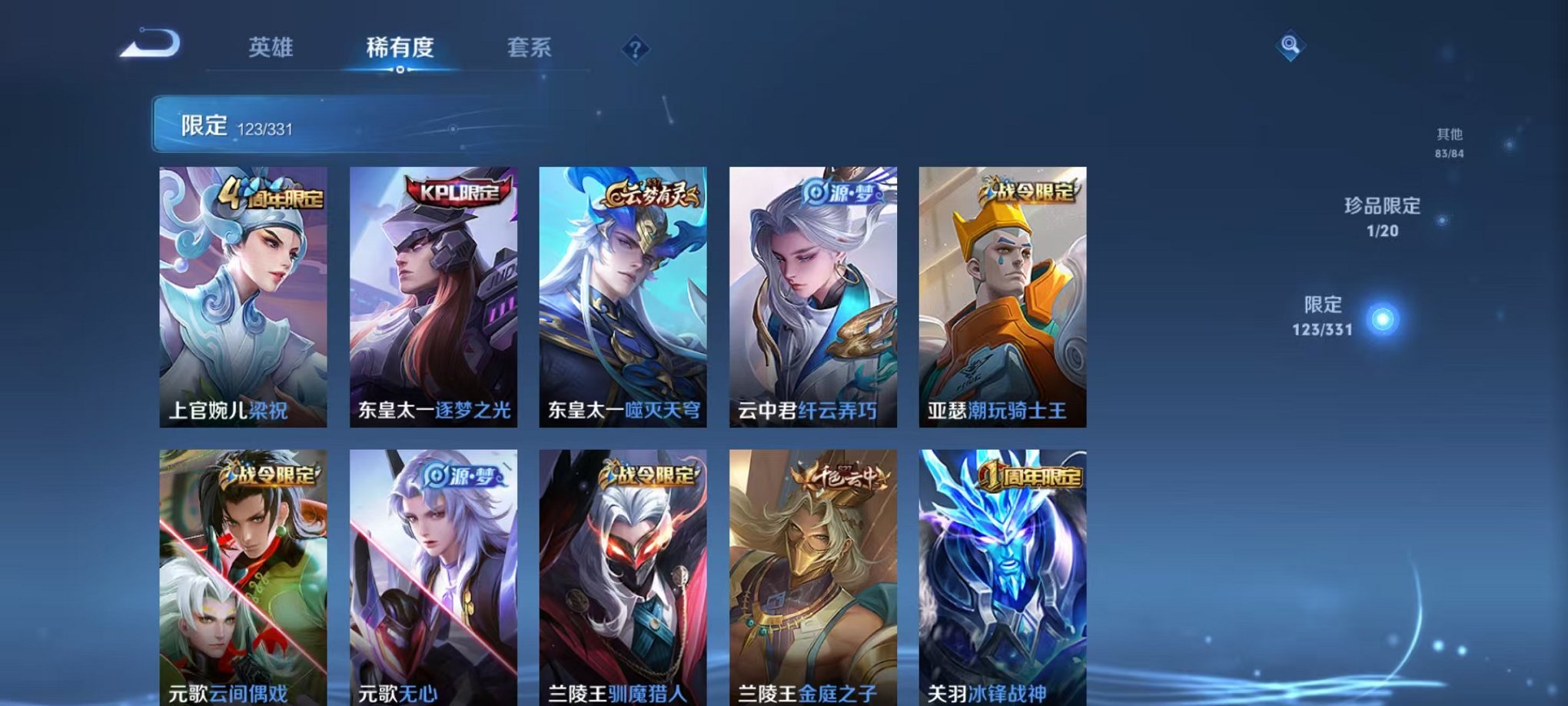 皮肤375 英雄126 永恒钻石 荣耀典藏3 珍品传说1 传说24 其他皮肤155-