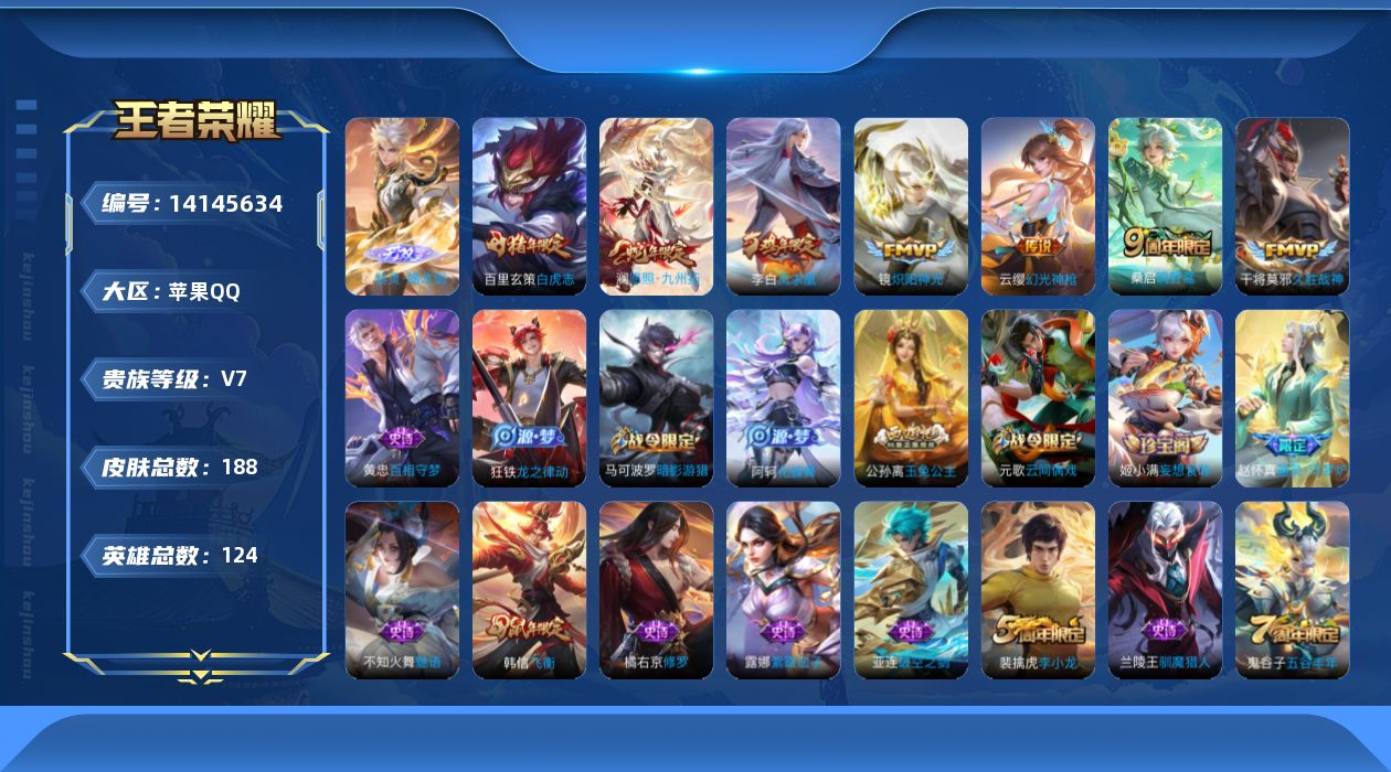 苹果QQ 皮肤188 英雄124 无双1 传说7 其他皮肤74 至尊星耀-