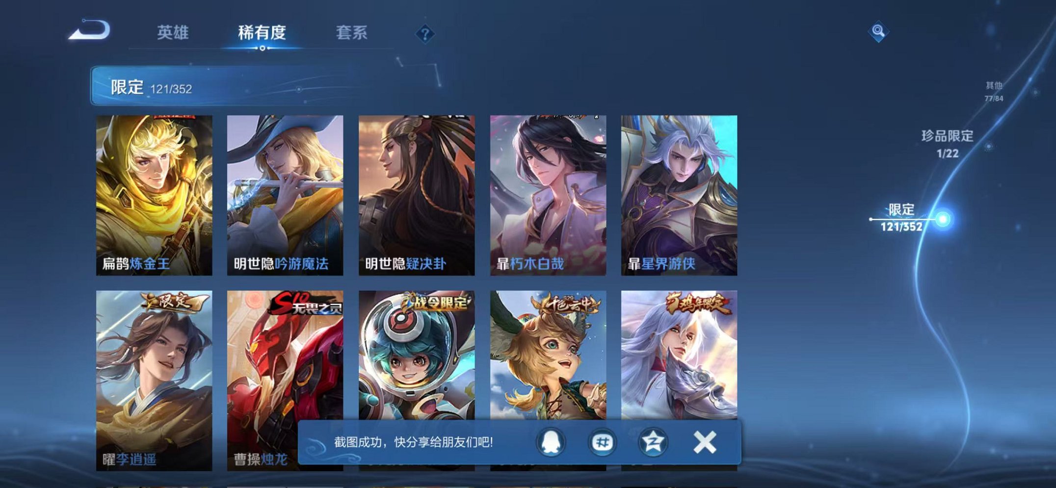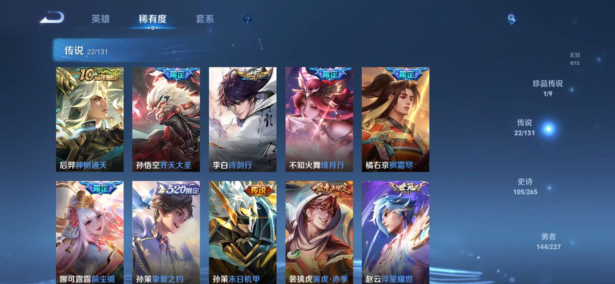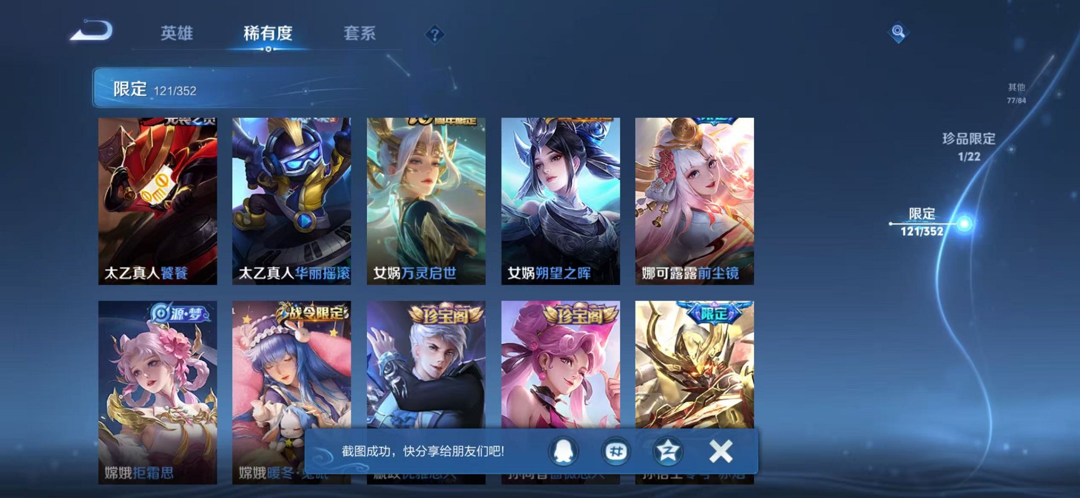 苹果QQ 皮肤351 英雄126 典藏2 珍品传说1 传说22 其他皮肤148 荣耀黄金-