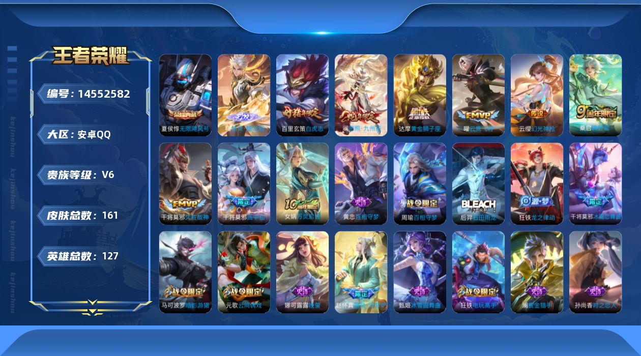 安卓QQ 皮肤161 英雄127 典藏1 无双1 传说8 其他皮肤57 至圣王者-