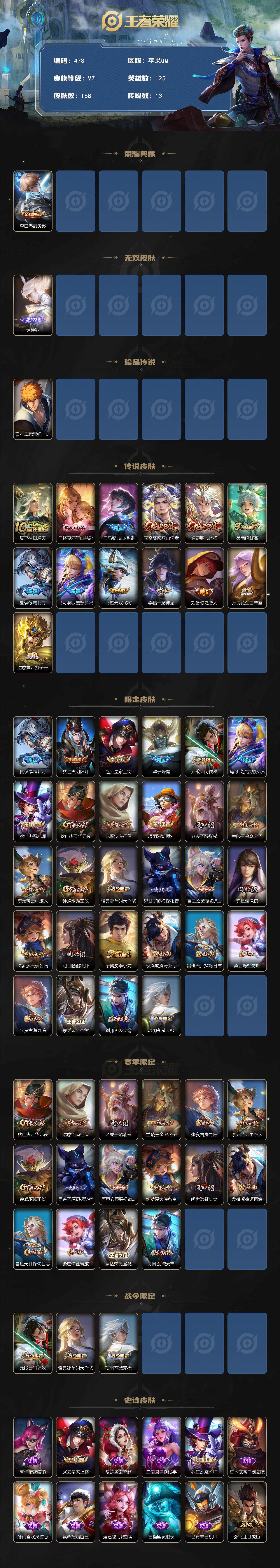苹果QQ 皮肤168 英雄125 典藏1 无双1 珍品传说1 传说13 其他皮肤58 绝世王者-