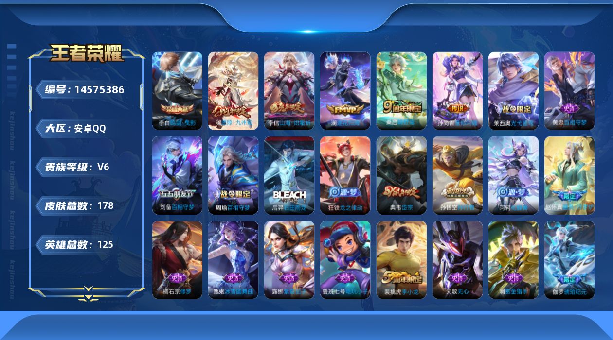 安卓QQ 皮肤178 英雄125 典藏1 传说6 其他皮肤58 至尊星耀-