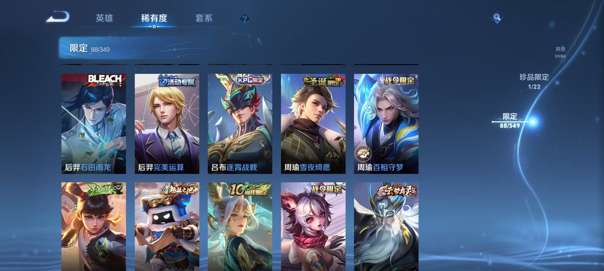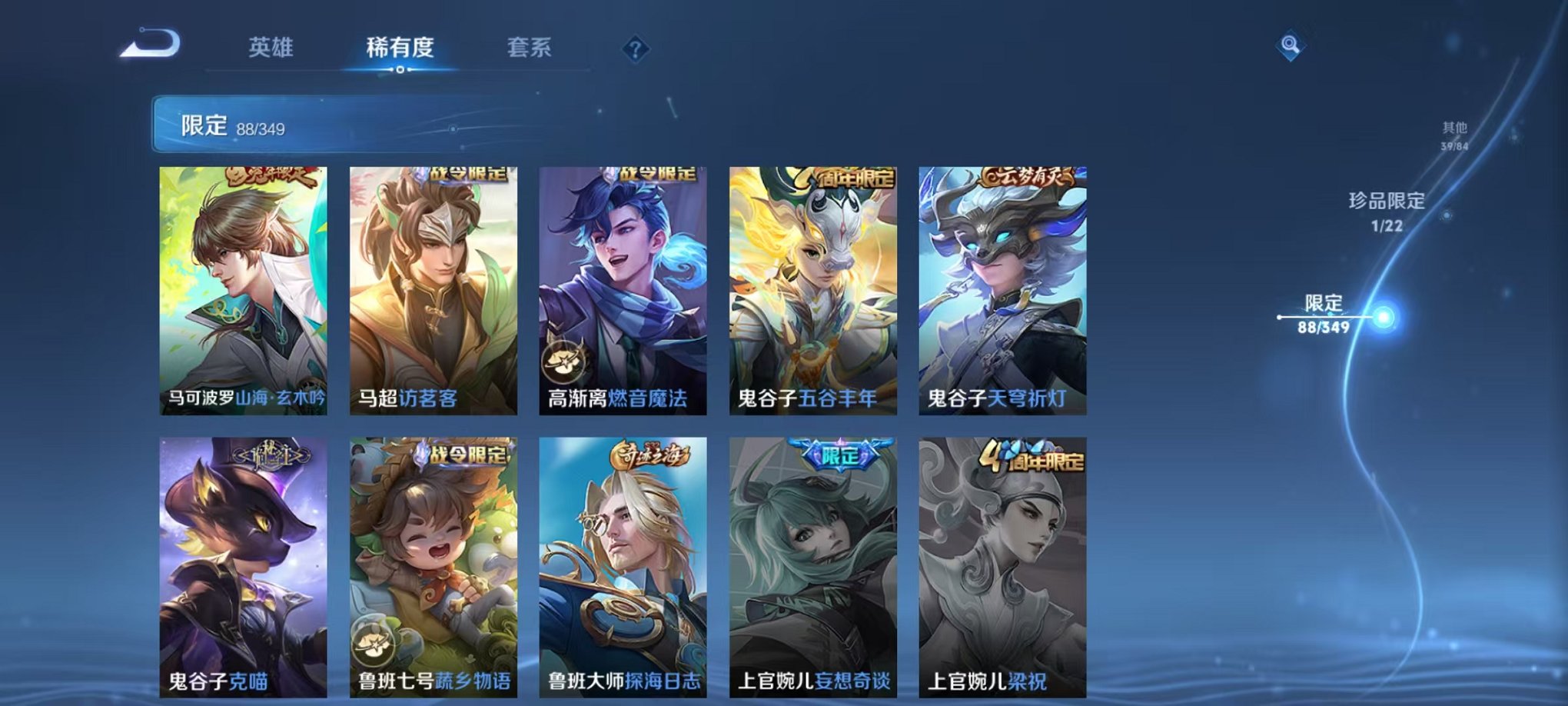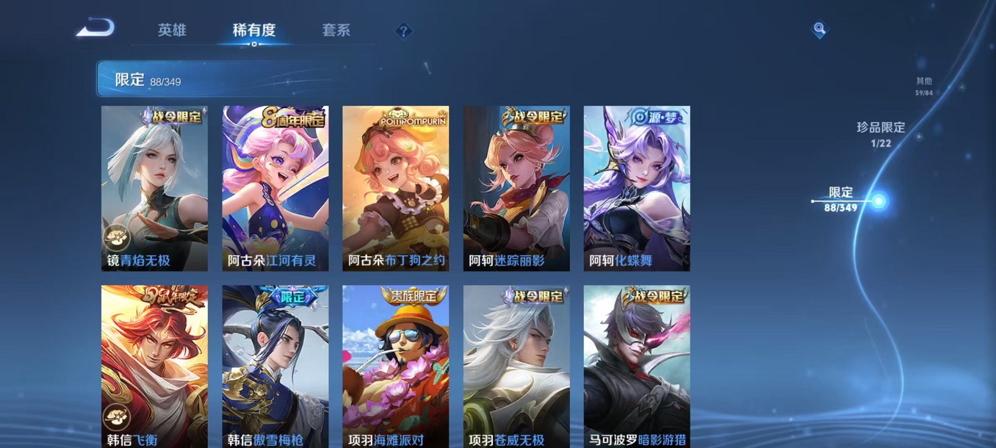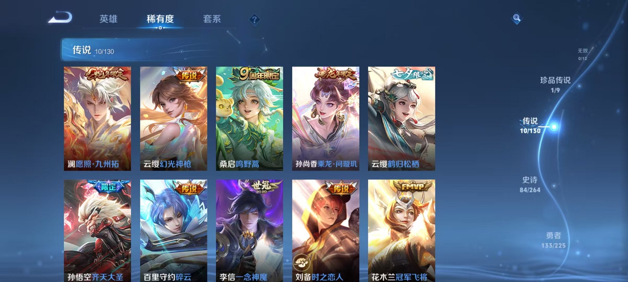 安卓QQ 皮肤275 英雄126 典藏1 珍品传说1 传说10 其他皮肤97 绝世王者-