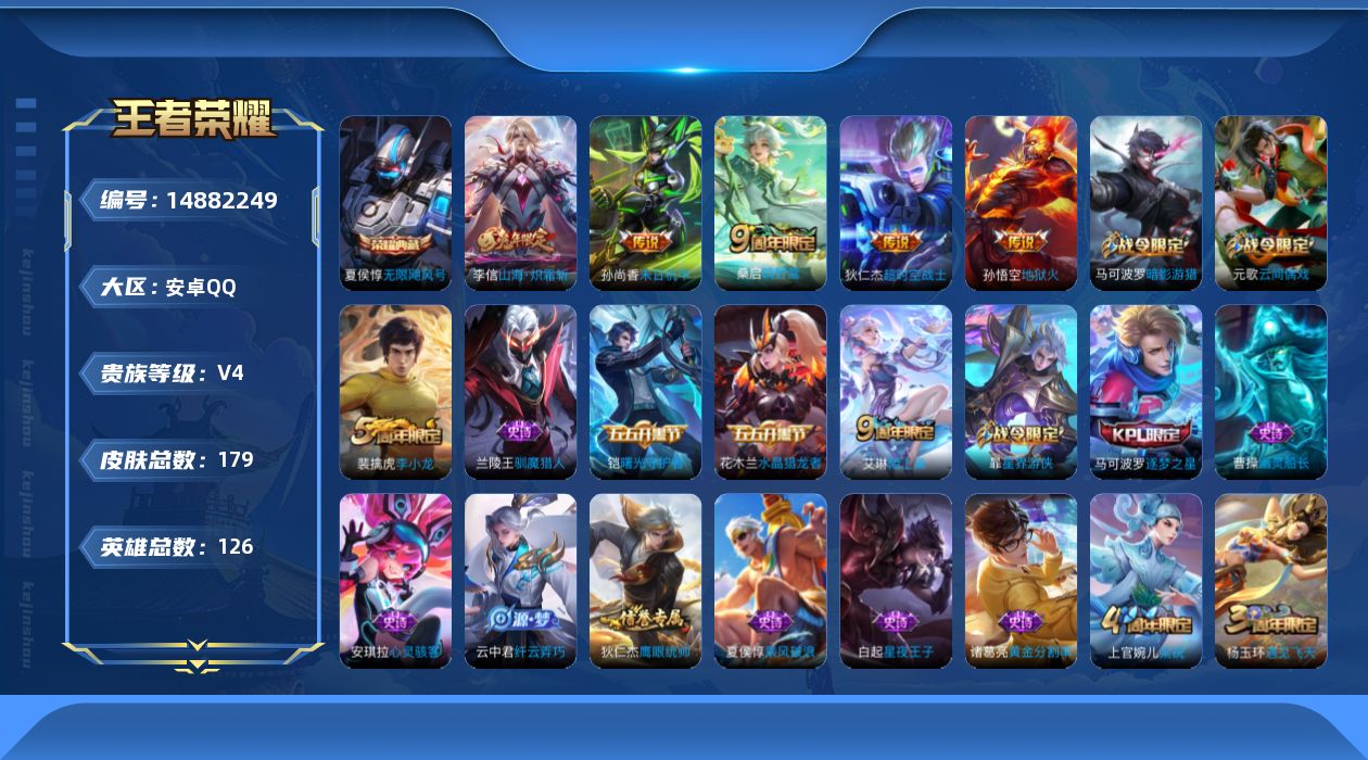 安卓QQ 皮肤179 英雄126 典藏1 传说5 其他皮肤71 至尊星耀-