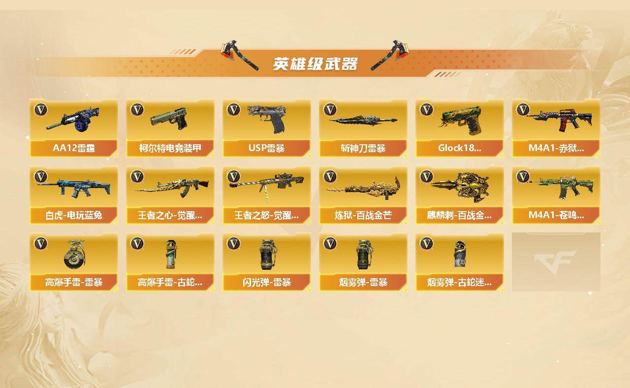 【热门武器】:QBZ03-金色蔷薇,修罗-古蛇迷踪,白虎-电玩蓝兔,M4A1-黑骑士,汤姆逊-烈龙*2,加特林-炼狱,斯泰尔-蝴蝶,USP-雷暴,沙鹰-修罗*5