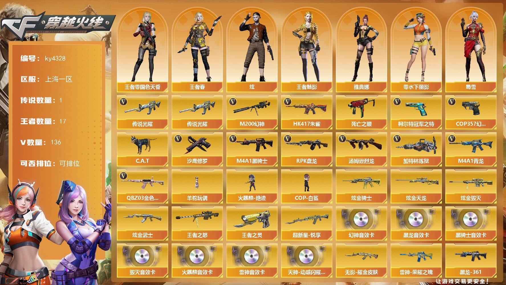 【热门武器】:传说破晓,QBZ03-金色蔷薇*2,Scar Light-白虎,M200-幻神,死亡之眼,Kar98K-星神,M4A1-黑骑士,汤姆逊-烈龙*6,加特林-炼狱*2,斯泰尔-蝴蝶,MK5-炽火炎龙,USP-雷暴*2,沙鹰-修罗*3,炽芒蝶刃