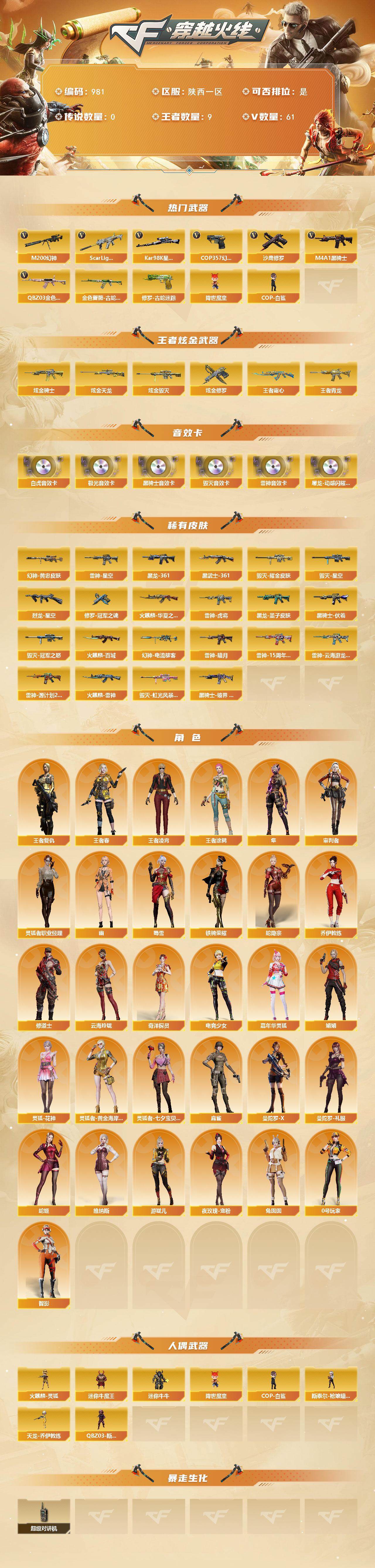 陕西一区-61V-9王者-4炫金【热门武器】:QBZ03-金色蔷薇,Scar