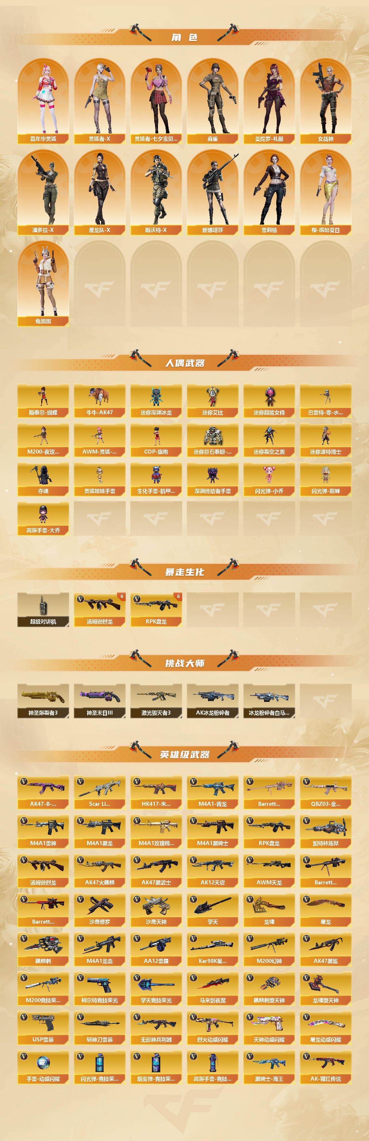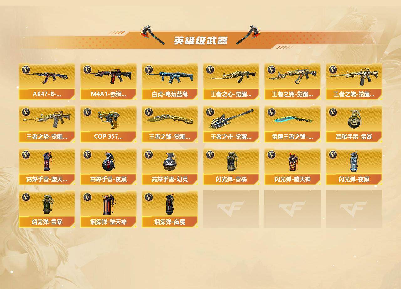 【热门武器】:传说光耀,QBZ03-金色蔷薇*2,Scar Light-白虎,HK417-朱雀,M4A1-青龙,M200-幻神*2,M200-竞技荣光,白虎-电玩蓝兔,Kar98K-星神,金色小号,牛牛-AK47,M4A1-黑骑士,汤姆逊-烈龙*6,RPK-盘龙*6,加特林-炼狱,斯泰尔-蝴蝶,USP-雷暴,沙鹰-修罗*2,