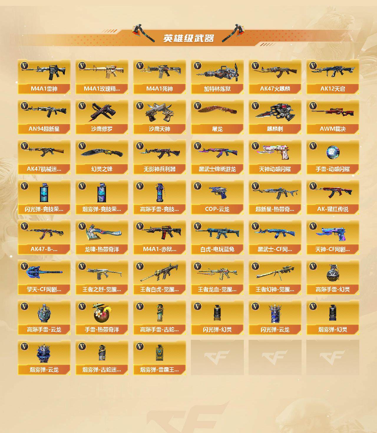 【热门武器】:传说圣灵,QBZ03-金色蔷薇,Scar Light-白虎,M4A1-青龙,金色蔷薇-古蛇迷踪,修罗-古蛇迷踪,死亡之眼,青龙之魄,白虎-电玩蓝兔,金色小号,牛牛-AK47,加特林-炼狱*3,斯泰尔-蝴蝶,MK5-炽火炎龙,沙鹰-修罗,金刚伞