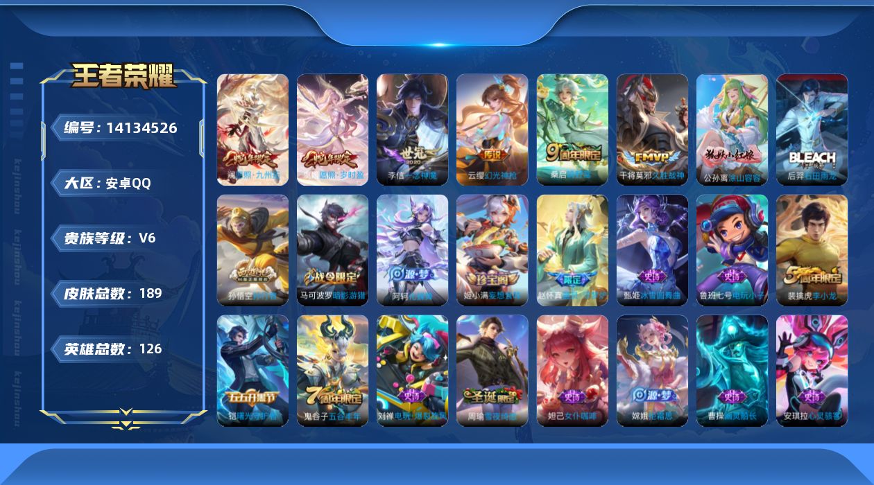 安卓QQ 皮肤189 英雄126 传说6 其他皮肤60 尊贵铂金-