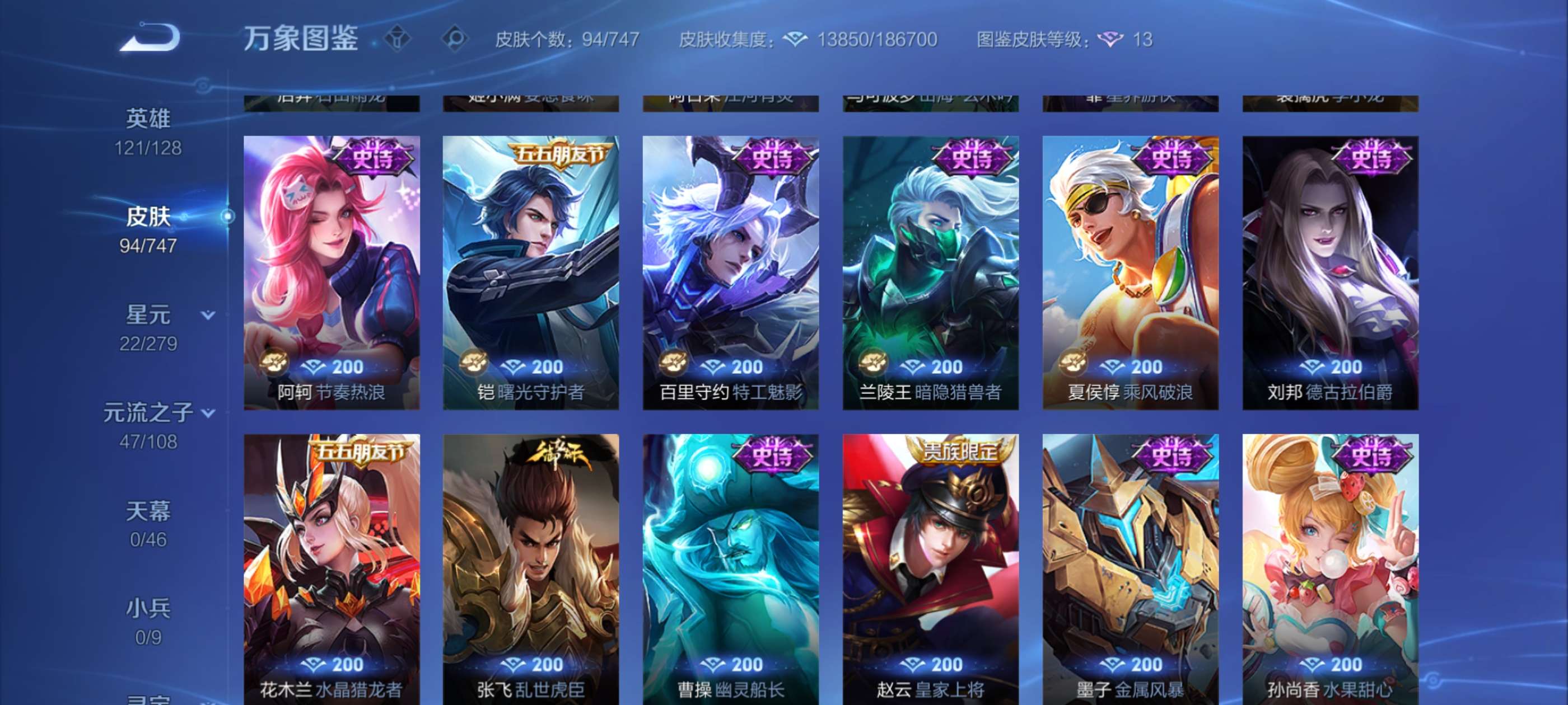 安卓QQ 皮肤94 英雄121 典藏1 传说4 其他皮肤33 永恒钻石-王者李白皮肤小号,有二次