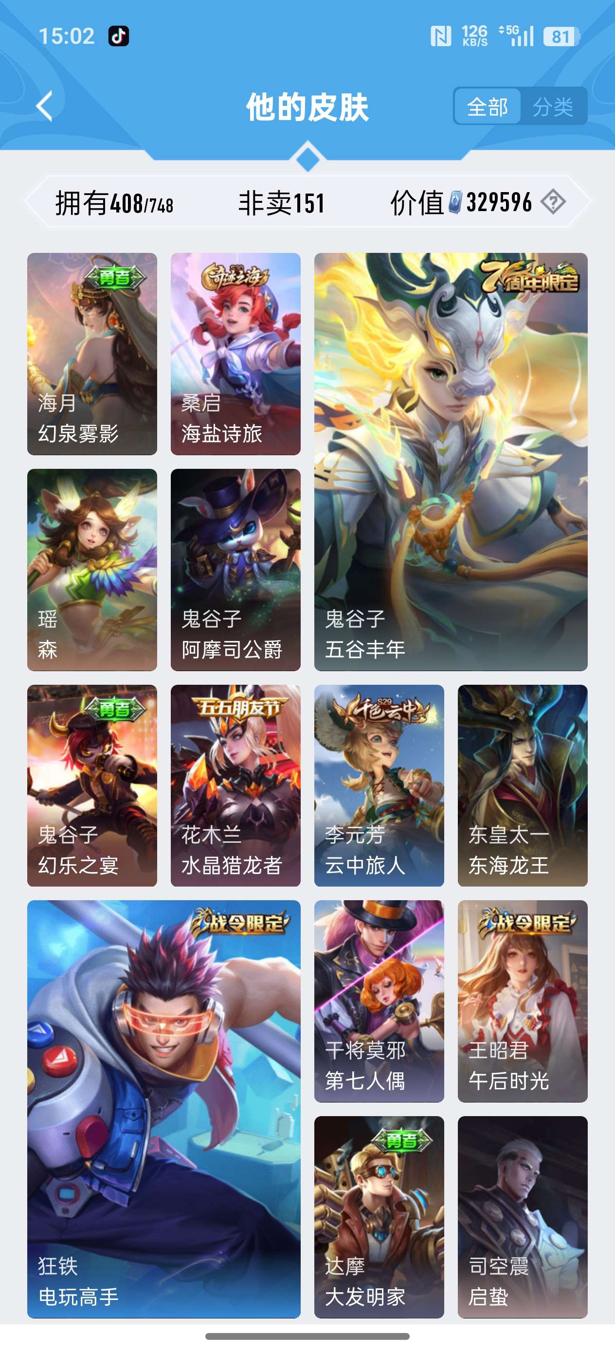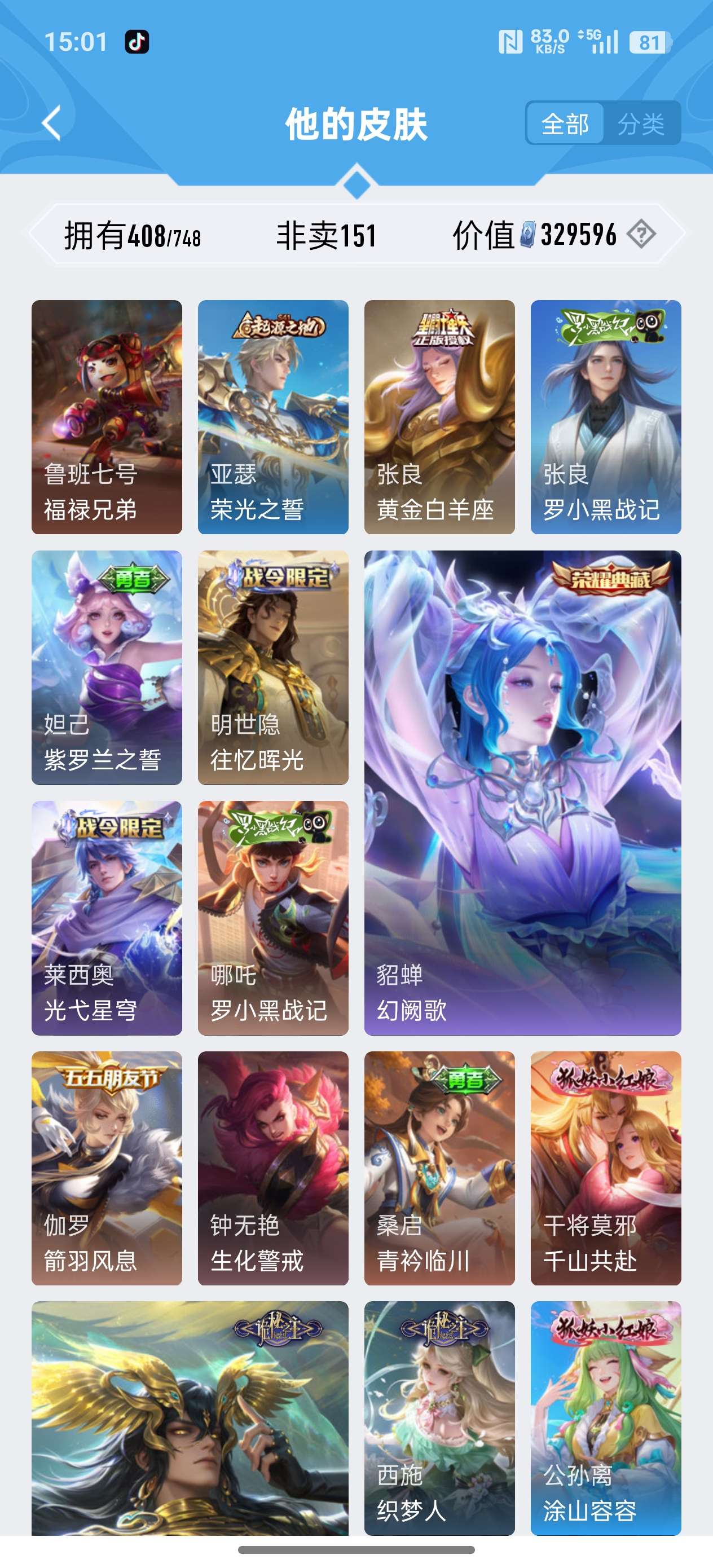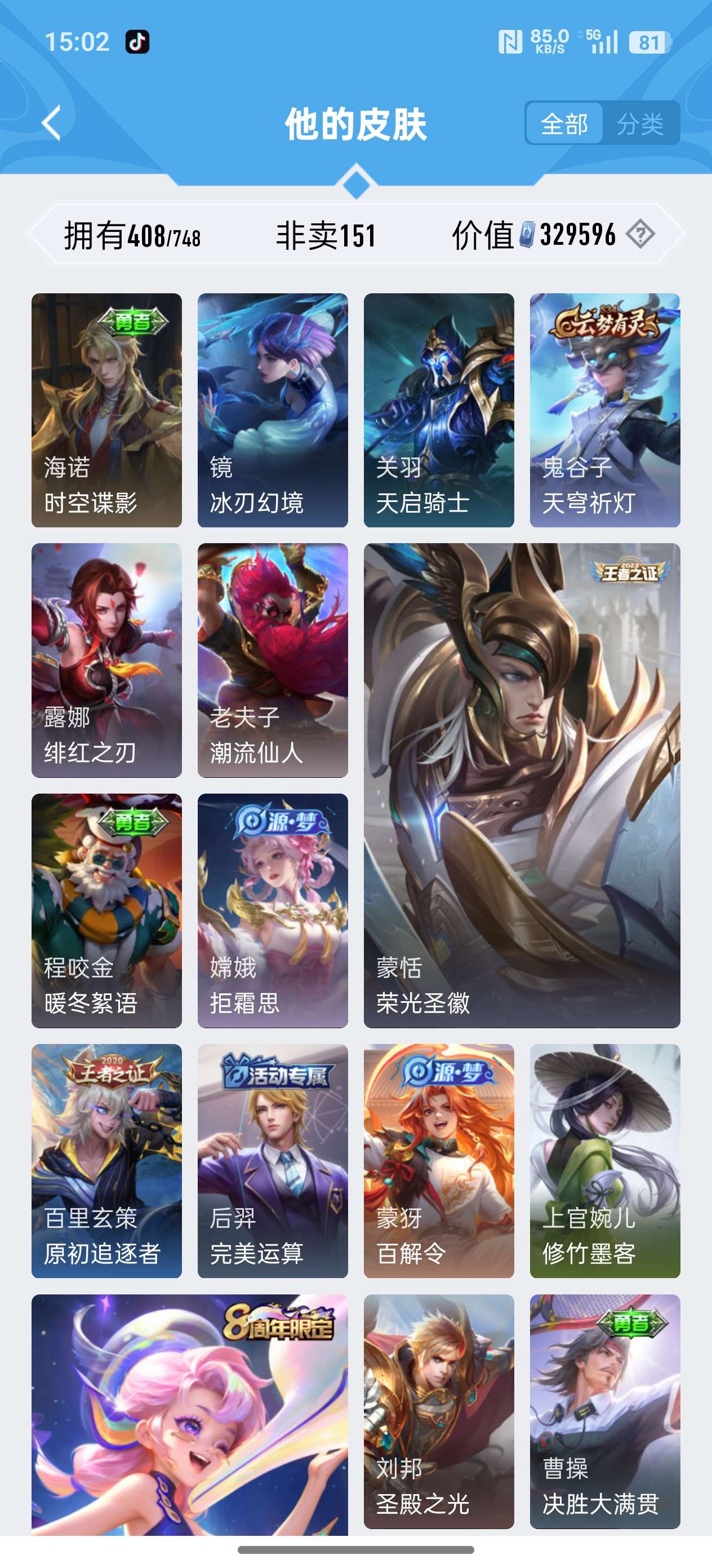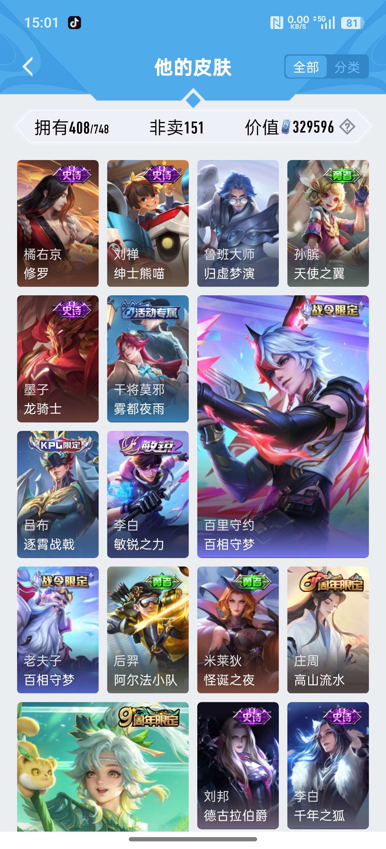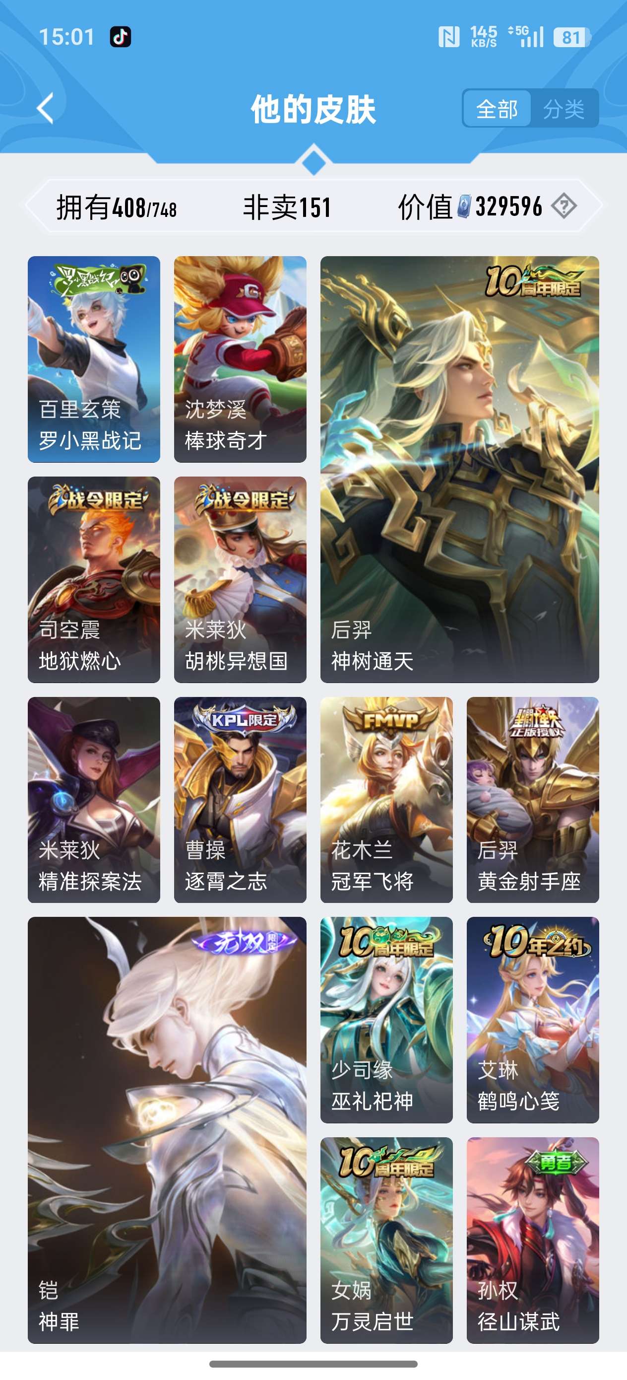 安卓QQ/荣耀王者/408皮肤/126英雄/3典藏/0珍品无双/1无双/2珍品传说/20传说/119