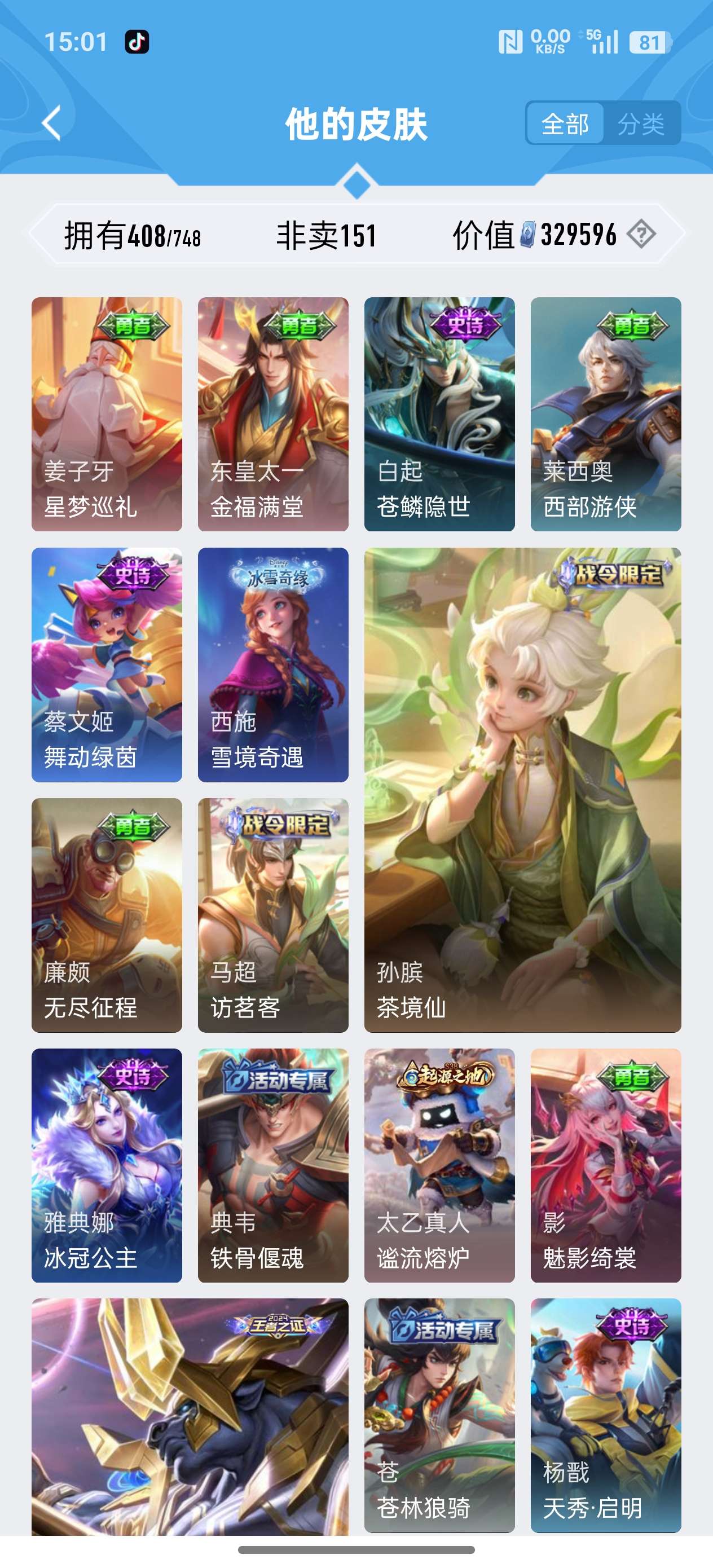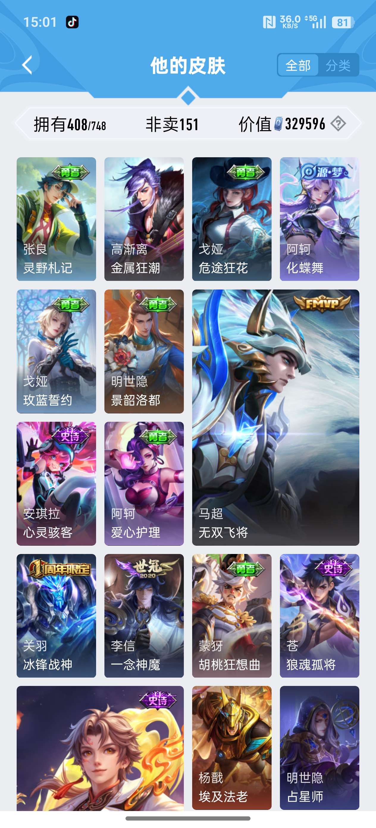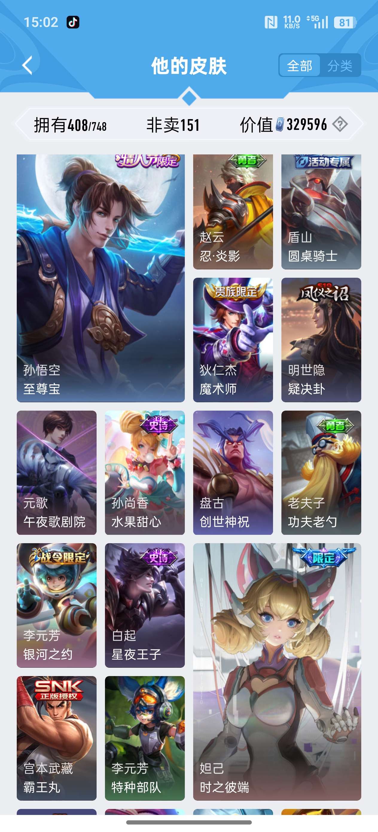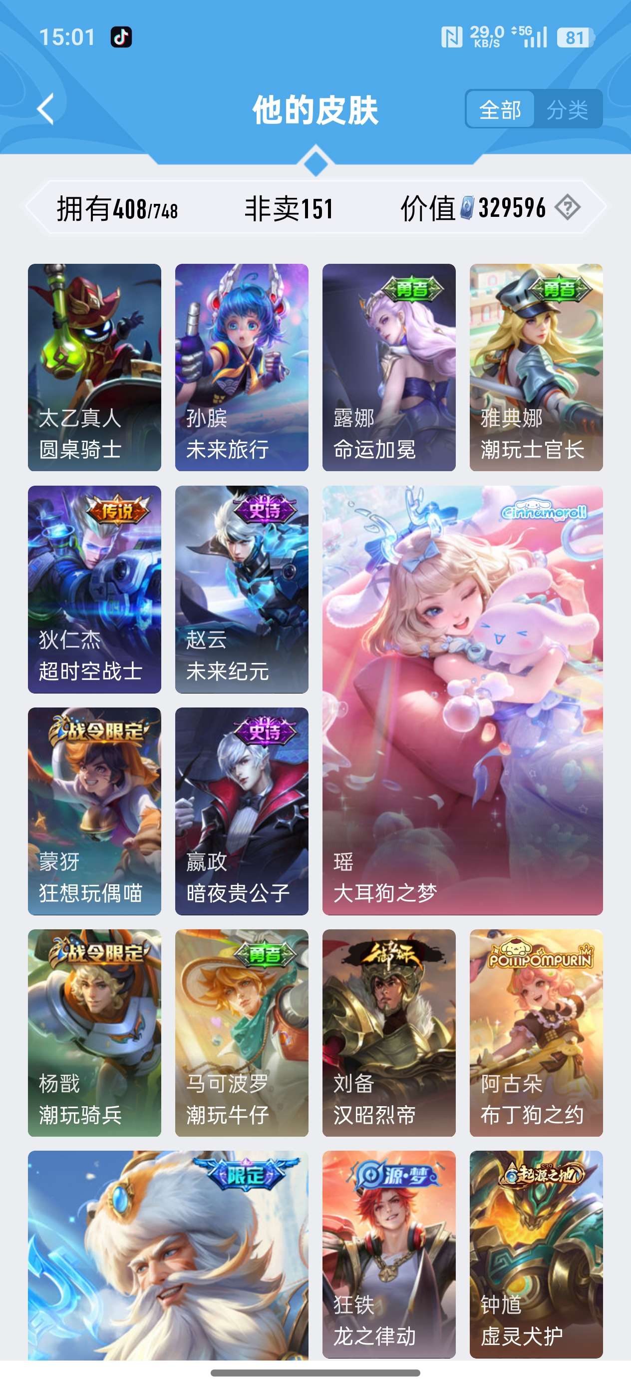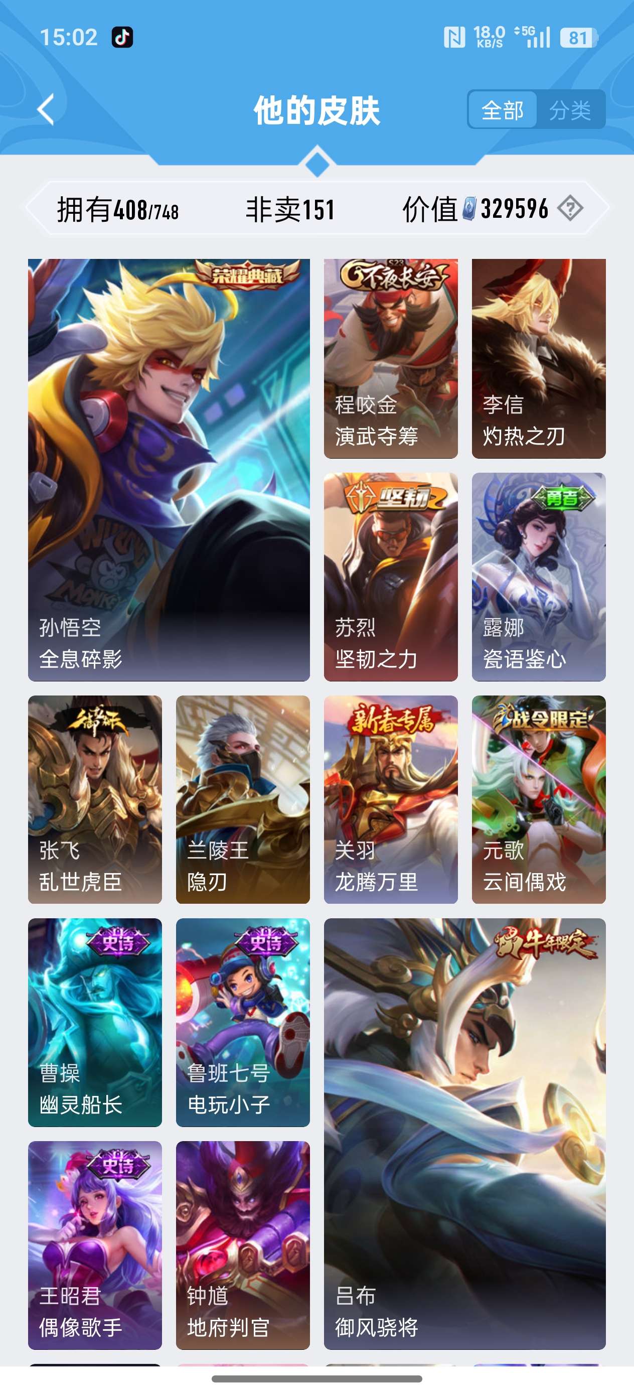 安卓QQ/荣耀王者/408皮肤/126英雄/3典藏/0珍品无双/1无双/2珍品传说/20传说/119