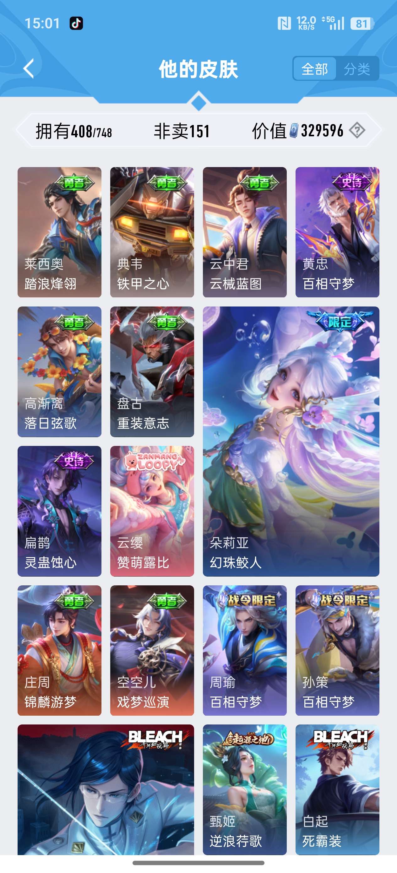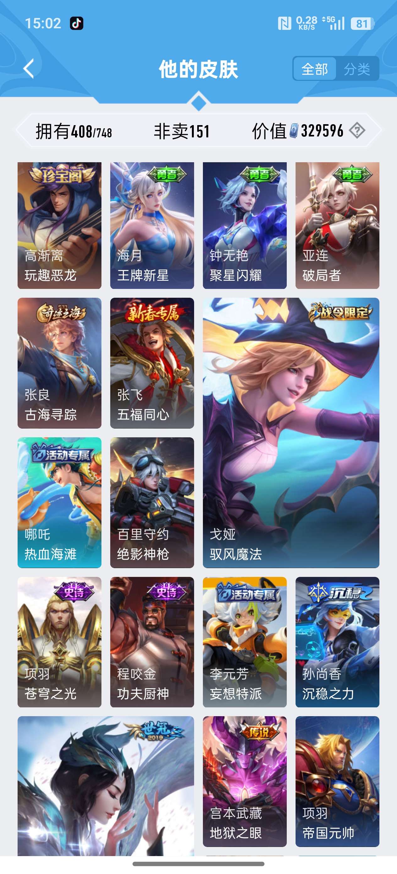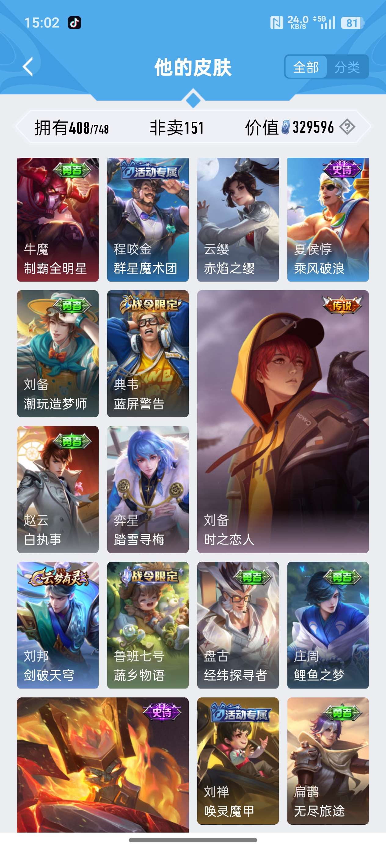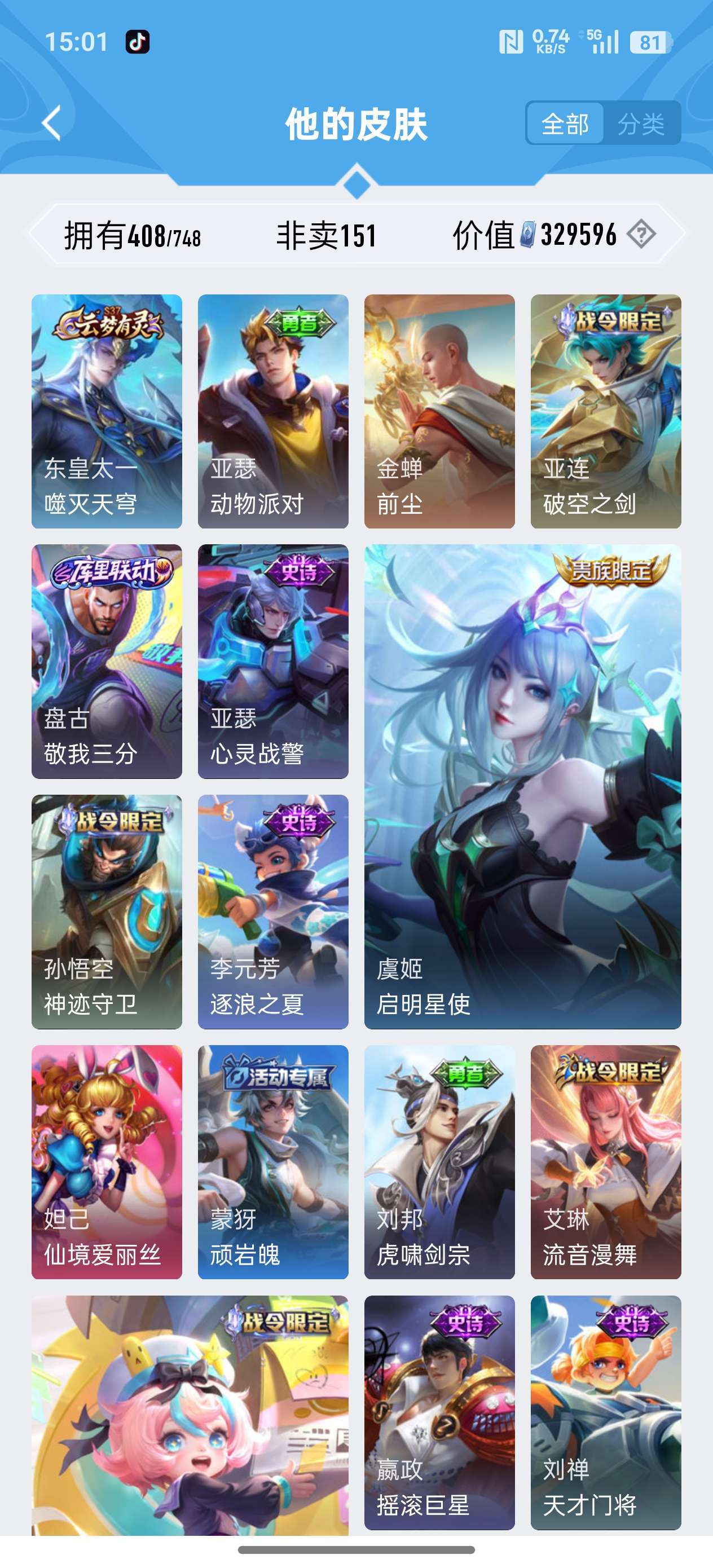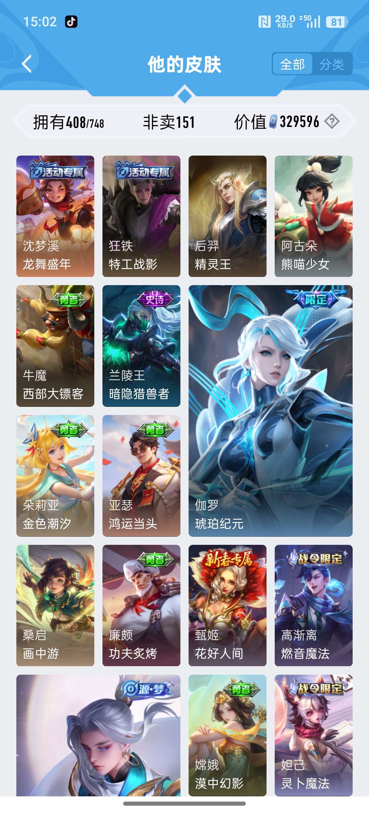 安卓QQ/荣耀王者/408皮肤/126英雄/3典藏/0珍品无双/1无双/2珍品传说/20传说/119