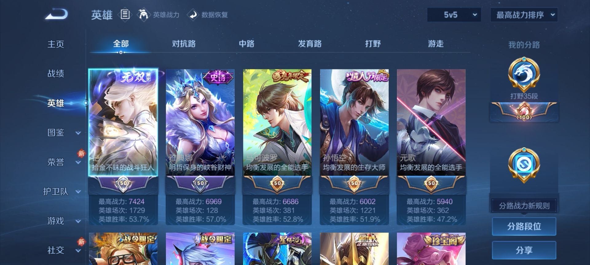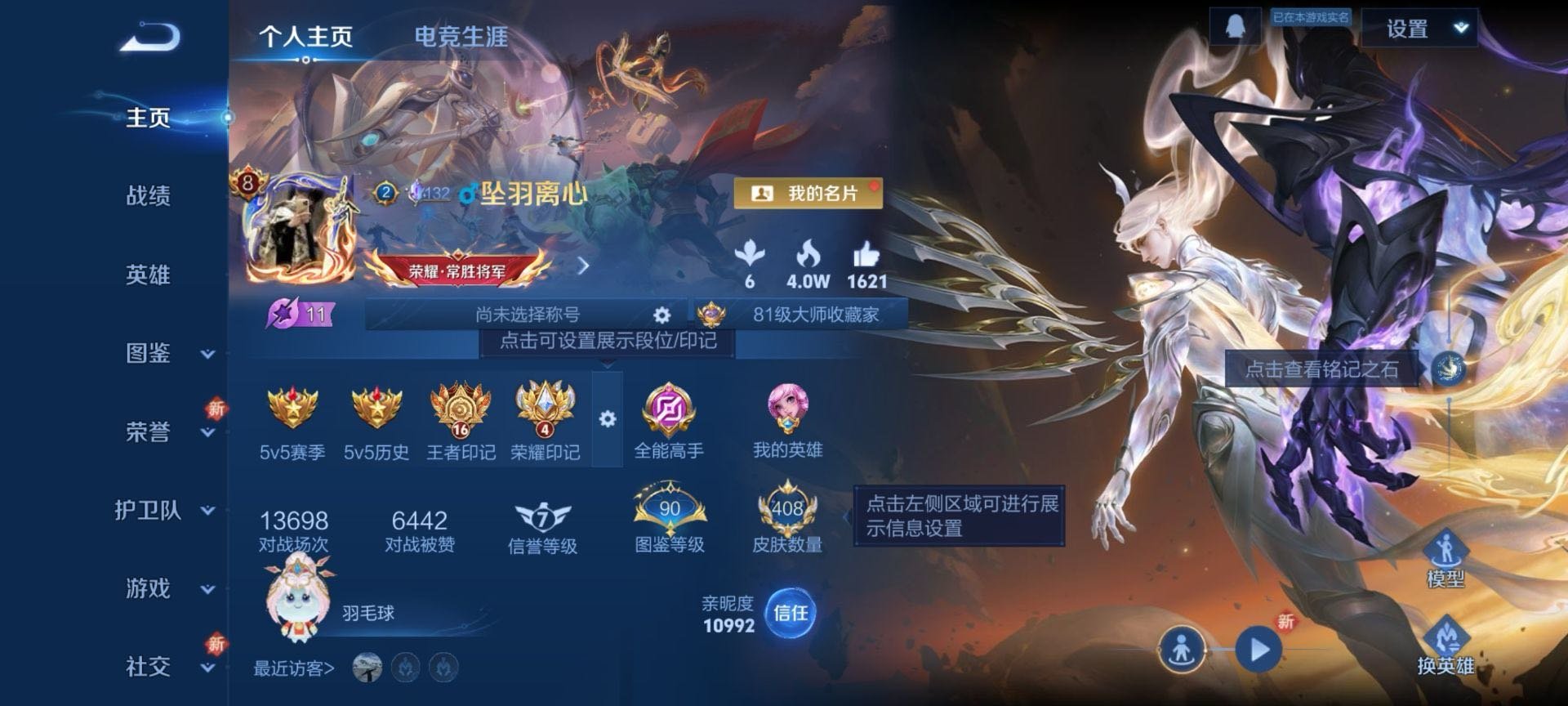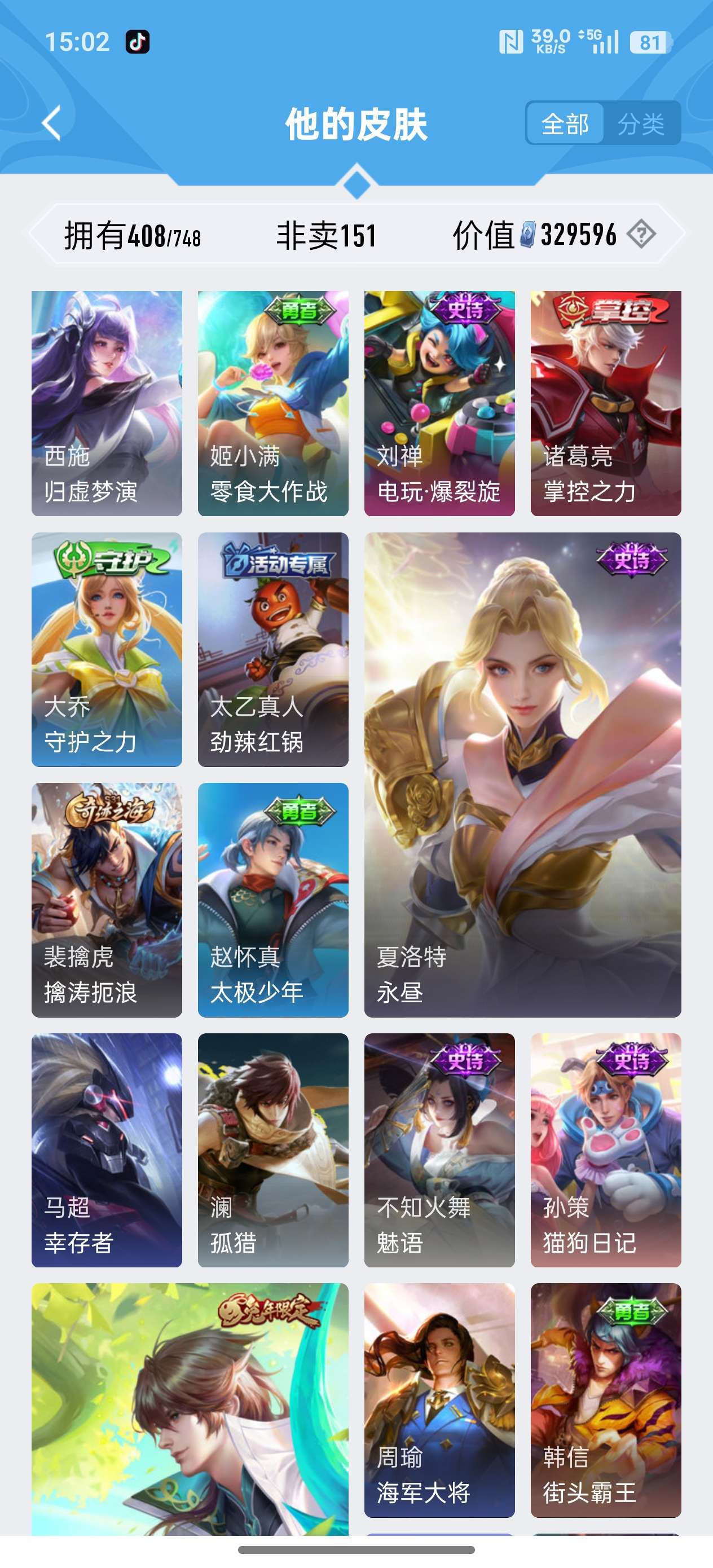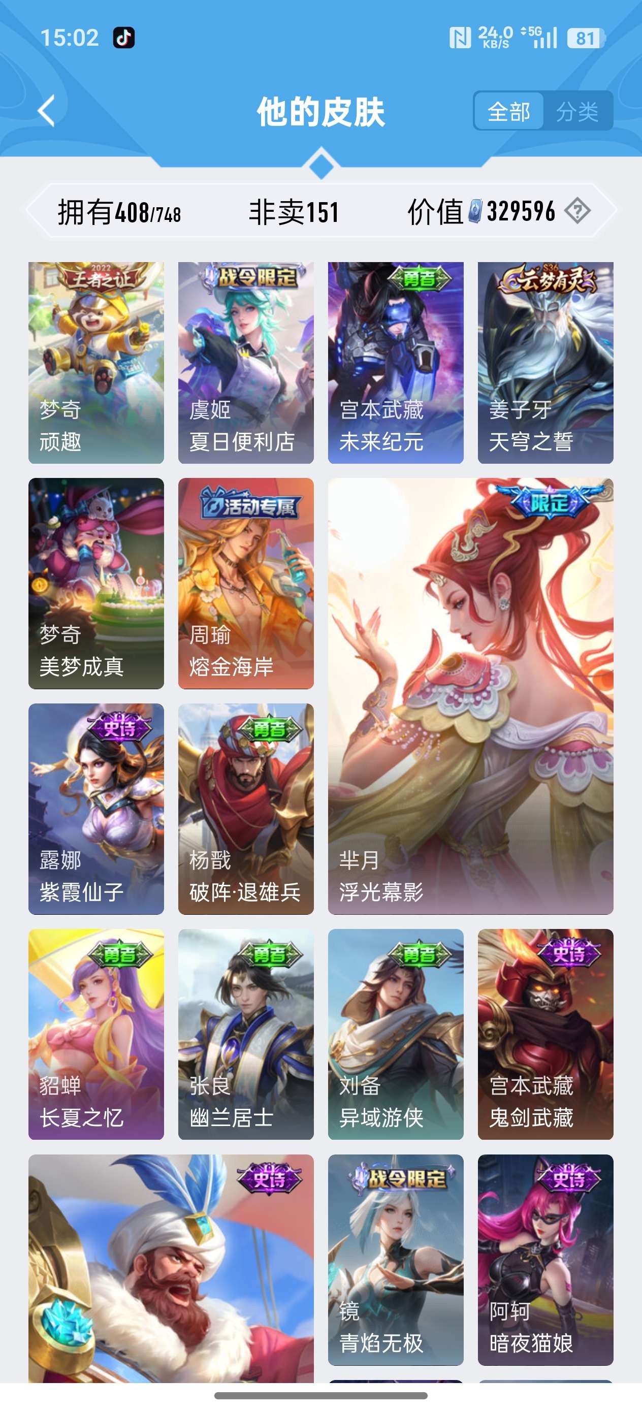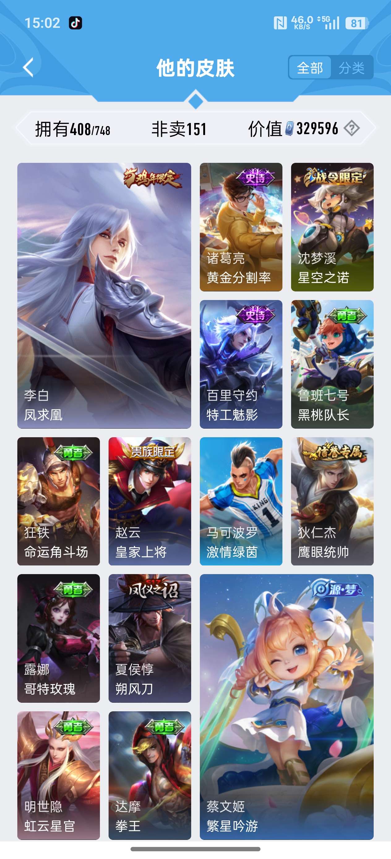 安卓QQ/荣耀王者/408皮肤/126英雄/3典藏/0珍品无双/1无双/2珍品传说/20传说/119