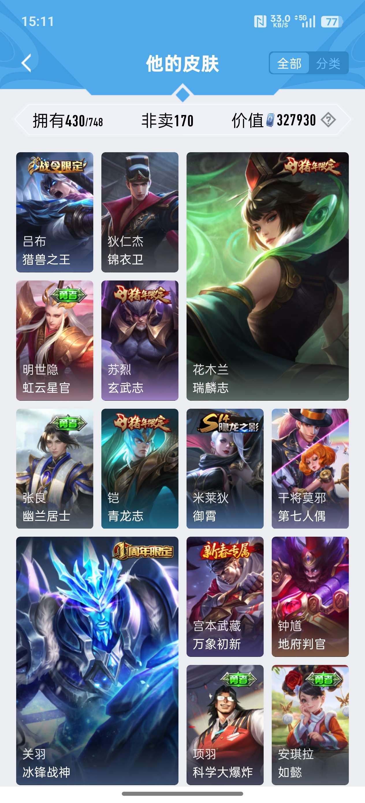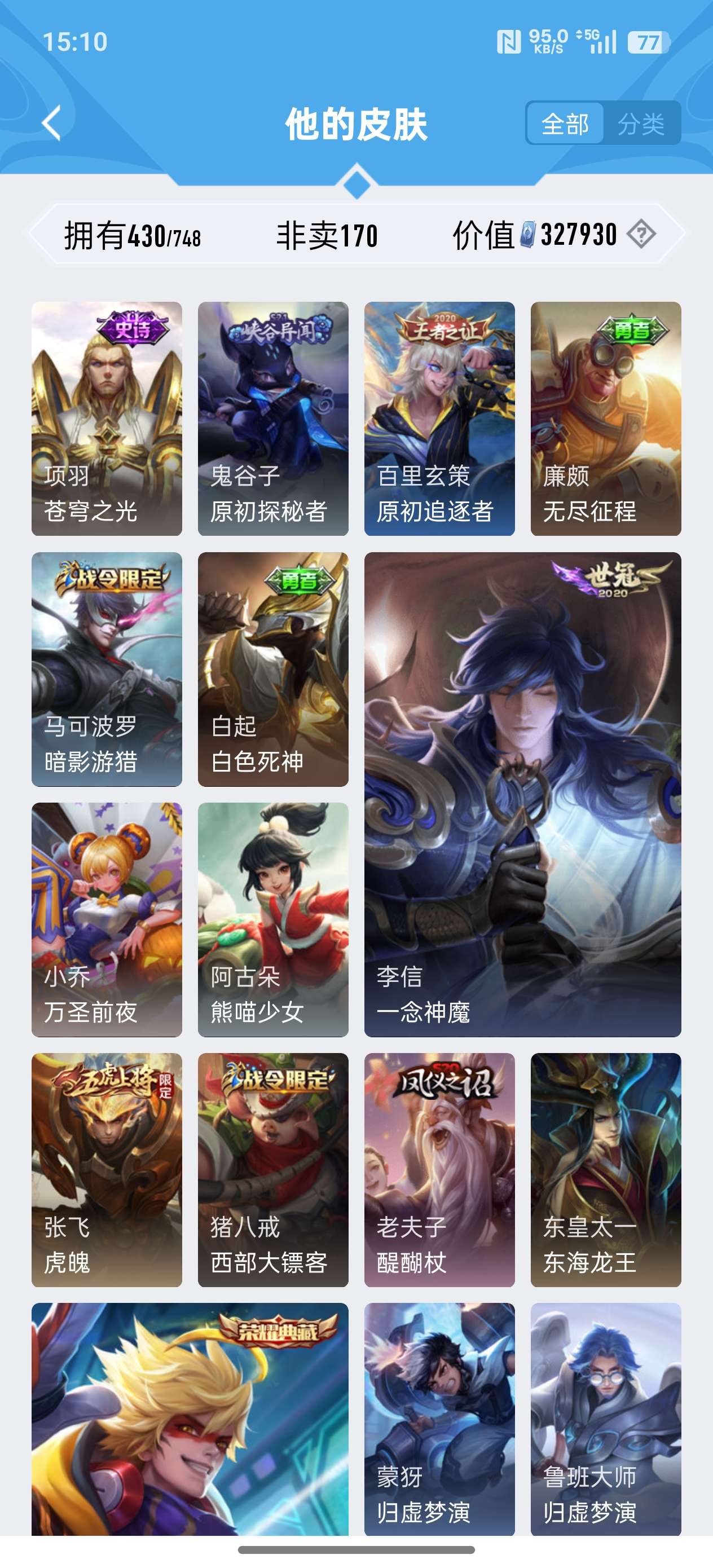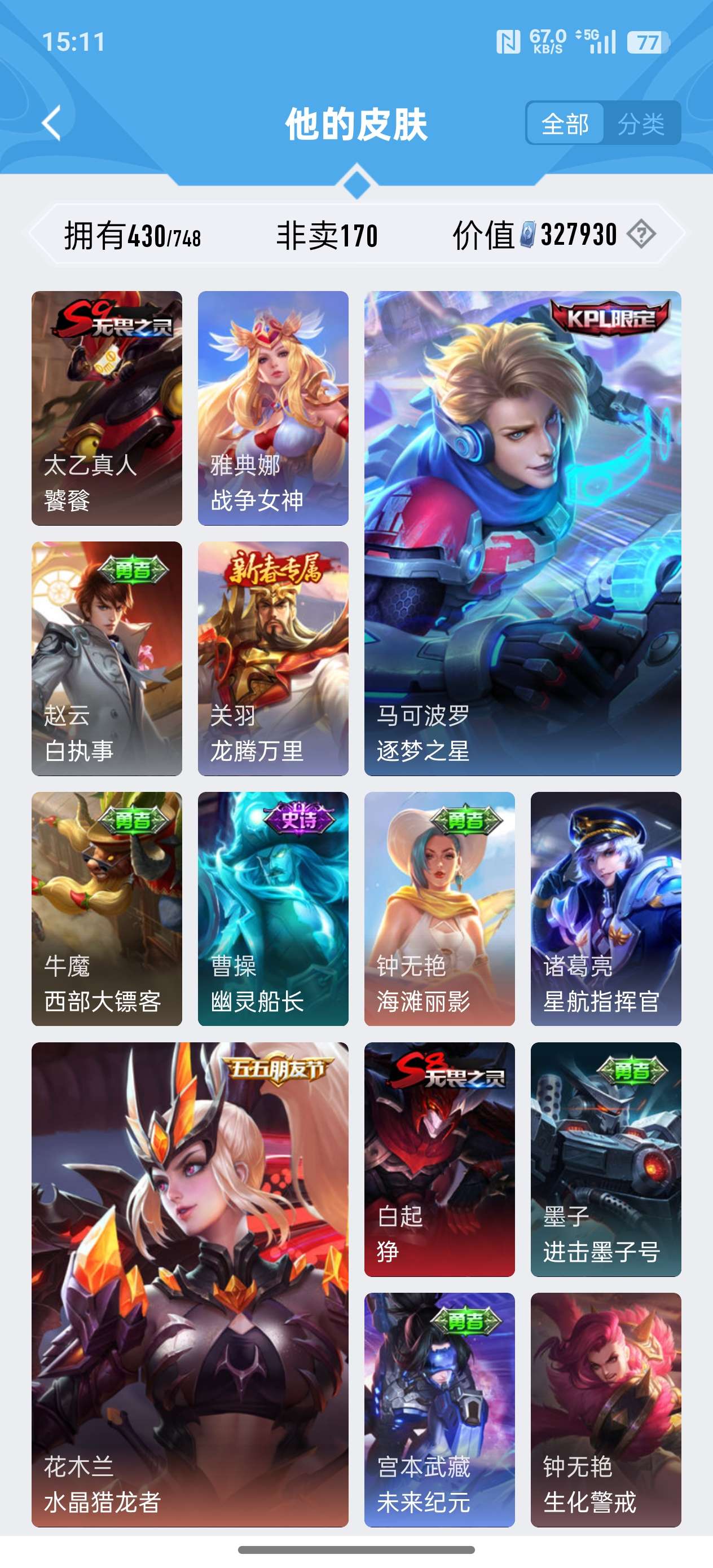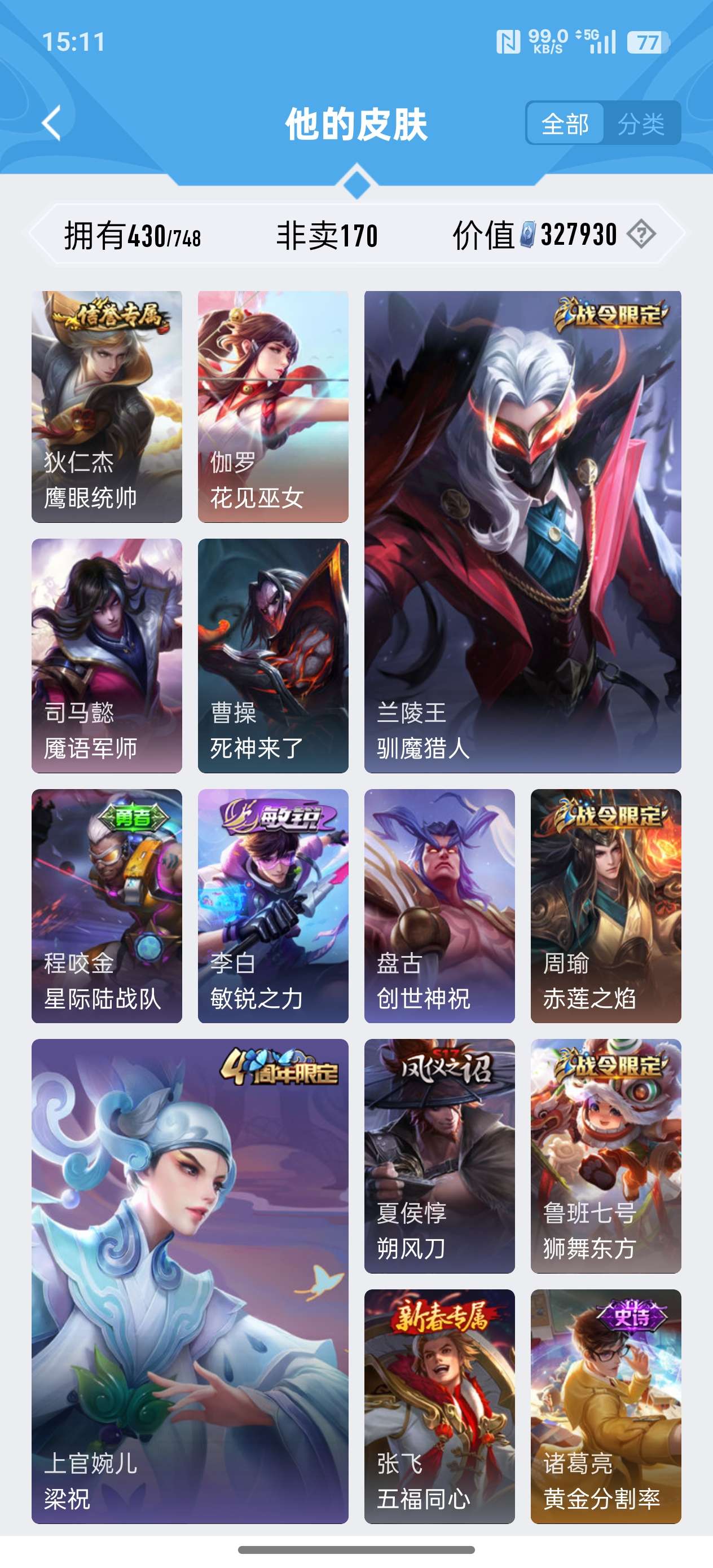 苹果QQ/荣耀王者/430皮肤/124英雄/2典藏/0珍品无双/0无双/3珍品传说/24传说/134