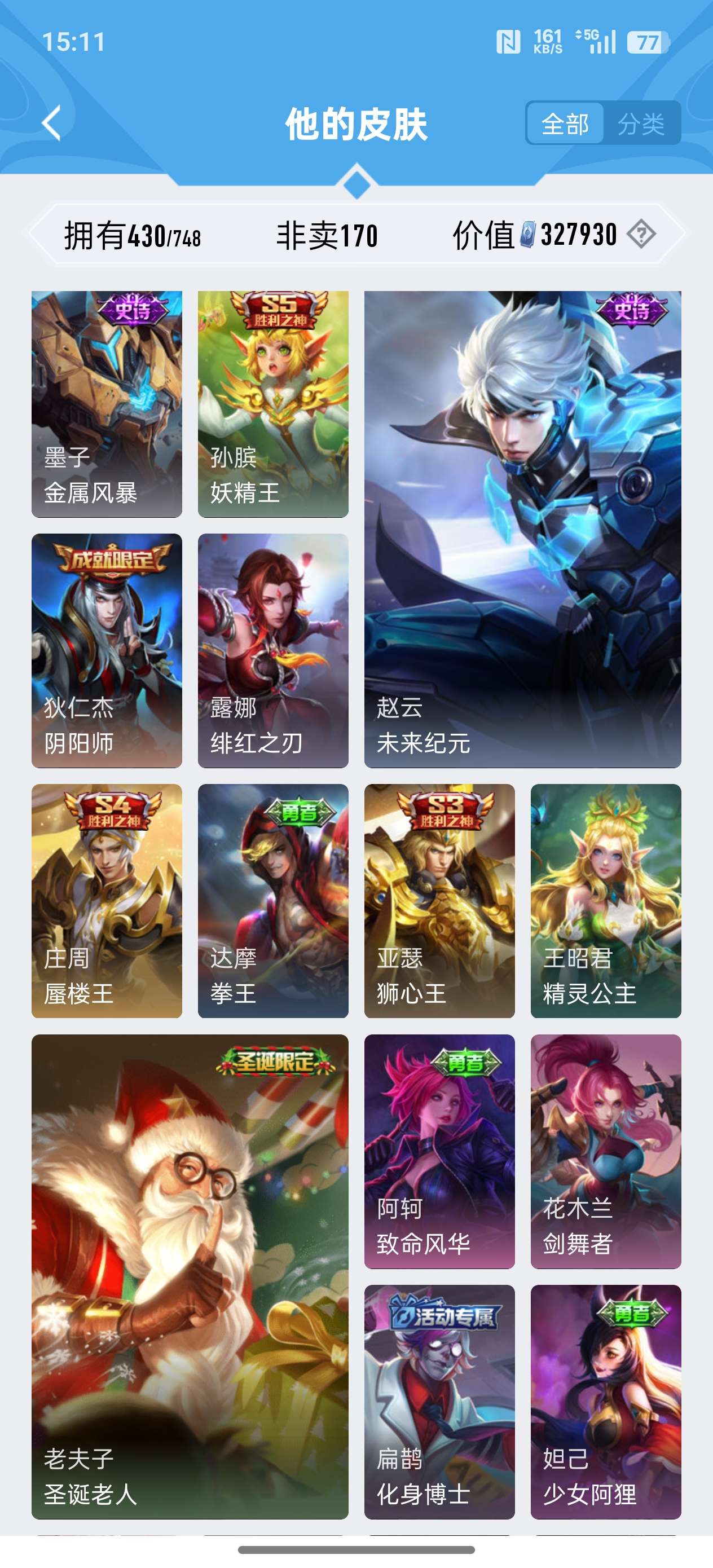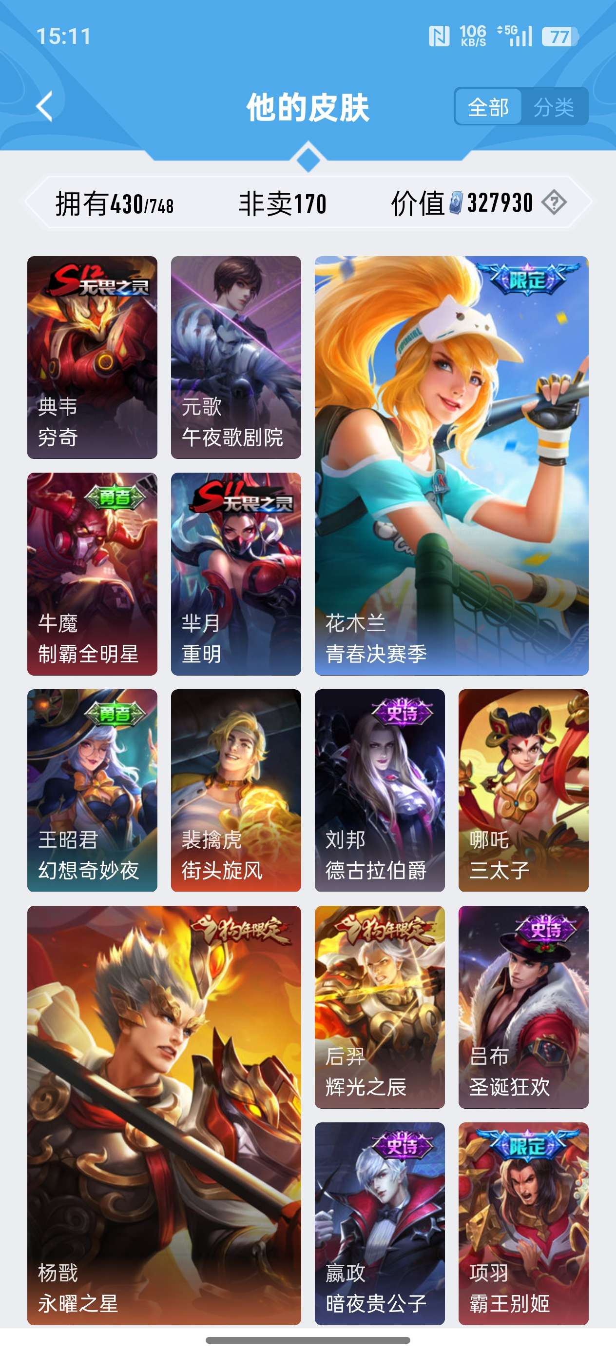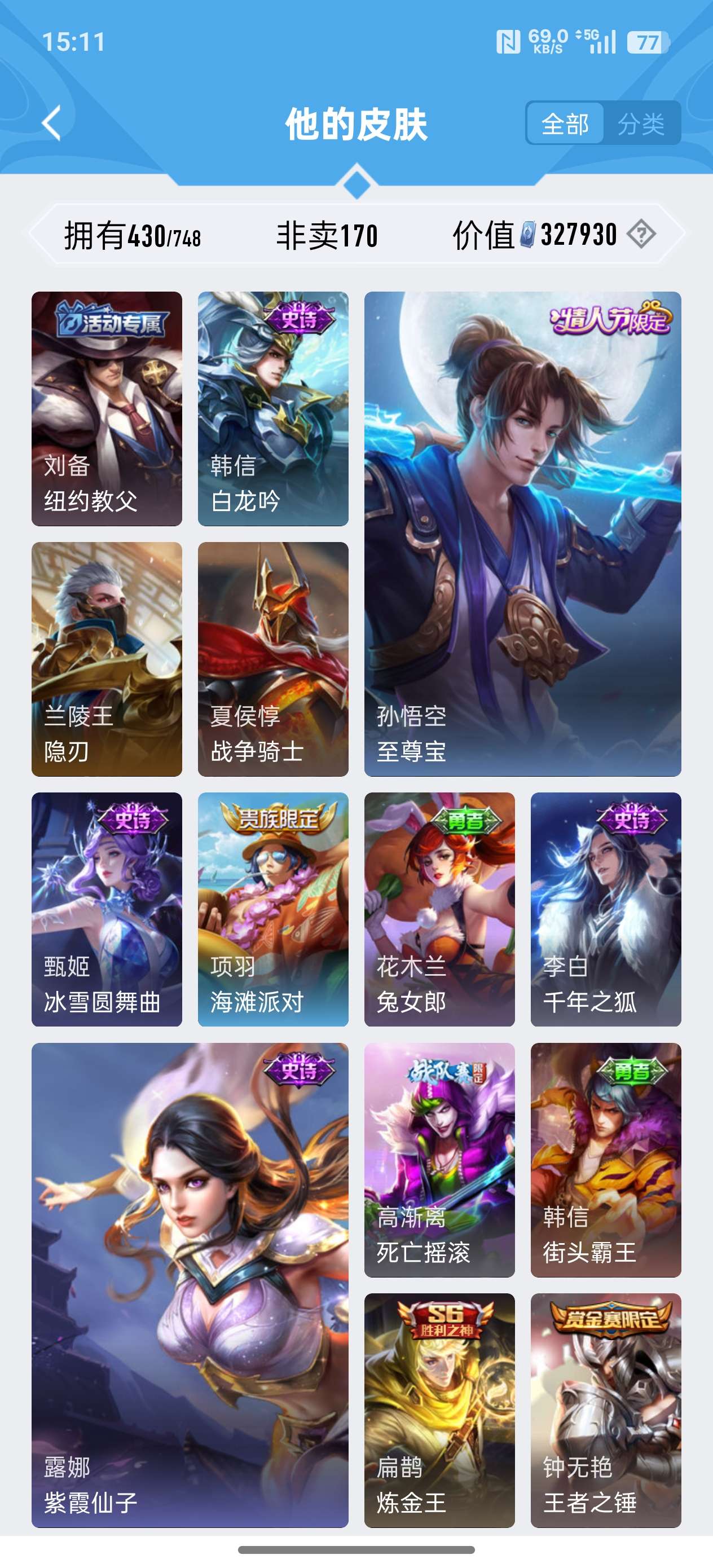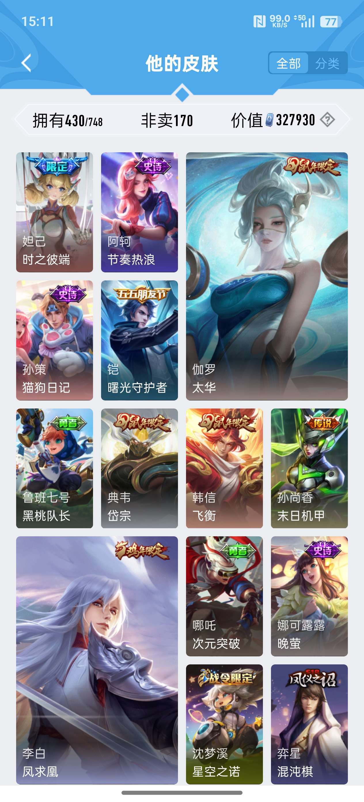 苹果QQ/荣耀王者/430皮肤/124英雄/2典藏/0珍品无双/0无双/3珍品传说/24传说/134