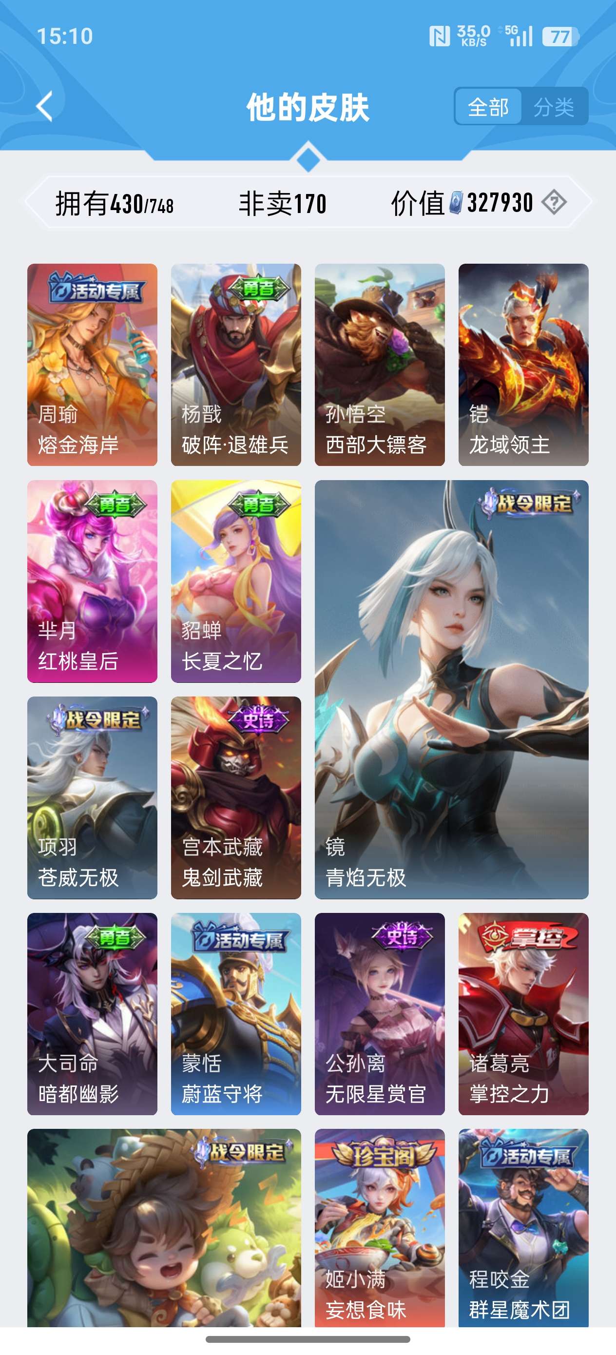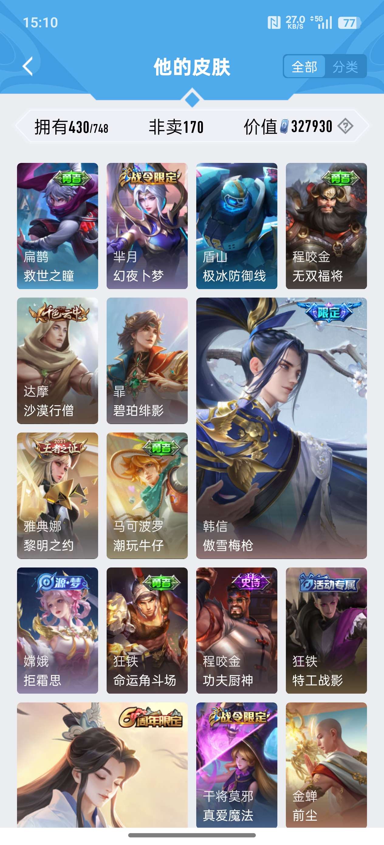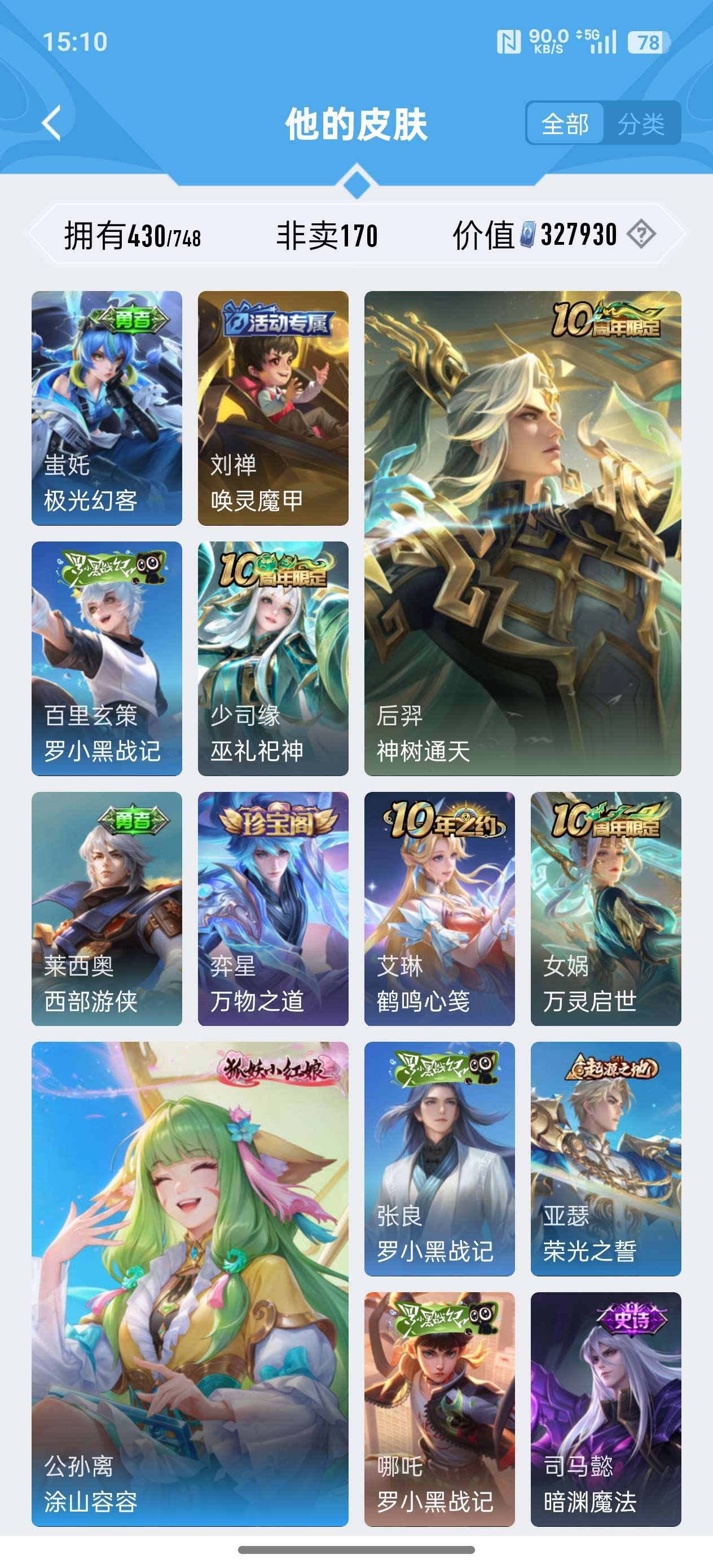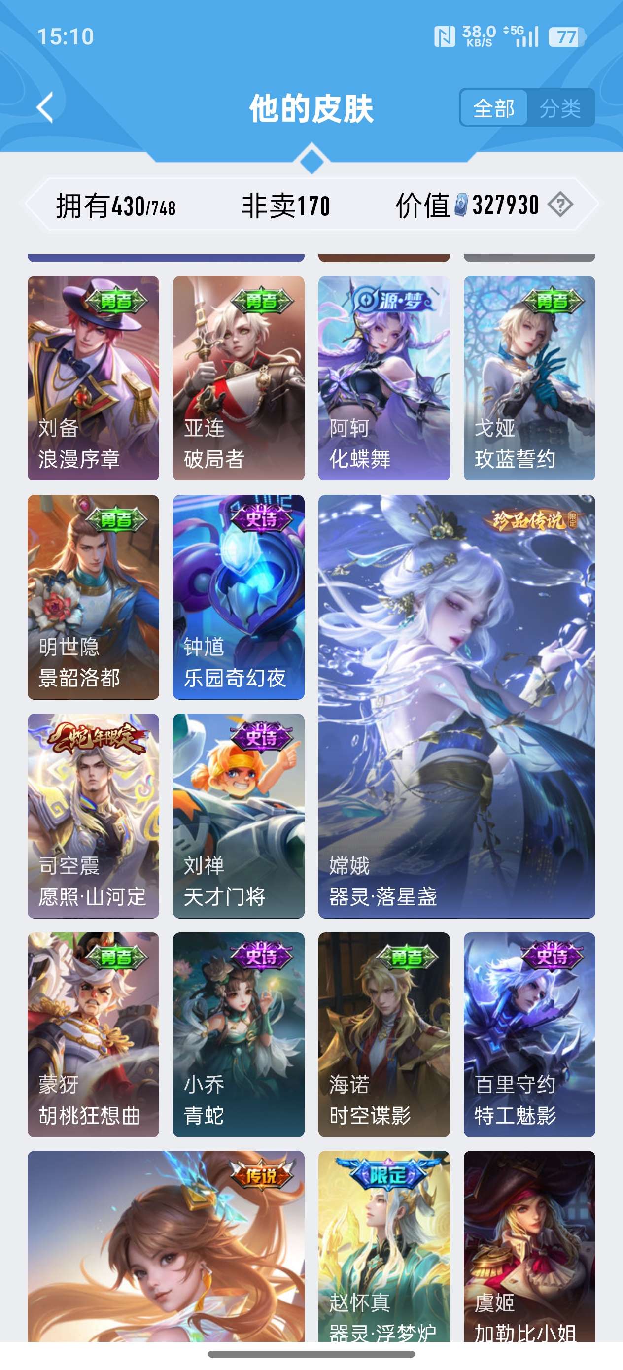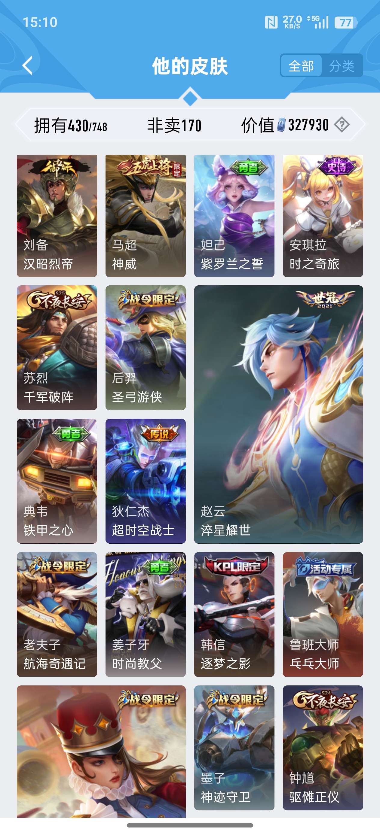 苹果QQ/荣耀王者/430皮肤/124英雄/2典藏/0珍品无双/0无双/3珍品传说/24传说/134