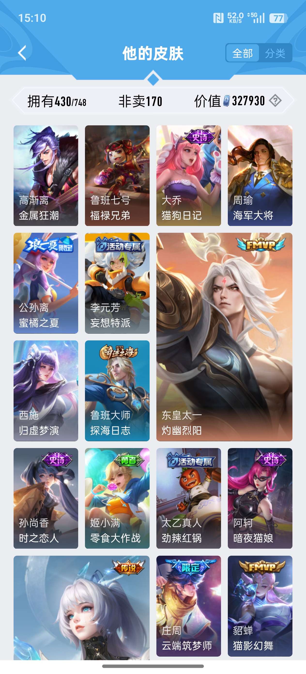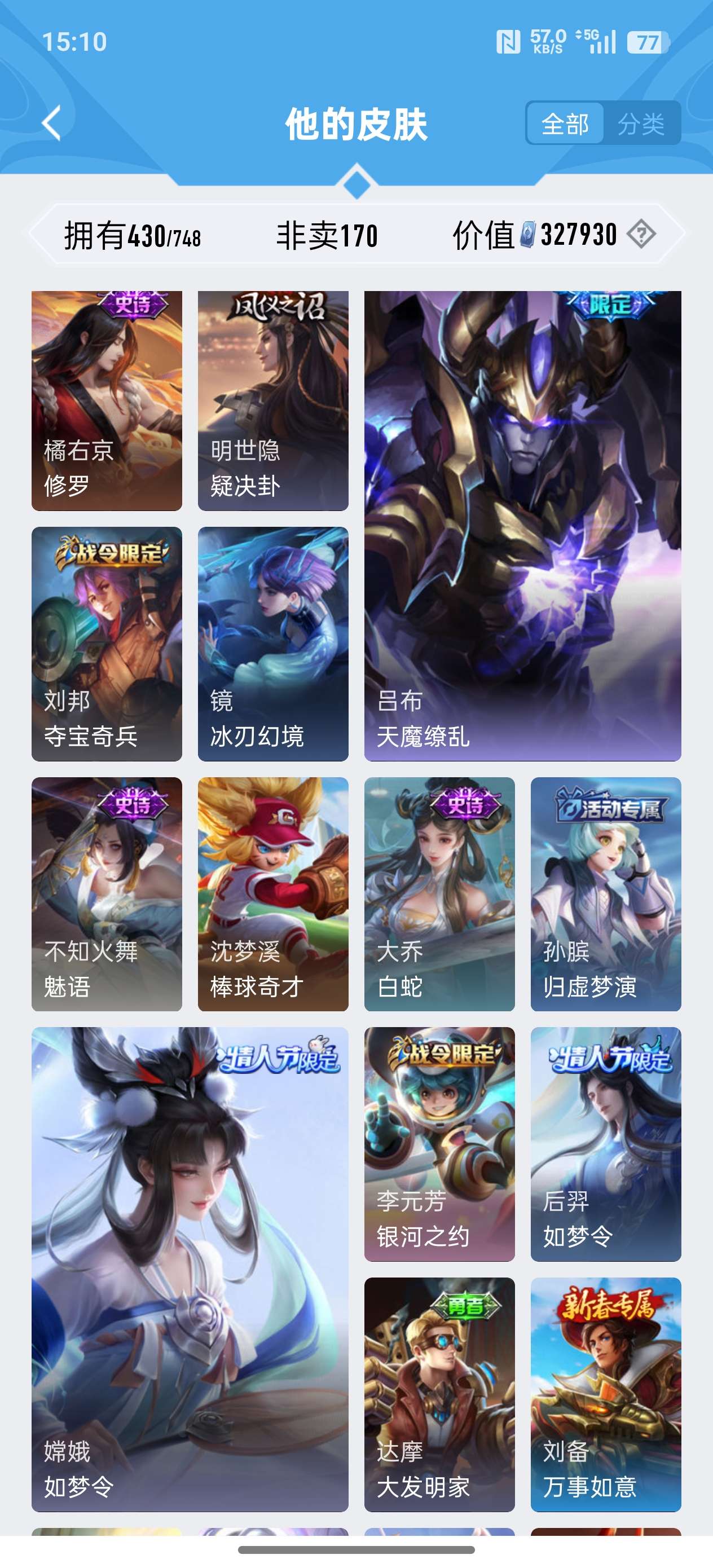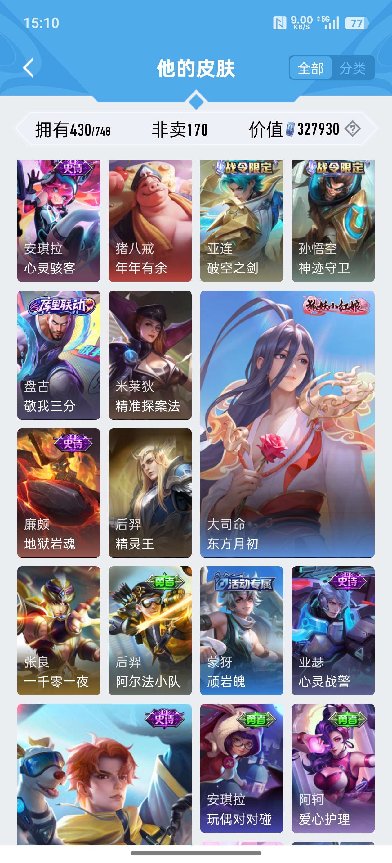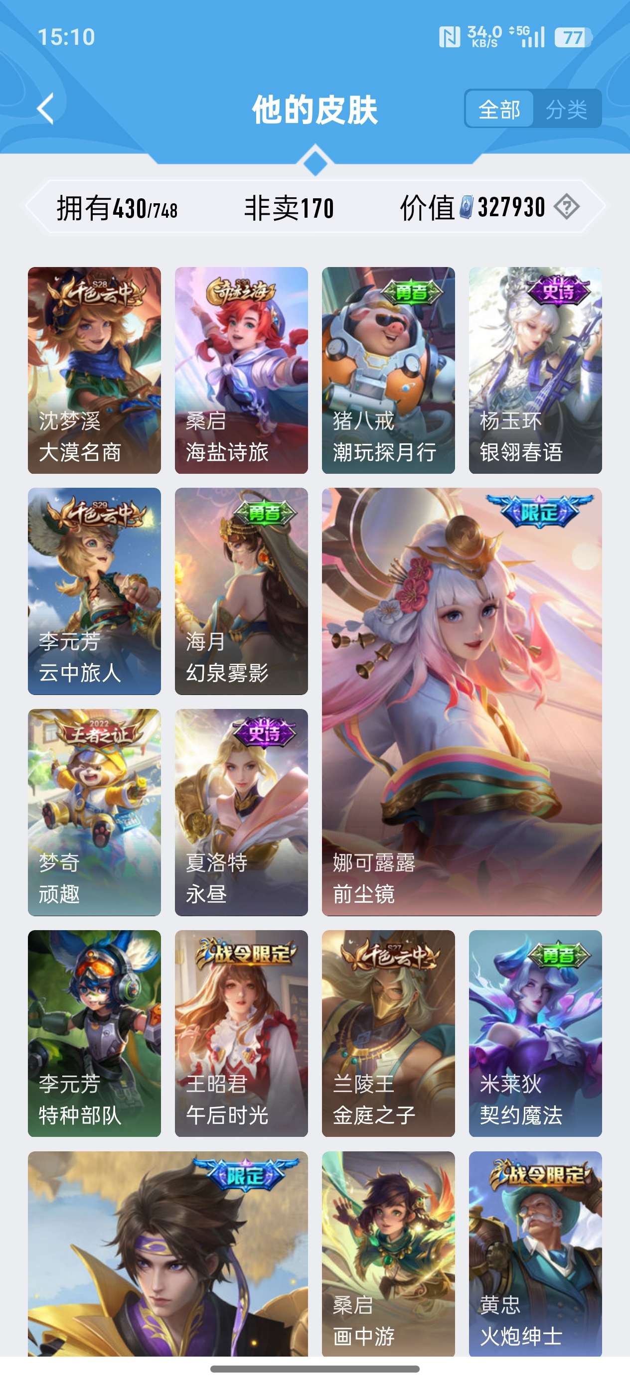 苹果QQ/荣耀王者/430皮肤/124英雄/2典藏/0珍品无双/0无双/3珍品传说/24传说/134