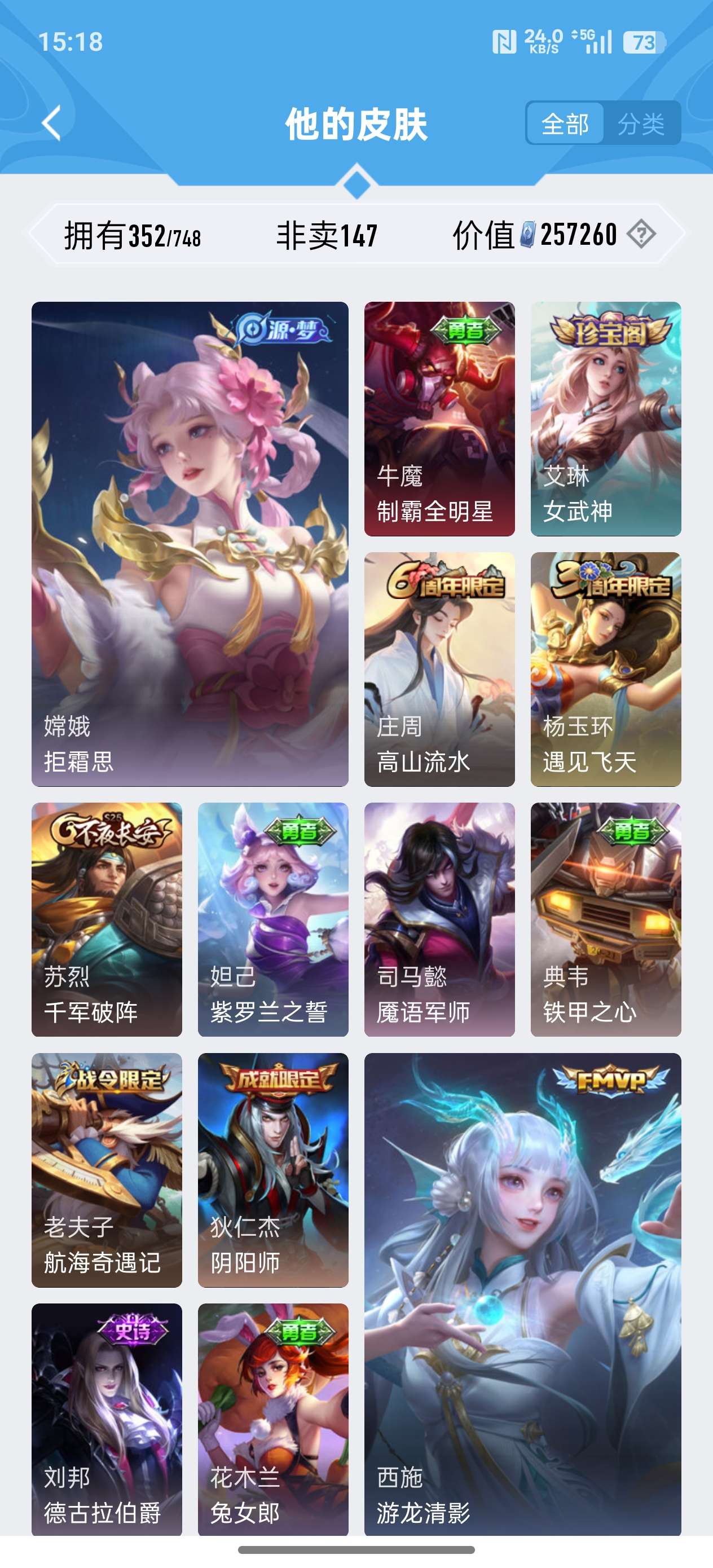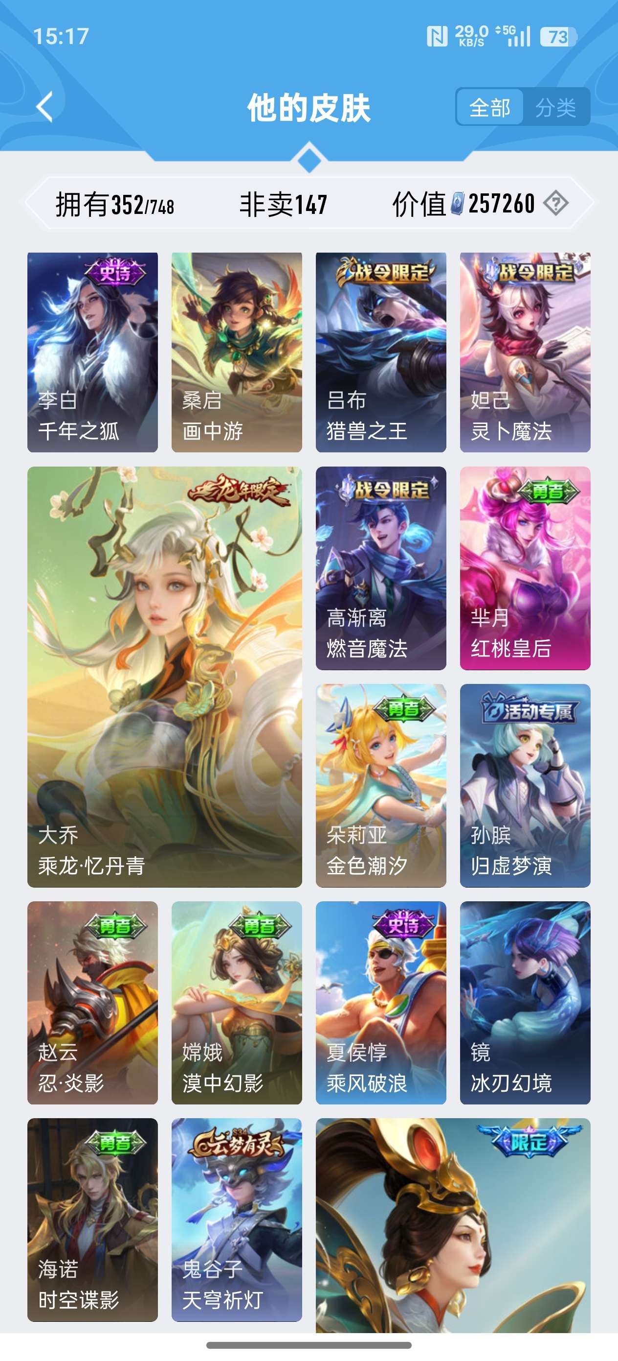 安卓QQ/荣耀王者/352皮肤/126英雄/1典藏/1珍品无双/1无双/7珍品传说/14传说/112