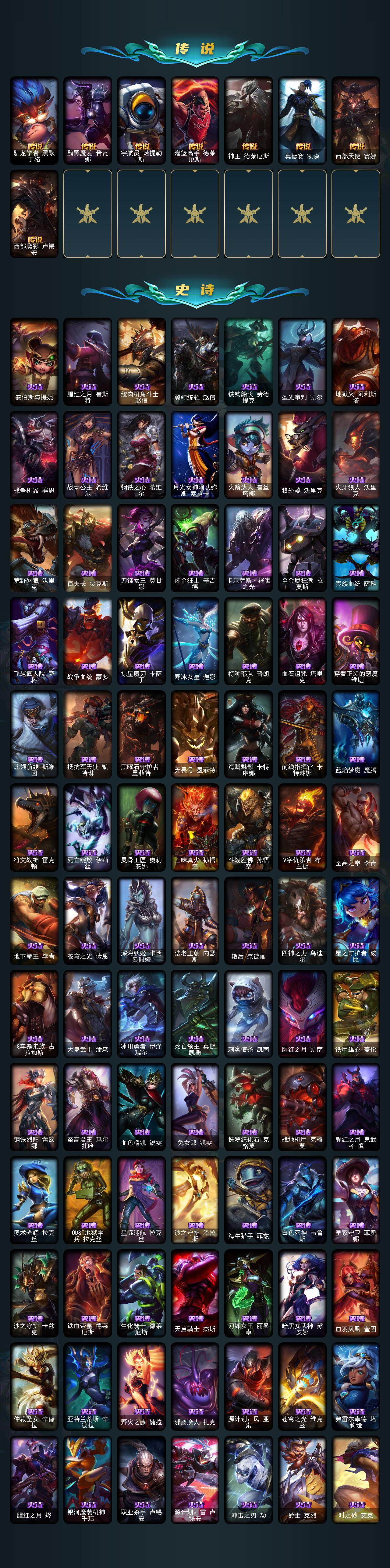 172英雄/364皮肤/1终极/4神话/45限定/28炫彩/36传说/95史诗/白银/