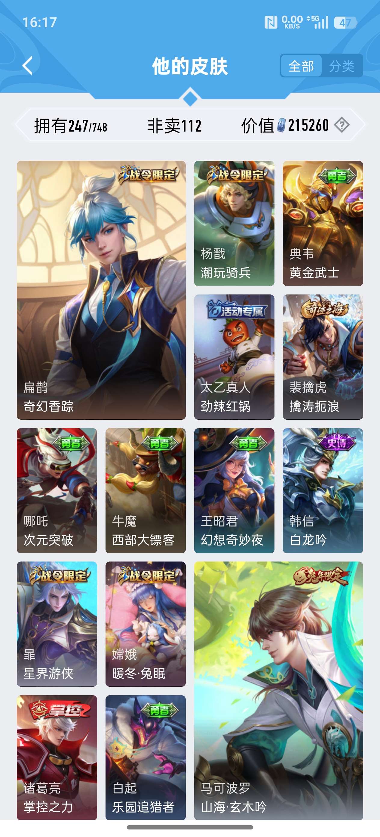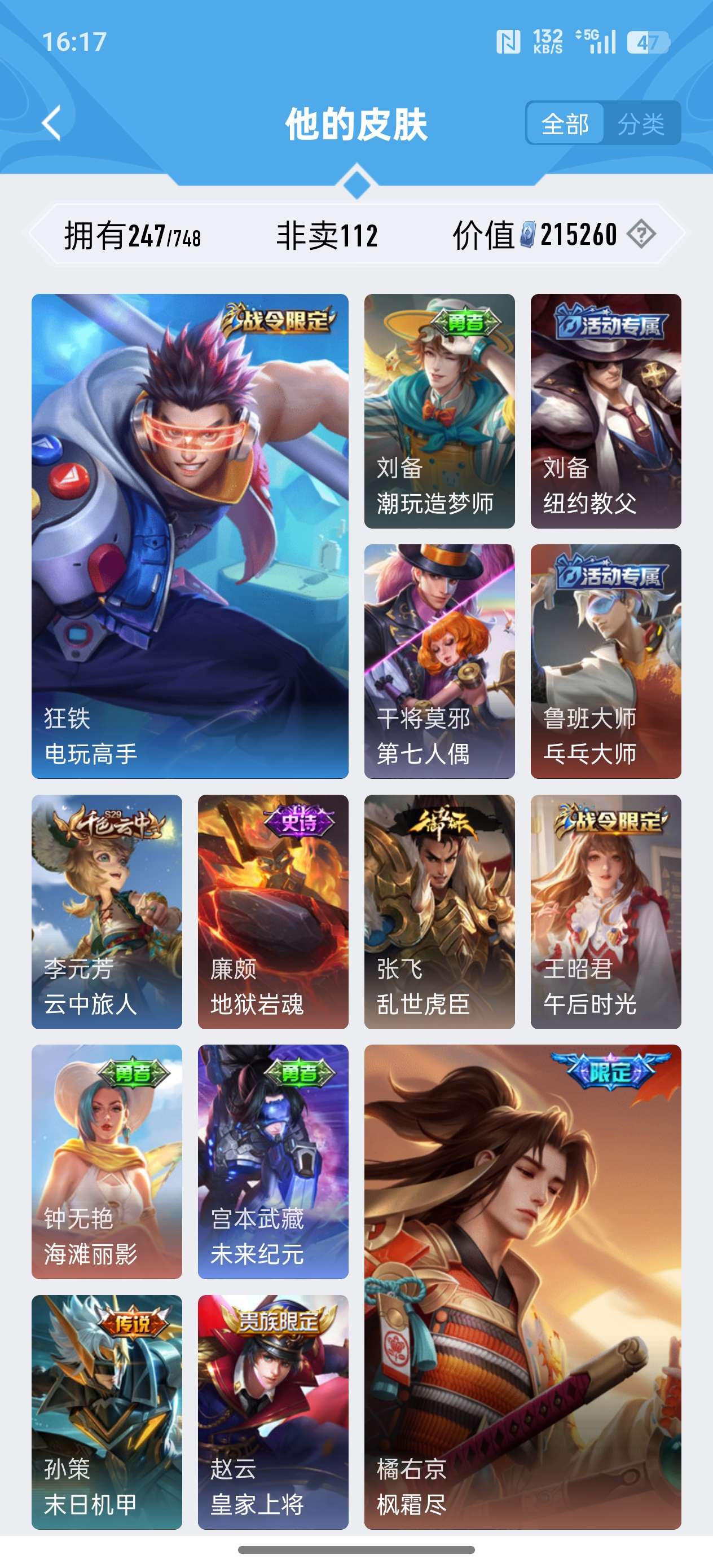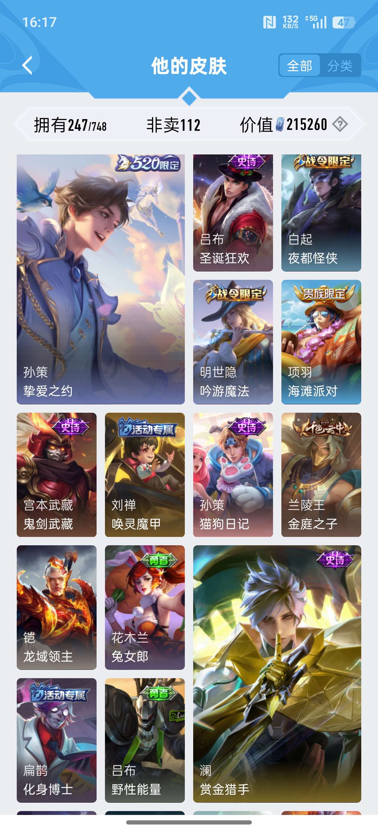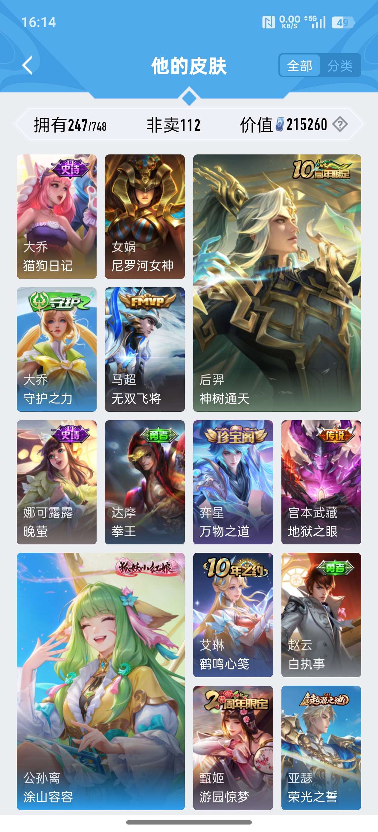 安卓QQ/荣耀王者/247皮肤/127英雄/2典藏/0珍品无双/2无双/1珍品传说/17传说/86史