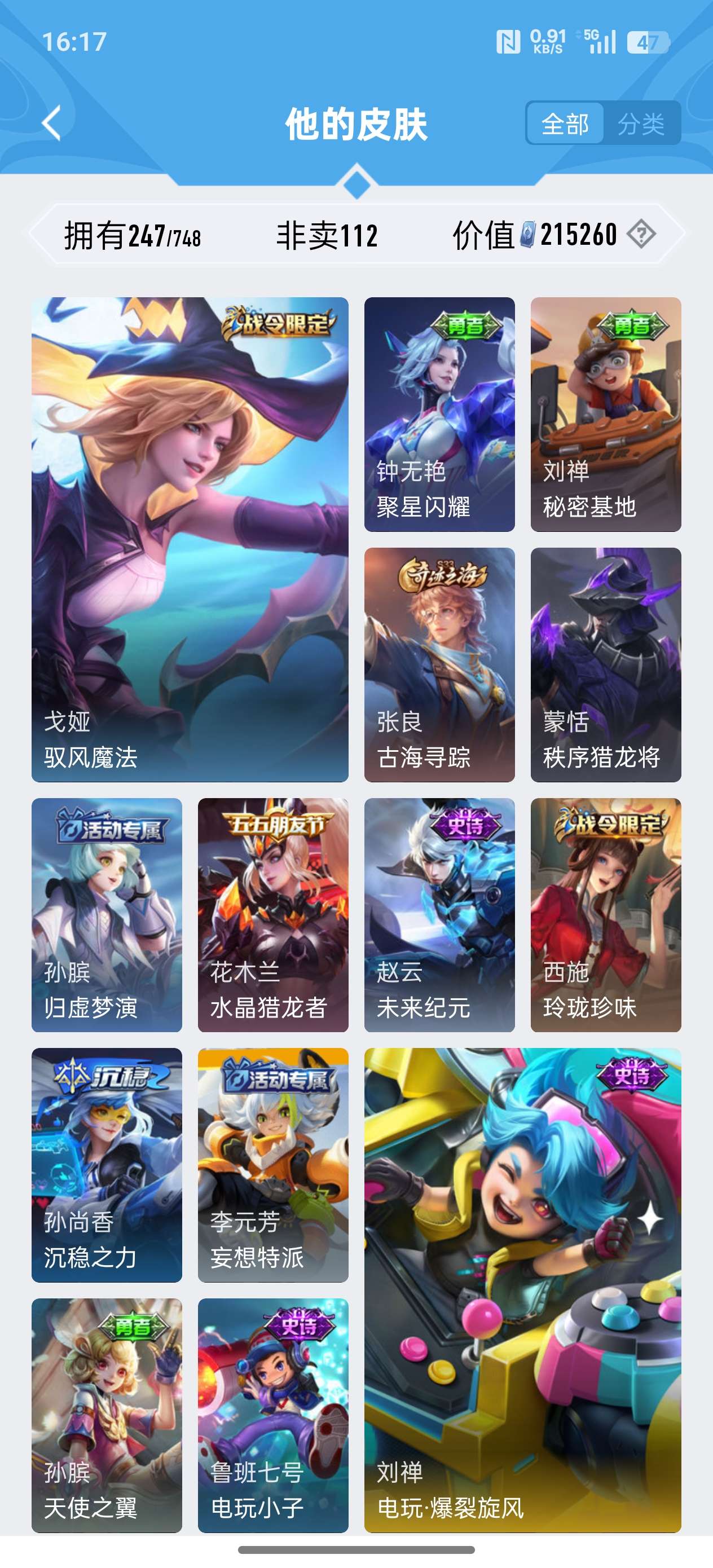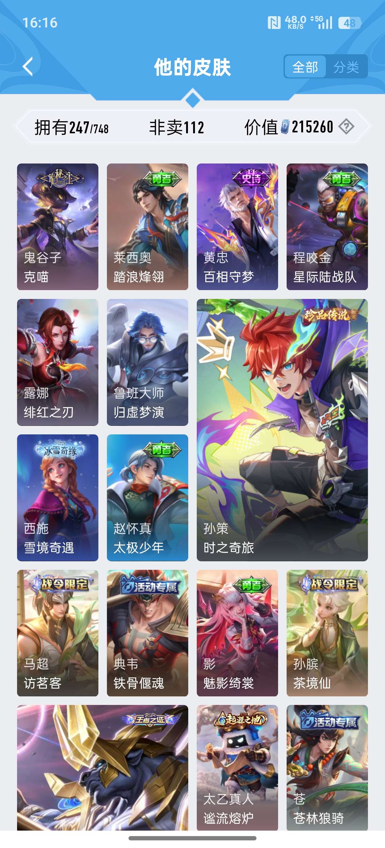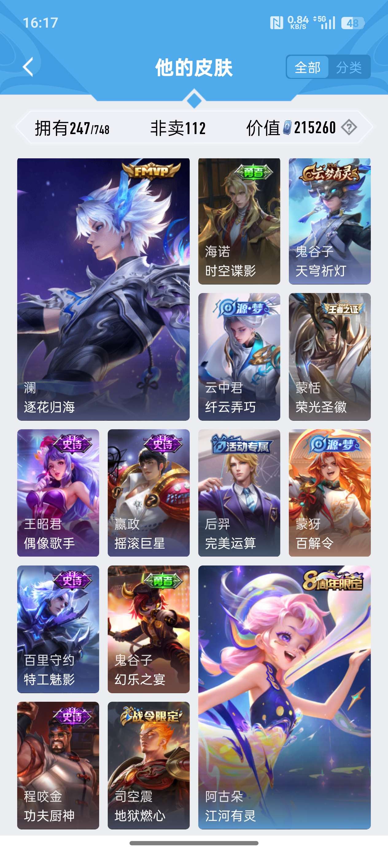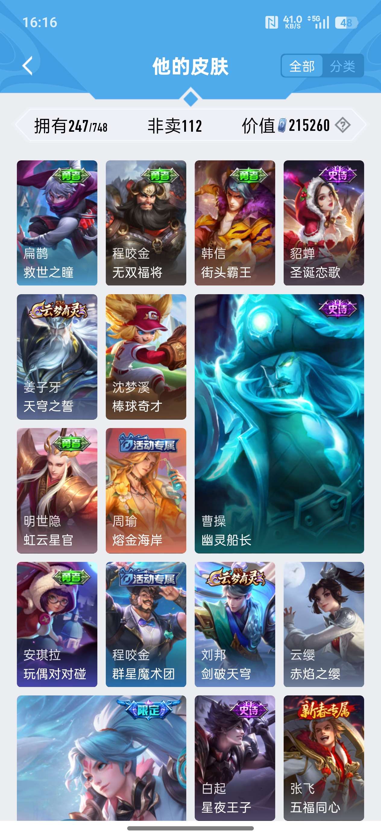 安卓QQ/荣耀王者/247皮肤/127英雄/2典藏/0珍品无双/2无双/1珍品传说/17传说/86史